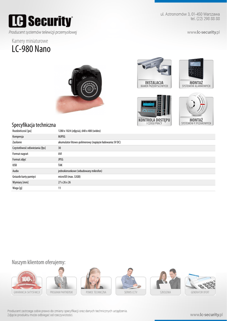 Kamery miniaturowe LC-980 Nano INSTALACJA KAMER PRZEMYSŁOWYCH KONTROLA DOSTĘPU I CZASU PRACY Specyfikacja techniczna Rozdzielczość [px] 1280 x 1024 (zdjęcia), 640 x 480 (wideo) Kompresja MJPEG Zasilanie akumulator litowo-polimerowy (napięcie ładowania 5V DC) Częstotliwość odświeżania [fps] 30 Format nagrań AVI Format zdjęć JPEG USB TAK Audio jednokierunkowe (wbudowany mikrofon) Gniazdo karty pamięci microSD (max. 32GB) Wymiary [mm] 27 x 26 x 26 Waga [g] 11 MONTAŻ SYSTEMÓW ALARMOWYCH MONTAŻ SYSTEMÓW P.POŻAROWYCH Naszym klientom oferujemy: GWARANCJA SATYSFAKCJI PROGRAM PARTNERSKI POMOC TECHNICZNA SERWIS CCTV SZKOLENIA GENERATOR OFERT