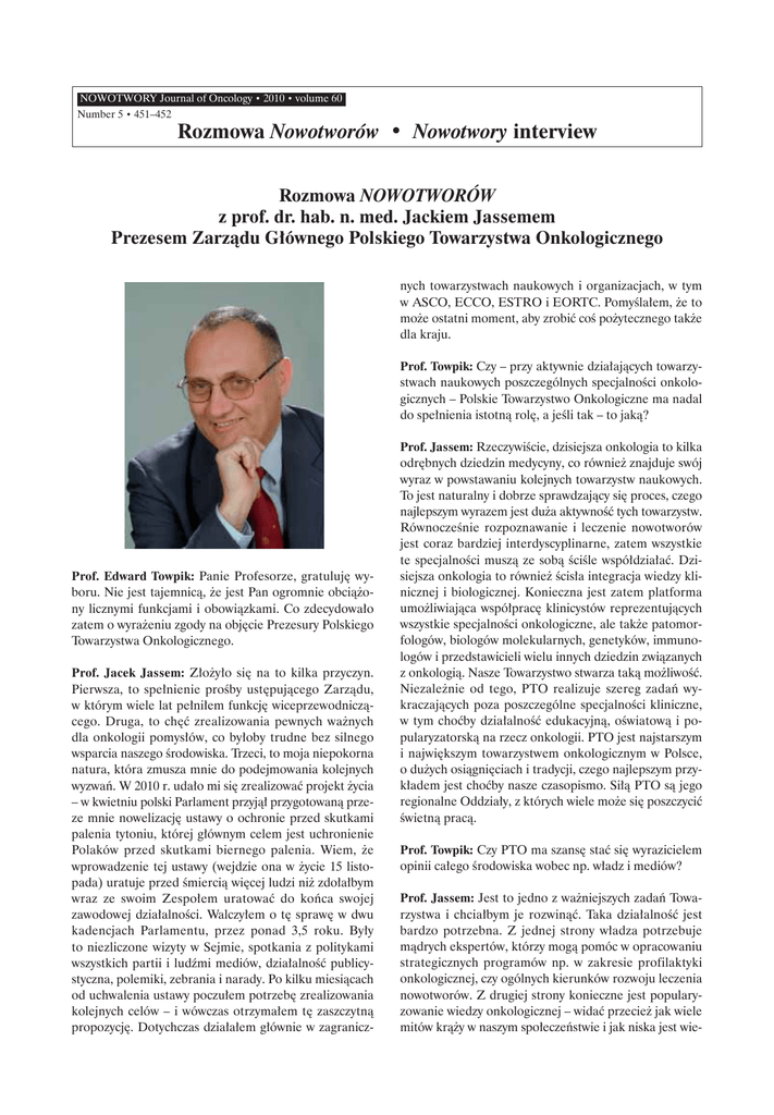 NOWOTWORY Journal of Oncology • 2010 • volume 60 Number 5 • 451–452 Rozmowa Nowotworów • Nowotwory interview Rozmowa NOWOTWORÓW z prof. dr. hab. n. med. Jackiem Jassemem Prezesem Zarządu Głównego Polskiego Towarzystwa Onkologicznego nych towarzystwach naukowych i organizacjach, w tym w ASCO, ECCO, ESTRO i EORTC. Pomyślałem, że to może ostatni moment, aby zrobić coś pożytecznego także dla kraju. Prof. Towpik: Czy – przy aktywnie działających towarzystwach naukowych poszczególnych specjalności onkologicznych – Polskie Towarzystwo Onkologiczne ma nadal do spełnienia istotną rolę, a jeśli tak – to jaką? Prof. Edward Towpik: Panie Profesorze, gratuluję wyboru. Nie jest tajemnicą, że jest Pan ogromnie obciążony licznymi funkcjami i obowiązkami. Co zdecydowało zatem o wyrażeniu zgody na objęcie Prezesury Polskiego Towarzystwa Onkologicznego. Prof. Jacek Jassem: Złożyło się na to kilka przyczyn. Pierwsza, to spełnienie prośby ustępującego Zarządu, w którym wiele lat pełniłem funkcję wiceprzewodniczącego. Druga, to chęć zrealizowania pewnych ważnych dla onkologii pomysłów, co byłoby trudne bez silnego wsparcia naszego środowiska. Trzeci, to moja niepokorna natura, która zmusza mnie do podejmowania kolejnych wyzwań. W 2010 r. udało mi się zrealizować projekt życia – w kwietniu polski Parlament przyjął przygotowaną przeze mnie nowelizację ustawy o ochronie przed skutkami palenia tytoniu, której głównym celem jest uchronienie Polaków przed skutkami biernego palenia. Wiem, że wprowadzenie tej ustawy (wejdzie ona w życie 15 listopada) uratuje przed śmiercią więcej ludzi niż zdołałbym wraz ze swoim Zespołem uratować do końca swojej zawodowej działalności. Walczyłem o tę sprawę w dwu kadencjach Parlamentu, przez ponad 3,5 roku. Były to niezliczone wizyty w Sejmie, spotkania z politykami wszystkich partii i ludźmi mediów, działalność publicystyczna, polemiki, zebrania i narady. Po kilku miesiącach od uchwalenia ustawy poczułem potrzebę zrealizowania kolejnych celów – i wówczas otrzymałem tę zaszczytną propozycję. Dotychczas działałem głównie w zagranicz- Prof. Jassem: Rzeczywiście, dzisiejsza onkologia to kilka odrębnych dziedzin medycyny, co również znajduje swój wyraz w powstawaniu kolejnych towarzystw naukowych. To jest naturalny i dobrze sprawdzający się proces, czego najlepszym wyrazem jest duża aktywność tych towarzystw. Równocześnie rozpoznawanie i leczenie nowotworów jest coraz bardziej interdyscyplinarne, zatem wszystkie te specjalności muszą ze sobą ściśle współdziałać. Dzisiejsza onkologia to również ścisła integracja wiedzy klinicznej i biologicznej. Konieczna jest zatem platforma umożliwiająca współpracę klinicystów reprezentujących wszystkie specjalności onkologiczne, ale także patomorfologów, biologów molekularnych, genetyków, immunologów i przedstawicieli wielu innych dziedzin związanych z onkologią. Nasze Towarzystwo stwarza taką możliwość. Niezależnie od tego, PTO realizuje szereg zadań wykraczających poza poszczególne specjalności kliniczne, w tym choćby działalność edukacyjną, oświatową i popularyzatorską na rzecz onkologii. PTO jest najstarszym i największym towarzystwem onkologicznym w Polsce, o dużych osiągnięciach i tradycji, czego najlepszym przykładem jest choćby nasze czasopismo. Siłą PTO są jego regionalne Oddziały, z których wiele może się poszczycić świetną pracą. Prof. Towpik: Czy PTO ma szansę stać się wyrazicielem opinii całego środowiska wobec np. władz i mediów? Prof. Jassem: Jest to jedno z ważniejszych zadań Towarzystwa i chciałbym je rozwinąć. Taka działalność jest bardzo potrzebna. Z jednej strony władza potrzebuje mądrych ekspertów, którzy mogą pomóc w opracowaniu strategicznych programów np. w zakresie profilaktyki onkologicznej, czy ogólnych kierunków rozwoju leczenia nowotworów. Z drugiej strony konieczne jest popularyzowanie wiedzy onkologicznej – widać przecież jak wiele mitów krąży w naszym społeczeństwie i jak niska jest wie- 452 dza na temat nowotworów. Będę tu chciał wykorzystać kontakty ze światem polityki i mediów, które nawiązałem podczas pracy nad ustawą antytytoniową. Prof. Towpik: Co mogą zrobić Oddziały, jak zaktywizować je tam, gdzie nie działają? Prof. Jassem: To jest jedno z największych wyzwań tej kadencji. Zadaniem Zarządu będzie popularyzacja w środowisku najlepszych przykładów oraz zachęcanie do współpracy i wymiany doświadczeń pomiędzy poszczególnymi Oddziałami, np. poprzez organizowanie ponadregionalnych spotkań. Musimy usprawnić komunikację wewnętrzną członków Towarzystwa, co w dobie elektronicznych mediów będzie na pewno łatwiejsze niż dawniej. Ja osobiście spróbuję w czasie czteroletniej kadencji odwiedzić każdy z Oddziałów, spotkać się z ich członkami, porozmawiać o ewentualnych problemach. Prof. Towpik: Jakie zatem najważniejsze zadania stawia sobie Prezes na 4-letnią kadencję? Prof. Jassem: Jest ich sporo. Zacznę od spraw najbardziej prozaicznych, z którymi boryka się większość towarzystw naukowych, a więc zweryfikowanie członkostwa w PTO i uregulowanie zaległych składek. Chcemy wydać w formie drukowanej i elektronicznej informator zawierający dane o wszystkich członkach Towarzystwa. W najbliższym czasie powstanie profesjonalna strona internetowa, w założeniu łącząca funkcje informacyjne, edukacyjne i popularyzatorskie. Oczywiście strona będzie również umożliwiać elektroniczny dostęp do Nowotworów; chciałbym, aby prenumeratorzy mogli otrzymać dostęp do bieżących zeszytów naszego czasopisma. Spróbujemy stworzyć tam także miejsce dla chorych, z odnośnikami do zalecanych przez nas materiałów edukacyjnych, co w dobie internetowego „śmietnika” może ułatwić znalezienie rzetelnych informacji. Chcemy stworzyć now