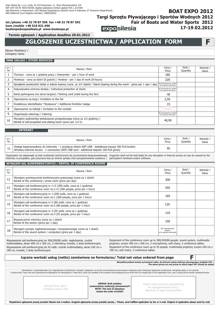 Expo Silesia Sp. z o.o. (Ltd), 41-219 Sosnowiec, ul. Braci Mieroszewskich 124 NIP (VAT ID) PL 9591726258, Kapita³ zak³adowy (Initial capital) PLN 1.227.000 S¹d Rejonowy w Katowicach, VIII Wydzia³ Gospodarczy (District Court in Katowice, 8th Economic Department) KRS (National Court Registry Number) 0000252032 BOAT EXPO 2012 Targi Sprzêtu P³ywaj¹cego i Sportów Wodnych 2012 Fair of Boats and Water Sports 2012 17-19.02.2012 tel./phone +48 32 78 87 596 fax +48 32 78 87 502 kom./mobile +48 510 031 696 [email protected] www.boatexpo.pl Termin zg³oszeñ / Application deadline 20.01.2012 F ZG£OSZENIE UCZESTNICTWA / APPLICATION FORM Nazwa Wystawcy / Company name INNE US£UGI / OTHER SERVICES LP. / No. Cena / Price Nazwa / Item 1 T³umacz - cena za 1 godzinê pracy / Interpreter - per 1 hour of work 2 Hostessa - cena za dzieñ (8 godzin) / Hostess - per 1 day of work (8 hours) 3 Sprz¹tanie powierzchni stoisk w trakcie imprezy (cena za 1m2 /dzieñ) / Stand cleaning during the event - (price per 1 sqm / day) Wg indywidualnych ustaleñ/ to be agreed individually 4 Indywidualna ochrona stoiska / Individual protection of stand Wg indywidualnych ustaleñ/ to be agreed individually 5 Karta parkingowa (na okres targów) / Parking card (valid during the fair) 6 Zaproszenie na targi / Invitation to the fair 7 Dodatkowy identyfikator “Wystawca” / Additional Exhibitor badge 8 Zaproszenie na koktajl / Invitation to the cocktail 9 Organizacja cateringu / Catering Wartoœæ / Value Iloœæ / Quantity Wartoœæ / Value 180 220 40 2,50 15 Wg indywidualnych ustaleñ/ to be agreed individually Wynajem podnoœnika teleskopowo-przegubowego (cena za 1/2 godziny) / Rental of self-propelled articulating boom (price per 1/2 h) 10 Iloœæ / Quantity 40,99 INTERNET LP. / No. Cena / Price Nazwa / Item Dostæp bezprzewodowy do Internetu - 1 przyùàcze (Karta WiFi USB - dodatkowa kaucja 100 PLN brutto) Wireless Internet Access - 1 connection (WiFi USB card - additional deposit 100 PLN gross) 11 90 Organizator nie odpowiada za brak moýliwoúci technicznych do uruchomienia bezprzewodowego Organizer shall not be held liable for any disruption in Internet access as may be caused by the internetu w przypadku, gdy przyczyna leýy po stronie sprzætu i/lub oprogramowania wystawcy. / participant’s hardware and/or software. WYNAJEM SAL KONFERENCYJNYCH / RENTAL OF CONFERENCE ROOMS LP. / No. Cena / Price Nazwa / Item 12 Wynajem pomieszczenia konferencyjno-prasowego (cena za 1 dzieñ) Rental of the conference / press room (price per day) 300 13 Wynajem sali konferencyjnej nr 1+2 (300 osób, cena za 1 godzinê) Rental of the conference room no.1+2 (300 people, price per 1 hour) 260 14 Wynajem sali konferencyjnej nr 1 (200 osób, cena za 1 godzinê) Rental of the conference room no.1 (200 people, price per 1 hour) 160 15 Wynajem sali konferencyjnej nr 2 (80 osób, cena za 1 godzinê) Rental of the conference room no.2 (80 people, price per 1 hour) 120 16 Wynajem sali konferencyjnej nr 3 (55 osób, cena za 1 godzinê) Rental of the conference room no.3 (55 people, price per 1 hour) 110 17 Wypo¿yczenie mównicy (cena za 1 dzieñ) Rental of the lectern (price per 1 day) 100 18 Wynajem sprzêtu nag³oœnieniowego / komputerowego (cena za 1 dzieñ) Rental of the sound system / computers (price per 1 day) Wyposa¿enie sali konferencyjnej na 300/200/80 osób: nag³oœnienie, rzutnik multimedialny, ekran 400 cm x 300 cm, 2 mikrofony, krzes³a, 2 sto³y konferencyjne. Wyposa¿enie sali konferencyjnej do 55 osób: rzutnik multimedialny, ekran 240 cm x 190 cm, krzes³a, 2 sto³y konferencyjne. Iloœæ / Quantity Wartoœæ / Value Wg indywidualnych ustaleñ / to be agreed individually Equipment of the conference room up to 300/200/80 people: sound system, multimedia projector, screen 400 cm x 300 cm, 2 microphones, soft chairs, 2 conference tables. Equipment of the conference room up to 55 people: multimedia projector, screen 240 cm x 190 cm, soft chairs, 2 conference tables. £¹czna wartoœæ us³ug (netto) zamówiona na formularzu/ Total net value ordered from page F Wszystkie podane kwoty s¹ kwotami netto, do których nale¿y doliczyæ obowi¹zuj¹cy podatek VAT. / The above prices are net prices to which legal VAT should be added. Oœwiadczam, i¿ zapozna³em/³am siê z Regulaminem Uczestnictwa w Targach, dostêpnym na stronie www.boatexpo.pl stanowi¹cym integraln¹ czêœæ niniejszego Zg³oszenia Uczestnictwa i akceptujê zapisy w nim zawarte I declare that I have read and understood the Regulations for Participants in Trade Fairs, which are available at the website www.boatexpo.pll and which form an integral part of this Application Form, and I accept all the articles contained therein. Pieczêæ firmy, data / Company stamp, date UWAGA: Brak podpisu uniemozliwia realizacjê zamówienia!!! NOTE: The lack of signature makes the order invalid!!! Podpis osoby prawnie upowa¿nionej do reprezentowania firmy / Signature of legal representative Wype³nione zg³oszenie proszê przes³aæ faksem lub e-mailem. Orygina³ zg³oszenia proszê przes³aæ poczt¹. / Please, send fulfilled application by fax or e-mail. Original of application please send by mail.