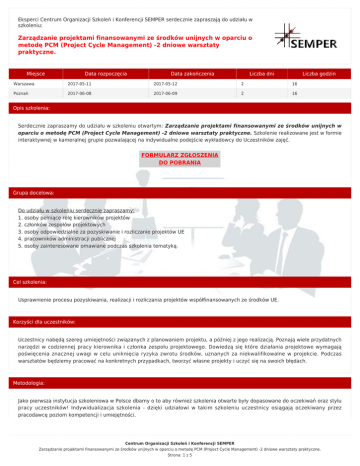Eksperci Centrum Organizacji Szkoleń i Konferencji SEMPER serdecznie zapraszają do udziału w szkoleniu: Zarządzanie projektami finansowanymi ze środków unijnych w oparciu o metodę PCM (Project Cycle Management) -2 dniowe warsztaty praktyczne. Miejsce Data rozpoczęcia Data zakończenia Liczba dni Liczba godzin Warszawa 2017-05-11 2017-05-12 2 16 Poznań 2017-06-08 2017-06-09 2 16 Opis szkolenia: Serdecznie zapraszamy do udziału w szkoleniu otwartym: Zarządzanie projektami finansowanymi ze środków unijnych w oparciu o metodę PCM (Project Cycle Management) -2 dniowe warsztaty praktyczne. Szkolenie realizowane jest w formie interaktywnej w kameralnej grupie pozwalającej na indywidualne podejście wykładowcy do Uczestników zajęć. FORMULARZ ZGŁOSZENIA DO POBRANIA Grupa docelowa: Do udziału w szkoleniu serdecznie zapraszamy: 1. osoby pełniące rolę kierowników projektów 2. członków zespołów projektowych 3. osoby odpowiedzialne za pozyskiwanie i rozliczanie projektów UE 4. pracowników administracji publicznej 5. osoby zainteresowane omawiane podczas szkolenia tematyką. Cel szkolenia: Usprawnienie procesu pozyskiwania, realizacji i rozliczania projektów współfinansowanych ze środków UE. Korzyści dla uczestników: Uczestnicy nabędą szereg umiejętności związanych z planowaniem projektu, a później z jego realizacją. Poznają wiele przydatnych narzędzi w codziennej pracy kierownika i członka zespołu projektowego. Dowiedzą się które działania projektowe wymagają poświęcenia znacznej uwagi w celu uniknięcia ryzyka zwrotu środków, uznanych za niekwalifikowalne w projekcie. Podczas warsztatów będziemy pracować na konkretnych przypadkach, tworzyć własne projekty i uczyć się na swoich błędach. Metodologia: Jako pierwsza instytucja szkoleniowa w Polsce dbamy o to aby również szkolenia otwarte były dopasowane do oczekiwań oraz stylu pracy uczestników! Indywidualizacja szkolenia - dzięki udziałowi w takim szkoleniu uczestnicy osiągają oczekiwany przez pracodawcę poziom kompetencji i umiejętności. Centrum Organizacji Szkoleń i Konferencji SEMPER Zarządzanie projektami finansowanymi ze środków unijnych w oparciu o metodę PCM (Project Cycle Management) -2 dniowe warsztaty praktyczne. Strona: 1 z 5 Zajęcia są prowadzone metodą warsztatową opartą na aktywizacji uczestników szkolenia poprzez pracę w małych grupach, dyskusje na forum grupy oraz ćwiczenia, studia przypadków, scenki rodzajowe, pracę indywidualną, symulacje i mini- wykłady z omówieniem przykładów z życia i prezentacją multimedialną. Przedmiotem zajęć są realne trudności uwzględniające specyfikę danej branży oraz potrzeby i możliwości osób biorących udział w warsztatach. Uczestnicy uczą się poprzez doświadczenie ćwiczą różne sytuacje, mają możliwość konsultacji indywidualnych. Nauka poprzez kreatywność, elastyczność i osobiste doświadczenia jest najskuteczniejszą formą zdobywania nowych umiejętności. Trener: Katarzyna Sapa Specjalizacja trenerska: Ekspert Centrum Organizacji Szkoleń i Konferencji SEMPER Doradca, trener i praktyk w zakresie wdrażania innowacji zarówno produktowych (modelowanie biznesowe, komercjalizacja wiedzy i technologii, tworzenie i realizacja projektów B+R dla firm i uczelni wyższych) jak i organizacyjnych (podnoszenie kompetencji pracowniczych, badanie potrzeb szkoleniowych, ocena i motywowanie pracowników, komunikacja w organizacji, CSR). Magister socjologii, ukończone studia MBA na Wyższej Szkole Bankowej we Wrocławiu. Posiada ponad dziesięcioletnie doświadczenie w zakresie kompleksowej realizacji projektów współfinansowanych ze środków UE. Prowadzi projekty od powstania pomysłu, przez pozyskanie zewnętrznego finansowania, wdrożenie, rozliczenie, audyt i ewaluację. Jako Project Manager i doradca ds. rozwoju pracowała w wielu firmach w Polsce, również jako członek zarządu w spółkach akcyjnych. Specjalizuje się w zarządzaniu projektami innowacyjnymi o złożonej strukturze i rozproszonym, interdyscyplinarnym zespole. W pracy korzysta z narzędzi myślowych Teorii Ograniczeń oraz metodyki PCM. W ramach nowej perspektywy finansowej 2014-2020 (m.in.: RPO, POPC, POIR, POIŚ, POWER) pomogła swoim Klientom pozyskać ponad 50 mln zł ze środków UE. Od 7 lat szkoli członków i liderów zespołów projektowych odpowiedzialnych za pozyskiwanie i realizację projektów współfinansowanych ze środków UE. Program szkolenia: I. Wstęp do zarządzania projektem 1. Czym jest projekt? 2. Terminologia projektowa 3. Trójkąt zakresu projektu 4. Specyfika projektów wspófinansowanych ze środków UE 5. Projekt a biznes plan, studium wykonalności i wniosek aplikacyjny 6. Metoda PCM w zarządzaniu projektami unijnymi II. Planowanie i identyfikacja projektu 1. Analiza interesariuszy 2. Matryca logiczna projektu 3. Drzewo problemów 4. Drzewo celów 5. Wybór strategii 6. Cele szczegółowe, rezultaty i wskaźniki III. Pozyskanie finansowania 1. Wniosek aplikacyjny i studium wykonalności a matryca logiczna projektu 2. Posiadane zasoby: ludzie, zaplecze techniczne, czas, środki finansowe 3. Harmonogram rzeczowo- finansowy projektu 4. Ryzyka w projekcie a koszty niekwalifikowane IV. Wdrożenie projektu 1. Harmonogram działań i kamienie milowe projektu 2. Struktura podziału zadań 3. Diagram struktury produktów 4. Zespół projektowy 5. Monitoring wskaźników i ewaluacja. Centrum Organizacji Szkoleń i Konferencji SEMPER Zarządzanie projektami finansowanymi ze środków unijnych w oparciu o metodę PCM (Project Cycle Management) -2 dniowe warsztaty praktyczne. Strona: 2 z 5 Informacje organizacyjne: Na kilka dni przed terminem wydarzenia skontaktujemy się z Państwem aby zapytać o Państwa oczekiwania, dotychczasowe doświadczenia i umiejętności, co pozwoli nam na częściowe dopasowanie programu szkolenia do Państwa potrzeb. Harmonogram zajęć ● ● ● ● szkolenie t