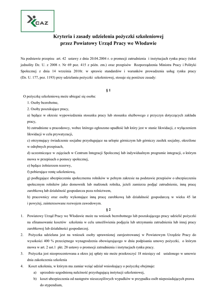 Kryteria i zasady udzielenia pożyczki szkoleniowej przez Powiatowy Urząd Pracy we Włodawie Na podstawie przepisu art. 42 ustawy z dnia 20.04.2004 r. o promocji zatrudnienia i instytucjach rynku pracy (tekst jednolity Dz. U. z 2008 r. Nr 69 poz. 415 z późn. zm.) oraz przepisów Rozporządzenia Ministra Pracy i Polityki Społecznej z dnia 14 września 2010r. w sprawie standardów i warunków prowadzenia usług rynku pracy (Dz. U. 177, poz. 1193) przy udzielaniu pożyczki szkoleniowej, stosuje się poniższe zasady: §1 O pożyczkę szkoleniową może ubiegać się osoba: 1. Osoby bezrobotne, 2. Osoby poszukujące pracy, a) będące w okresie wypowiedzenia stosunku pracy lub stosunku służbowego z przyczyn dotyczących zakładu pracy, b) zatrudnione u pracodawcy, wobec którego ogłoszono upadłość lub który jest w stanie likwidacji, z wyłączeniem likwidacji w celu prywatyzacji, c) otrzymujący świadczenie socjalne przysługujące na urlopie górniczym lub górniczy zasiłek socjalny, określone w odrębnych przepisach, d) uczestniczące w zajęciach w Centrum Integracji Społecznej lub indywidualnym programie integracji, o którym mowa w przepisach o pomocy społecznej, e) będące żołnierzem rezerwy, f) pobierające rentę szkoleniową, g) podlegające ubezpieczeniu społecznemu rolników w pełnym zakresie na podstawie przepisów o ubezpieczeniu społecznym rolników jako domownik lub małżonek rolnika, jeżeli zamierza podjąć zatrudnienie, inną pracę zarobkową lub działalność gospodarcza poza rolnictwem, h) pracownicy oraz osoby wykonujące inną pracę zarobkową lub działalność gospodarczą w wieku 45 lat i powyżej, zainteresowane rozwojem zawodowym. §2 1. Powiatowy Urząd Pracy we Włodawie może na wniosek bezrobotnego lub poszukującego pracy udzielić pożyczki na sfinansowanie kosztów szkolenia w celu umożliwienia podjęcia lub utrzymania zatrudnienia lub innej pracy zarobkowej lub działalności gospodarczej. 2. Pożyczka udzielana jest na wniosek osoby uprawnionej zarejestrowanej w Powiatowym Urzędzie Pracy do wysokości 400 % przeciętnego wynagrodzenia obowiązującego w dniu podpisania umowy pożyczki, o którym mowa w art. 2 ust.1 pkt. 28 ustawy o promocji zatrudnienia i instytucjach rynku pracy. 3. Pożyczka jest nieoprocentowana a okres jej spłaty nie może przekroczyć 18 miesięcy od ustalonego w umowie dnia zakończenia szkolenia 4. Koszt szkolenia, w którym ma zamiar wziąć udział wnioskujący o pożyczkę obejmuje: a) uprzednio uzgodnioną należność przysługującą instytucji szkoleniowej, b) koszt ubezpieczenia od następstw nieszczęśliwych wypadków w przypadku osób nieposiadających prawa do stypendium, c) koszty przejazdu, a w przypadku gdy szkolenie odbywa się w miejscowości innej niż miejsce zamieszkania, także koszty zakwaterowania i wyżywienia, d) koszt badań lekarskich i psychologicznych wymaganych odrębnymi przepisami, e) koszt egzaminów umożliwiających uzyskanie świadectw, dyplomów, zaświadczeń, określonych uprawnień zawodowych lub tytułów zawodowych oraz koszty uzyskania licencji niezbędnych do wykonywania danego zawodu. §2 1. Osoba uprawniona ubiegając się o udzielenie pożyczki na sfinansowanie kosztów szkolenia składa wniosek o udzielenie pożyczki (wzór wniosku stanowi załącznik nr 1) zawierający: 1) imię i nazwisko oraz numer PESEL osoby wnioskującej, a w przypadku cudzoziemca numer dokumentu stwierdzającego tożsamość, i adres zamieszkania tej osoby; 2) kwotę pożyczki szkoleniowej, z uwzględnieniem kwoty należnej instytucji szkoleniowej i kwot przewidzianych na finansowanie innych kosztów szkolenia; 3) nazwę i termin szkolenia oraz nazwę i adres instytucji szkoleniowej realizującej szkolenie finansowane z pożyczki szkoleniowej; 4) sposób zabezpieczenia spłaty pożyczki szkoleniowej; 5) uzasadnienie potrzeby udzielenia tej formy pomocy. 2. Uzasadnienie potrzeby udzielenia tej formy pomocy może nastąpić poprzez: a) przedłożenie oświadczenia przyszłego pracodawcy o zamiarze zatrudnienia lub powierzenia innej pracy zarobkowej, b) przedłożenie oświadczenia o zamiarze rozpoczęcia własnej działalności gospodarczej, c) przedłożenie deklaracji zakładu pracy o celowości udzielenia pożyczki szkoleniowej (dot. osoby poszukującej pracy/pracownika powyżej 45 roku życia), d) inna forma uzasadnienia potrzeby udzielenia tej pomocy w szczególnych przypadkach. 3. Do wniosku osoba uprawniona dołącza zaświadczenie o osiąganych dochodach poręczyciela lub poręczycieli. 4. Po przeanalizowaniu zasadności udzielenia pożyczki szkoleniowej z uwzględnieniem przedstawionej przez wnioskodawcę oceny celowości udzielenia tej formy pomocy, osoba uprawniona zostanie poinformowana na piśmie o sposobie rozpatrzenia wniosku. 5. W przypadku pozytywnego rozpatrzenia wniosku zostaną ustalone warunki zawarcia umowy. 6. Umowa na udzielenie pożyczki na szkoleniowej zawarta pomiędzy Starostą a Wnioskodawcą określa: 1) kwotę pożyczki szkoleniowej, z uwzględnieniem kwoty należnej instytucji szkoleniowej i kwot przewidzianych na finansowanie innych kosztów szkolenia; 2) nazwę i termin szkolenia oraz nazwę i adres instytucji szkoleniowej realizującej szkolenie finansowane z pożyczki szkoleniowej; 3) plan spłaty rat pożyczki szkoleniowej oraz sposób zabezpieczenia jej spłaty; 4) zobowiązanie do wydatkowania pożyczki szkoleniowej na cele określone w umowie; 5) zobowiązanie osoby uprawnionej do powiadomienia powiatowego urzędu pracy o podjęciu i zakończeniu szkolenia finansowanego z pożyczki szkoleniowej oraz do przedstawienia dokumentów umożliwiających rozliczenie pożyczki szkoleniowej. §3 1. Wnioskodawca obowiązany jest zapewnić zabezpieczenie spłaty pożyczki w formie poręczenia osób trzecich. 2. Poręczenie jako zabezpieczenie spłaty pożyczki powinno być dokonane przez dwóch poręczycieli posiadających dochód brutto w wysokości co naj