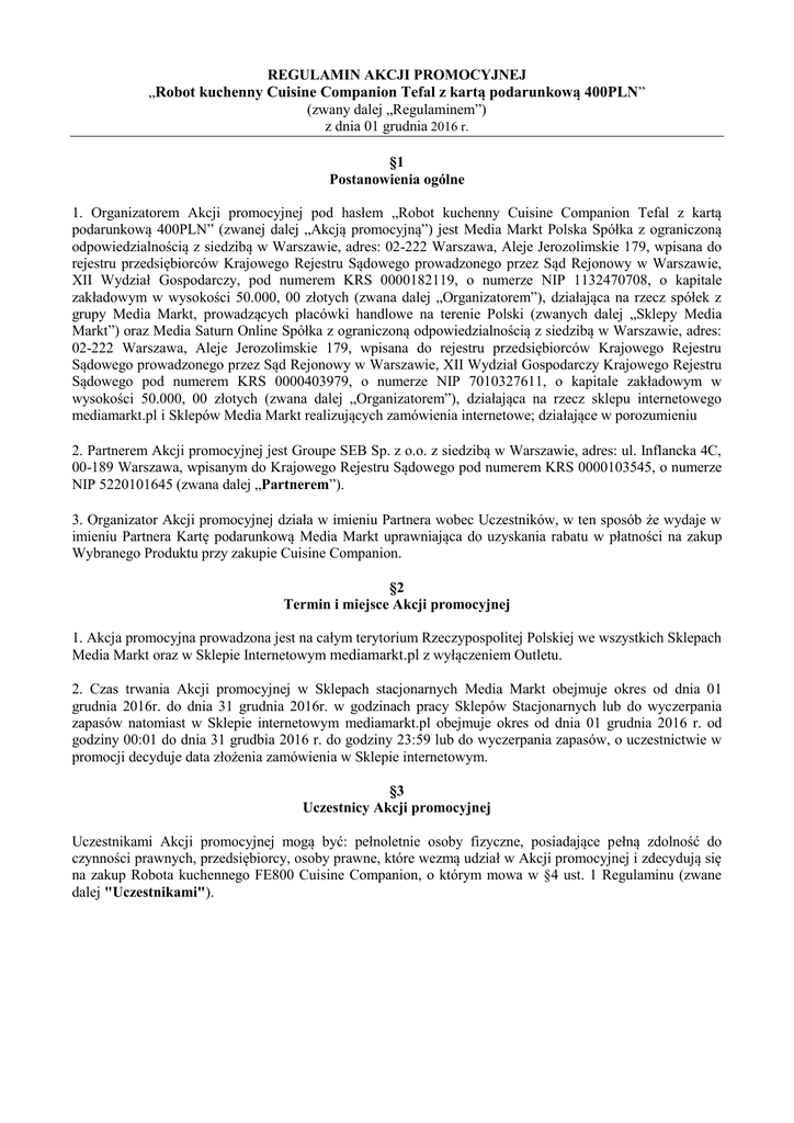 REGULAMIN AKCJI PROMOCYJNEJ „Robot kuchenny Cuisine Companion Tefal z kartą podarunkową 400PLN” (zwany dalej „Regulaminem”) z dnia 01 grudnia 2016 r. §1 Postanowienia ogólne 1. Organizatorem Akcji promocyjnej pod hasłem „Robot kuchenny Cuisine Companion Tefal z kartą podarunkową 400PLN” (zwanej dalej „Akcją promocyjną”) jest Media Markt Polska Spółka z ograniczoną odpowiedzialnością z siedzibą w Warszawie, adres: 02-222 Warszawa, Aleje Jerozolimskie 179, wpisana do rejestru przedsiębiorców Krajowego Rejestru Sądowego prowadzonego przez Sąd Rejonowy w Warszawie, XII Wydział Gospodarczy, pod numerem KRS 0000182119, o numerze NIP 1132470708, o kapitale zakładowym w wysokości 50.000, 00 złotych (zwana dalej „Organizatorem”), działająca na rzecz spółek z grupy Media Markt, prowadzących placówki handlowe na terenie Polski (zwanych dalej „Sklepy Media Markt”) oraz Media Saturn Online Spółka z ograniczoną odpowiedzialnością z siedzibą w Warszawie, adres: 02-222 Warszawa, Aleje Jerozolimskie 179, wpisana do rejestru przedsiębiorców Krajowego Rejestru Sądowego prowadzonego przez Sąd Rejonowy w Warszawie, XII Wydział Gospodarczy Krajowego Rejestru Sądowego pod numerem KRS 0000403979, o numerze NIP 7010327611, o kapitale zakładowym w wysokości 50.000, 00 złotych (zwana dalej „Organizatorem”), działająca na rzecz sklepu internetowego mediamarkt.pl i Sklepów Media Markt realizujących zamówienia internetowe; działające w porozumieniu 2. Partnerem Akcji promocyjnej jest Groupe SEB Sp. z o.o. z siedzibą w Warszawie, adres: ul. Inflancka 4C, 00-189 Warszawa, wpisanym do Krajowego Rejestru Sądowego pod numerem KRS 0000103545, o numerze NIP 5220101645 (zwana dalej „Partnerem”). 3. Organizator Akcji promocyjnej działa w imieniu Partnera wobec Uczestników, w ten sposób że wydaje w imieniu Partnera Kartę podarunkową Media Markt uprawniająca do uzyskania rabatu w płatności na zakup Wybranego Produktu przy zakupie Cuisine Companion. §2 Termin i miejsce Akcji promocyjnej 1. Akcja promocyjna prowadzona jest na całym terytorium Rzeczypospolitej Polskiej we wszystkich Sklepach Media Markt oraz w Sklepie Internetowym mediamarkt.pl z wyłączeniem Outletu. 2. Czas trwania Akcji promocyjnej w Sklepach stacjonarnych Media Markt obejmuje okres od dnia 01 grudnia 2016r. do dnia 31 grudnia 2016r. w godzinach pracy Sklepów Stacjonarnych lub do wyczerpania zapasów natomiast w Sklepie internetowym mediamarkt.pl obejmuje okres od dnia 01 grudnia 2016 r. od godziny 00:01 do dnia 31 grudbia 2016 r. do godziny 23:59 lub do wyczerpania zapasów, o uczestnictwie w promocji decyduje data złożenia zamówienia w Sklepie internetowym. §3 Uczestnicy Akcji promocyjnej Uczestnikami Akcji promocyjnej mogą być: pełnoletnie osoby fizyczne, posiadające pełną zdolność do czynności prawnych, przedsiębiorcy, osoby prawne, które wezmą udział w Akcji promocyjnej i zdecydują się na zakup Robota kuchennego FE800 Cuisine Companion, o którym mowa w §4 ust. 1 Regulaminu (zwane dalej "Uczestnikami"). §4 Zasady Akcji promocyjnej 1. Akcją promocyjną objęty jest są robot kuchenny FE800 Cuisine Companion (zwany dalej „Cuisine Companion”) dostępny w ofercie Sklepów Media Markt oraz w sklepie internetowym mediamarkt.pl. 2. W ramach Akcji promocyjnej Uczestnik nabywając Cuisine Companion oraz dowolny wybrany produkt o wartości co najmniej PLN 400 (słownie: czterysta złotych) brutto (zwany dalej „Wybranym Produktem”) z oferty Sklepów Media Markt lub sklepu internetowego mediamarkt.pl - otrzyma Kartę podarunkową Media Markt o wartości 400 złotych (słownie: czterysta złotych), którą Uczestnik realizuje jako częściową płatność za nabywany Wybrany Produkt (zwany dalej „Rabatem”). 3. W celu uzyskania Rabatu na zakup Wybranego Produktu, Uczestnik powinien wykorzystać Kartę podarunkową Media Markt w trakcie trwania Akcji promocyjnej. 4. Rabat udzielany przez Partnera, o którym mowa w ust. 2 i 3, zostanie odliczony od kwoty płatności Wybranego Produktu w trakcie trwania Akcji promocyjnej. Na dokumencie sprzedaży Rabat w płatności będzie widoczny jako częściowa płatność dokonana przy użyciu Karty podarunkowej Media Markt. 5. Uczestnikom Akcji promocyjnej nie przysługuje prawo do otrzymania ekwiwalentu pieniężnego w wysokości kwoty udzielonego Rabatu. 6. W przypadku Sklepów stacjonarnych Uczestnik Akcji może korzystać z uprawnień wynikających z niniejszego regulaminu wielokrotnie, pod warunkiem każdorazowego spełnienia warunków przewidzianych w regulaminie. W przypadku Sklepu internetowego mediamarkt.pl Rabat jest jednorazowy tzn. że przysługuje wyłącznie jeden (1) raz i jedynie w czasie trwania Akcji promocyjnej oraz Rabat nie może być przyznany na zakup produktów po zakończeniu Akcji promocyjnej. O zakupie w promocyjnej cenie na mediamarkt.pl decyduje data złożenia zamówienia. 7. Dokument stanowiący dowód zakupu (paragon fiskalny lub faktura VAT) w celu oznaczenia Akcji promocyjnej będzie zawierał w treści hasło Akcji promocyjnej „Cuisine Companion + wybrany produkt z rabatem 400 zł”. 8. Akcja promocyjna nie może być łączona z innymi akcjami promocyjnymi, rabatami i obniżkami cen w tym kodami rabatowymi otrzymanymi w ramach programu Konto Plus. §5 Odpowiedzialność 1. Odpowiedzialność Organizatora wobec Uczestnika z tytułu roszczeń związanych z uprawnieniami przyznanymi Uczestnikowi w Regulaminie ograniczona jest do wysokości ceny Wybranego Produktu w dniu zakupu lub ceny obowiązującej w trakcie Akcji promocyjnej i po odjęciu udzielonego rabatu (jeżeli Uczestnik z rabatu skorzystał), którego to Wybranego Produktu roszczenie dotyczy. 2. Powyższe ograniczenie nie wyłącza uprawnień przyznanych Uczestnikom na mocy odrębnych przepisów prawnych. §6 Reklamacje i wymiana towarów 1. Reklamacje Uczestników dotyczące sposobu przeprowadzenia Akcji pr