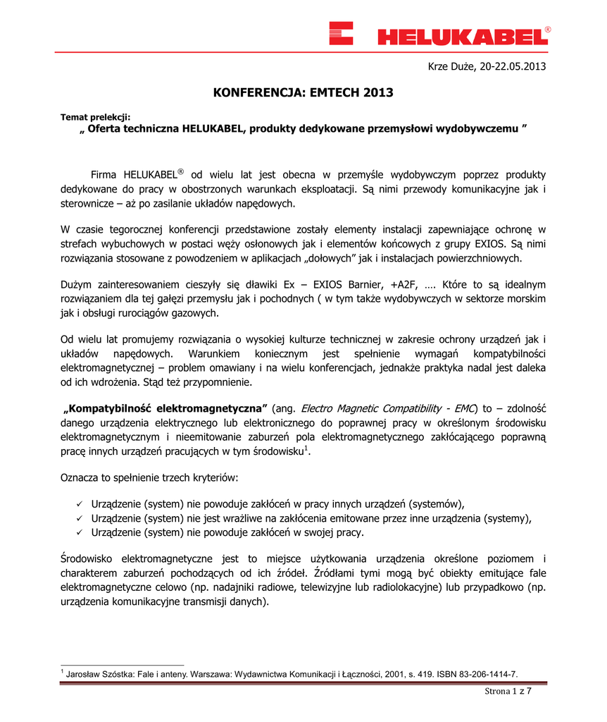 Krze Duże, 20-22.05.2013 KONFERENCJA: EMTECH 2013 Temat prelekcji: „ Oferta techniczna HELUKABEL, produkty dedykowane przemysłowi wydobywczemu ” Firma HELUKABEL® od wielu lat jest obecna w przemyśle wydobywczym poprzez produkty dedykowane do pracy w obostrzonych warunkach eksploatacji. Są nimi przewody komunikacyjne jak i sterownicze – aż po zasilanie układów napędowych. W czasie tegorocznej konferencji przedstawione zostały elementy instalacji zapewniające ochronę w strefach wybuchowych w postaci węży osłonowych jak i elementów końcowych z grupy EXIOS. Są nimi rozwiązania stosowane z powodzeniem w aplikacjach „dołowych” jak i instalacjach powierzchniowych. Dużym zainteresowaniem cieszyły się dławiki Ex – EXIOS Barnier, +A2F, …. Które to są idealnym rozwiązaniem dla tej gałęzi przemysłu jak i pochodnych ( w tym także wydobywczych w sektorze morskim jak i obsługi rurociągów gazowych. Od wielu lat promujemy rozwiązania o wysokiej kulturze technicznej w zakresie ochrony urządzeń jak i układów napędowych. Warunkiem koniecznym jest spełnienie wymagań kompatybilności elektromagnetycznej – problem omawiany i na wielu konferencjach, jednakże praktyka nadal jest daleka od ich wdrożenia. Stąd też przypomnienie. „Kompatybilność elektromagnetyczna” (ang. Electro Magnetic Compatibility - EMC) to – zdolność danego urządzenia elektrycznego lub elektronicznego do poprawnej pracy w określonym środowisku elektromagnetycznym i nieemitowanie zaburzeń pola elektromagnetycznego zakłócającego poprawną pracę innych urządzeń pracujących w tym środowisku1. Oznacza to spełnienie trzech kryteriów: Urządzenie (system) nie powoduje zakłóceń w pracy innych urządzeń (systemów), Urządzenie (system) nie jest wrażliwe na zakłócenia emitowane przez inne urządzenia (systemy), Urządzenie (system) nie powoduje zakłóceń w swojej pracy. Środowisko elektromagnetyczne jest to miejsce użytkowania urządzenia określone poziomem i charakterem zaburzeń pochodzących od ich źródeł. Źródłami tymi mogą być obiekty emitujące fale elektromagnetyczne celowo (np. nadajniki radiowe, telewizyjne lub radiolokacyjne) lub przypadkowo (np. urządzenia komunikacyjne transmisji danych). 1 Jarosław Szóstka: Fale i anteny. Warszawa: Wydawnictwa Komunikacji i Łączności, 2001, s. 419. ISBN 83-206-1414-7. Strona 1 z 7 Zgodnie z zaleceniami Polskiego Komitetu Normalizacyjnego termin "zaburzenie elektromagnetyczne" oznacza przyczynę, czyli zjawisko elektromagnetyczne, które może powodować "zakłócenie", czyli degradację pracy urządzenia2. W celu zapewnienia odporności przed zaburzeniami pola elektromagnetycznego, jak zatrzymaniem jego emisji proponujemy stosowanie systemowych rozwiązań z naszej oferty produktowej. Firma HELUKABEL oferuje wiele rozwiązań spełniających te wymagania. Są to min dławiki kablowe do zastosowania po za strefami zagrożonymi wybuchem jak i w wersji EX. Najbogatsza oferta dotyczy stref 1MII – Ex-e, Ex-d. Dla części oferty mamy także rozwiązania dedykowane. Jednym z przykładów jest dławnica kablowa do obszarów niebezpiecznych „EXIOS” [prod.Hummel AG] o wysokiej zdolności ochrony co potwierdzają certyfikaty ATEX: II 2G Ex de IIC Gb oraz II 1D Ex ta IIIC Da. Wyjątkowość tego produktu i jego atrakcyjność sprawia iż jest stosowany w przemyśle wydobywczym, petrochemicznym oraz w wielu innych rozwiązaniach, gdzie ochrona EMC w połączeniu z zagrożeniem wybuchowym jest bardzo istotna. Film reklamowy został przedstawiony w trakcie konferencji EMTECH 2013, spotykając się z dużym zainteresowaniem. W stałej ofercie produktowej posiadamy około 3000 rodzajów artykułów dedykowanych rozwiązaniom maszynowym. Znaczną ich część stanowią produkty spełniające wymagania kompatybilności elektromagnetycznej – w tym też przeznaczonych do stref zagrożonych wybuchem 1MII jak również 1MI. Oferta produktowa ulega ciągłym zmianom i modyfikacjom będących w bezpośrednim związku z aktualizacjami norm branżowych i technologii produkcji. Innymi rozwiązaniami przyczyniającymi się do podniesienia bezpieczeństwa w środowisku maszynowym są układy węży osłonowych pozwalające na zwiększenie odporności mechanicznej prowadzonej instalacji, przejęcie całkowite ochrony przed wilgocią czy też zapewniającymi ochronę środowiska przed zaburzeniami elektromagnetycznymi. Wymienione parametry są bardzo istotne w eksploatacji urządzeń i maszyn w środowisku o podwyższonym zagrożeniu kontaktu ze środkami niebezpiecznymi. Podstawowym elementem ochrony dodatkowej izolacji przewodów są węże osłonowe. Aby przedstawić ich cechy pogrupowałem je wg przeznaczenia środowiskowego: Instalacje zewnętrzne, gdzie występuje kontakt z warunkami atmosferycznymi i niektórymi związkami chemicznymi. Proponujemy system HELUcond. Są to węże wykonane głównie z poliamidu [PA], ale także z polipropylenu [PP] i polietylenu [PE]. Uzupełnieniem jego są złącza proste, kątowe 45° i 90° oraz uchwyty montażowe typu SH, SHV, USH. Zakres średnic wewnętrznych od 4,5 do 48,0mm a także od 67,5 do 97,5mm. Cała oferta wykonana w kolorze czarnym [RAL 9005] jest odporna na promieniowanie UV. Instalacje wewnętrzne i maszynowe – to głównie rozwiązanie oparte na rodzinie węży osłonowych typu SPR. System ten oparty jest na konstrukcji spiralnego węża wykonanego ze stali galwanizowanej SPR-AS, z powłoką zewnętrzną z PVC – SPR-PVC-AS oraz jako wersja węża osłonowego powlekanego dodatkową siatką splotu stalowego SPR-EDU-AS. Ostatni produkt 2 PN-T-01030:1996 Kompatybilność elektromagnetyczna. Terminologia Strona 2 z 7 wykorzystywany jest z powodzeniem wszędzie tam gdzie występuje zagrożenie drobinek kruszywa, a sam przewód w wyniku pracy podlega drganiom. Inne zastosowanie, to miejsca obecności gryzoni – w wyniku kontaktu z oplotem stalowym zwierzęta te n