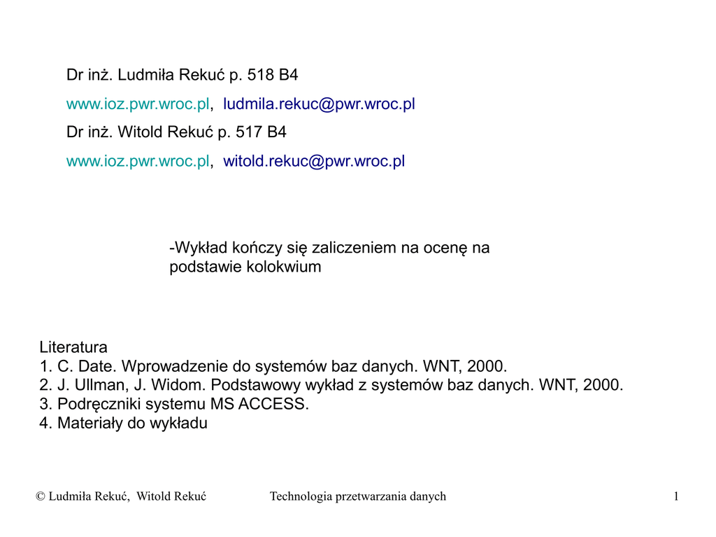 Dr inż. Ludmiła Rekuć p. 518 B4 www.ioz.pwr.wroc.pl, [email protected] Dr inż. Witold Rekuć p. 517 B4 www.ioz.pwr.wroc.pl, [email protected] -Wykład kończy się zaliczeniem na ocenę na podstawie kolokwium Literatura 1. C. Date. Wprowadzenie do systemów baz danych. WNT, 2000. 2. J. Ullman, J. Widom. Podstawowy wykład z systemów baz danych. WNT, 2000. 3. Podręczniki systemu MS ACCESS. 4. Materiały do wykładu © Ludmiła Rekuć, Witold Rekuć Technologia przetwarzania danych 1 Laboratorium IBM San Jose (California) ”A relational model for large shared data banks” Communication of the ACM, 13:6,1970. System R - prototyp oprogramowania SEQUEL2 – prototyp języka Dziś: Oprogramowanie MS ACCESS, SQL Server, PostgreSQL, INGRES, ORACLE, DB2, Informix, Progres, … Język SQL Edgar F. Codd © Ludmiła Rekuć, Witold Rekuć Technologia przetwarzania danych 2 Baza danych jest zbiorem tabel (relacji) pamiętanych w jednym lub wielu plikach Firmy Firm2000.mdb Miejscowości Nr Nazwa Ulica KodMjc Telefon 0 Nasza Firma Kod Nasza 1 234 23 1 Wrocław DL 1 Abeja Abejowska 3 234 55 2 Opole OP 2 Audi Audiego 2 3 Wałbrzych DL 3 Pafawag Wagonowa 2 4 Iase Energetyczna 3 5 Dolmed Medyczna 1 Nazwa Wojewodztwa KodWoj Kod Nazwa DL Dolnośląskie OP Opolskie 256 12 PozycjeDokumentu Dokumenty Nr NrSprzerdawcy Np SmbTow CenaNetto Ilość Nr NrSprzerdawcy NrNabywcy Data 1/02 0 1 001 12,00 20 1/02 0 2 13.02.02 1/02 0 2 003 4,50 200 2/02 0 3 21.03.02 2/02 0 1 004 7,00 150 1/02 1 0 03.01.02 1/02 1 1 002 13,00 300 3/02 0 1 31.04.02 1/02 1 2 001 12,00 120 2/02 3 0 17.02.02 1/02 1 3 004 7,50 220 4/02 0 4 13.05.02 3/02 0 1 001 11,00 45 3/02 0 2 003 4,50 125 3/02 0 3 004 7,80 35 3/02 0 4 005 3,20 200 2/02 3 1 001 12,00 30 2/02 3 2 003 4,60 50 4/02 0 1 005 3,60 90 Towary Smb Nazwa Jm StawkaVat 001 Pasztet kg 7% 002 Mortadela kg 7% 003 Chipsy paczka 400g 7% 004 Kawa Jakobs paczka 100g 7% 005 Makrela kons. puszka 250g 7% © Ludmiła Rekuć, Witold Rekuć Technologia przetwarzania danych 3 System zarządzania bazą danych Baza danych System zarządzania bazą danych Język użytkowników bazy danych Język administratora bazy danych ... Użytkownicy bazy danych © Ludmiła Rekuć, Witold Rekuć Administrator bazy danych Technologia przetwarzania danych 4 Tabela (relacja) Nazwa tabeli (relacji) nazwa kolumny (atrybutu, pola) Firmy Nr Nazwa Ulica KodMjc Telefon 0 Nasza Firma Nasza 1 234 23 1 Abeja Abejowska 3 234 55 2 Audi Audiego 2 3 Pafawag Wagonowa 2 4 Iase Energetyczna 3 5 Dolmed Medyczna 1 256 12 nagłówek (schemat) Wiersz (rekord, krotka) kolumna (atrybut, pole) © Ludmiła Rekuć, Witold Rekuć Technologia przetwarzania danych 5 Wartości w kolumnach (wartości atrybutów) Firmy Nr Nazwa Ulica KodMjc Telefon 0 Nasza Firma Nasza 1 234 23 1 Abeja Abejowska 3 234 55 2 Audi Audiego 2 3 Pafawag Wagonowa 2 4 Iase Energetyczna 3 5 Dolmed Medyczna 1 6 Dolmel 256 12 Elektryczna 3 452 34 6 Zbiór dopuszczalnych numerów firm Dolme l Zbiór dopuszczalnych nazw firm © Ludmiła Rekuć, Witold Rekuć 452 34 Elektryczn a Zbiór dopuszczalnych nazw ulic 3 Zbiór dopuszczalnych kodów miejscowości Technologia przetwarzania danych Zbiór dopuszczalnych numerów telefonów 6 Dziedzina Dziedzina wartości jest to zbiór wartości, które potencjalnie mogą pojawić się w kolumnie tabeli (które może przyjmować atrybut). Różne dziedziny wartości nie muszą być rozłączne Dziedzinę określa się przez podanie typu danych oraz dodatkowych ograniczeń (więzów) lub właściwości MS ACCESS: Nazwa pola Typ danych Nr Liczba Liczba całkowita >=0 i <=999 Nazwa Tekst Długość 30 znaków Ulica Tekst Długość 20 znaków KodMjc Liczba Liczba całkowita between 1 and 99 Telefon Tekst Maska 999-99 © Ludmiła Rekuć, Witold Rekuć Właściwości Technologia przetwarzania danych 7 Określoność wartości w kolumnach (wartości atrybutów) Firmy Nr Nazwa Ulica KodMjc Telefon 0 Nasza Firma Nasza 1 234 23 1 Abeja Abejowska 3 234 55 2 Audi Audiego 2 3 Pafawag Wagonowa 2 4 Iase Energetyczna 3 5 Dolmed Medyczna 1 6 Dolmel 256 12 Elektryczna Wartość nieokreślona 3 6 Zbiór dopuszczalnych numerów firm Dolm el Zbiór dopuszczalnych nazw firm © Ludmiła Rekuć, Witold Rekuć 452 34 Elektrycz na Zbiór dopuszczalnych nazw ulic 3 Zbiór dopuszczalnych kodów miejscowości Technologia przetwarzania danych Zbiór dopuszczalnych numerów telefonów 8 Projektując tabelę dla pewnego zastosowania możemy rozstrzygnąć dla każdej kolumny: - czy wartość w kolumnie musi być zawsze określona, - czy wartość w kolumnie może być nieokreślona. Do oznaczenia wartości nieokreślonych stosuje się słowo NULL Telefon is NULL – telefon jest nieokreślony Telefon is not NULL – telefon jest określony Nieokreśloność wartości typu Tekst 6 Dolmel Elektryczna 3 Tekst nieokreślony lub pusty Tekst niepusty “452 34” - tekst określony niepusty “” - tekst określony pusty - tekst nieokreślony © Ludmiła Rekuć, Witold Rekuć Technologia przetwarzania danych 9 Nieokreśloność wartości w kolumnach i logika trójwartościowa Telefon = “452 34” ? Telefon is NULL? Telefon is not NULL? 6 Dolmel Elektryczna 3 452 34 TRUE FALSE TRUE 6 Dolmel Elektryczna 3 234 09 FALSE FALSE TRUE 6 Dolmel Elektryczna 3 UNKNOWN TRUE FALSE NULL Operacje na wartościach nieokreślonych X is NULL Y is not NULL lub is NULL X + Y is NULL © Ludmiła Rekuć, Witold Rekuć Technologia przetwarzania danych 10 Wartości domyślne (default) Firmy Nr Nazwa Ulica KodMjc Telefon 0 Nasza Firma Nasza 1 234 23 1 Abeja Abejowska 3 234 55 2 Audi Audiego 2 3 Pafawag Wagonowa 2 4 Iase Energetyczna 3 5 Dolmed Medyczna 1 Wartością domyślną danego atrybutu nazywamy wartość z dziedziny tego atrybutu, która ma być wstawiona przez system do każdego dodawanego wiersza 256 12 3 6 Zbiór dopuszczalnych numerów firm Dolm el Zbiór dopuszczalnych nazw firm © Ludmiła Rekuć, Witold Rekuć 452 34 Elektrycz na Zbiór dopuszczalnych nazw ulic 3 Zbiór dopuszczalny