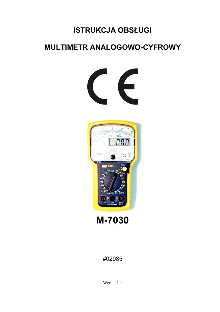 ISTRUKCJA OBSŁUGI MULTIMETR ANALOGOWO-CYFROWY M-7030 #02985 Wersja 1.1 Instrukcja obsługi - Multimetr analogowo-cyfrowy M-7030 1. WPROWADZENIE Instrukcja obsługi dostarcza informacji dotyczących bezpieczeństwa i sposobu uŜytkowania, parametrów technicznych oraz konserwacji multimetru cyfrowego M-7030. Multimetr ten moŜe być stosowany do następujących pomiarów: • napięcia stałego (DC) i przemiennego (AC); • prądu stałego (DC)i przemiennego (AC); • rezystancji; • kontrola ciągłości obwodu (z sygnalizacją dźwiękową); • diod półprzewodnikowych; • test baterii 1,5V i 9V. 2. INFORMACJE DOTYCZĄCE BEZPIECZEŃSTWA UśYTKOWANIA Prezentowany przyrząd pomiarowy został zaprojektowany w trosce o bezpieczeństwo uŜytkownika i zapewnia poprawną pracę pod warunkiem przestrzegania zaleceń niniejszej instrukcji. Przyrząd spełnia wymagania dyrektyw LVD 73/23/EEC i EMC 89/336/EEC oraz posiada deklarację zgodności CE producenta. Przed przystąpieniem do wykonywania pomiarów naleŜy zapoznać się z instrukcją obsługi, ze wszystkimi symbolami znajdującymi się na przyrządach oraz z ich znaczeniem. W celu zapewnienia podstawowych wymogów bezpieczeństwa obsługi przyrządu naleŜy zastosować się do poniŜszych zasad: - Przyrząd naleŜy zabezpieczyć przed dostępem dzieci i osób niepowołanych. - JeŜeli przyrząd zostanie przeniesiony z miejsca o niŜszej temperaturze do miejsca o wyŜszej temperaturze, wówczas wewnątrz przyrządu moŜe się skroplić para wodna uniemoŜliwiając jego prawidłowe funkcjonowanie i dlatego naleŜy odczekać, aŜ wilgoć odparuje. - Przed przystąpieniem do konserwacji przyrządu i montaŜu elementów wymienialnych przyrządu takich jak: baterie, bezpieczniki i inne, naleŜy bezwzględnie odłączyć od przyrządu wszystkie przewody łączące z innymi urządzeniami. - Nie naleŜy przekraczać dopuszczalnych wartości pomiarowych mierzonej wielkości nie tylko ze względu na błędy pomiaru i moŜliwość uszkodzenia przetworników pomiarowych, ale przede wszystkim ze względów bezpieczeństwa uŜytkownika. - Zabrania się uŜywania przyrządu w obszarach duŜej wilgotności, zasolenia, działania oparów toksycznych, łatwopalnych lub Ŝrących. - Nie uŜywać przyrządu przy widocznych uszkodzeniach lub, gdy przewody są uszkodzone lub zuŜyte. Przewody pomiarowe naleŜy wymienić na nowe o takich samych parametrach przekroju i izolacji, a przyrząd naleŜy oddać do autoryzowanego serwisu. - Przy pomiarach elektrycznych nie dotykać niewykorzystanych gniazd i końcówek przyrządu. - Jeśli wartość pomiaru jest nieznana, pomiar naleŜy rozpocząć od największego zakresu pomiarowego. - W celu zmiany wielkości mierzonej, przed przełączeniem przełącznika naleŜy odłączyć końcówki pomiarowe. - Nie mierzyć rezystancji obwodów znajdujących się pod napięciem. - W przypadku pomiaru długich linii lub pojemności pomiar moŜe być wykonany dopiero po całkowitym rozładowaniu ładunku elektrostatycznego. -2- Instrukcja obsługi - Multimetr analogowo-cyfrowy M-7030 SYMBOLE I OZNACZENIA ZWIĄZANE Z BEZPIECZEŃSTWEM UśYTKOWANIA MULTIMETRU M-7030, ZNAJDUJĄCE SIĘ NA OBUDOWIE MIERNIKA: OSTRZEśENIE: Przed uruchomieniem przyrządu lub wykonaniem pomiaru naleŜy zapoznać się dokładnie z instrukcją obsługi. Nie zastosowanie się do tego polecenia moŜe spowodować uszkodzenie lub zniszczenie multimetru. Oznaczenie końcówek i wejść, na których moŜe występować napięcie o niebezpiecznej wartości. Podwójna izolacja (II klasa bezpieczeństwa). CE Zgodność z dyrektywą Unii Europejskiej 3. SPECYFIKACJE DOKŁADNOŚĆ: ±(X1 % wartości wskazanej + X2 cyfr, działek elementarnych), gwarantowana przez okres 1 roku, dla zakresu temperatur 23°C ± 5°C i wilgotno ści powietrza mniejszej od 80%. 3.1. POMIAR NAPIĘCIA STAŁEGO (DC) ZAKRES ROZDZIELCZOŚĆ 200mV 2V 20V 200V 600V 0,1mV 1mV 10mV 100mV 1V WSKAŹNIK ANALOGOWY WYŚWIETLACZ CYFROWY DOKŁADNOŚĆ ±(0,5% + 1d) ±(0,5% + 2d) DOKŁADNOŚĆ ODCZYT 5% dla pełnej skali 5% dla pełnej skali 5% dla pełnej skali 5% dla pełnej skali 5% kąta wychyl. skala czarna×1mV skala czarna×0,01V skala czarna×0,1V skala czarna×1V skala czarna×10V Impedancja wejściowa: 10MΩ; Zabezpieczenie przeciąŜeniowe: 200mV dla zakresu 250 DC lub wartość skuteczna AC 2V-600V dla zakresu 600V DC lub 600V wartość skuteczna AC (sinusoida); 3.2. POMIAR NAPIĘCIA PRZEMIENNEGO (AC) ZAKRES ROZDZIELCZOŚĆ 200mV 2V 20V 200V 600V 0,1mV 1mV 10mV 100mV 1V WYŚWIETLACZ CYFROWY DOKŁADNOŚĆ ±(1,2% + 3d) ±(0,8% + 3d) ±(1,2% + 3d) WSKAŹNIK ANALOGOWY DOKŁADNOŚĆ ODCZYT 5% dla pełnej skali 5% dla pełnej skali 5% dla pełnej skali 5% dla pełnej skali 5% kąta wychyl. skala czarna×1mV skala czarna×0,01V skala czarna×0,1V skala czarna×1V skala czarna×10V Impedancja wejściowa: 10MΩ; Zabezpieczenie przeciąŜeniowe: 200mV dla zakresu 250 DC lub wartość skuteczna AC 2V-600V dla zakresu 600V DC lub 600V wartość skuteczna AC (sinusoida); Pasmo częstotliwości: 40÷400Hz -3- Instrukcja obsługi - Multimetr analogowo-cyfrowy M-7030 3.3. POMIAR NATĘśENIA PRĄDU STAŁEGO (DC) ZAKRES ROZDZIELCZOŚĆ 20µA 200µA 0,01µA 0,1µA 2mA 1µA 20mA 200mA 10A 10µA 100µA 10mA WYŚWIETLACZ WSKAŹNIK ANALOGOWY CYFROWY DOKŁADNOŚĆ ODCZYT DOKŁADNOŚĆ ±(2,0% + 5d) 6% dla pełnej skali skala czarna×0,1µA 5% dla pełnej skali Skala czarna×1µA skala ±(0,8% + 1d) 5% dla pełnej skali czarna×0,01mA 5% dla pełnej skali skala czarna×0,1mA ±(1,5% + 1d) 5% dla pełnej skali skala czarna×1mA ±(2% + 5d) 6% dla pełnej skali skala czarna×0,01A Zabezpieczenie przeciąŜeniowe: 2A/250V; Spadek napięcia: 200mV; 3.4. POMIAR NATĘśENIA PRĄDU PRZEMIENNEGO (AC) ZAKRES ROZDZIELCZOŚĆ 200µA 0,1µA 2mA 1µA 20mA 200mA 10A 10µA 100µA 10mA WYŚWIETLACZ WSKAŹNIK ANALOGOWY CYFROWY DOKŁADNOŚĆ ODCZYT DOKŁADNOŚĆ ±(1,8% + 3d) 5% dla pełnej skali skala czarna×1µA skala 5% dla pełn