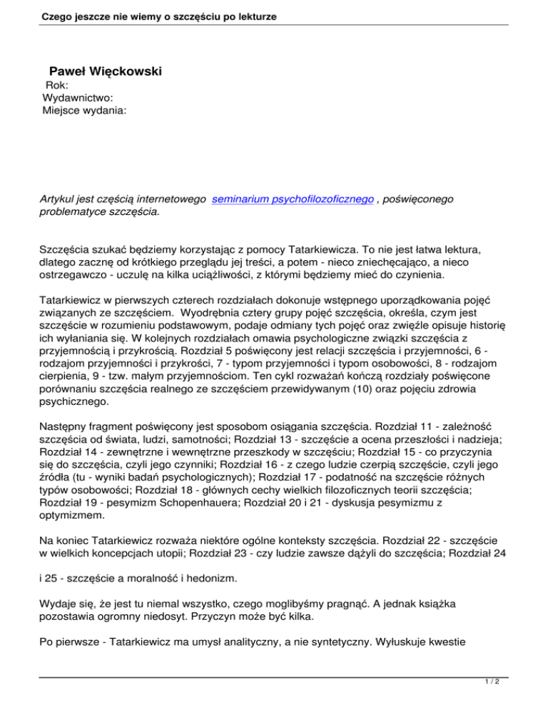 Czego jeszcze nie wiemy o szczęściu po lekturze Paweł Więckowski Rok: Wydawnictwo: Miejsce wydania: Artykul jest częścią internetowego seminarium psychofilozoficznego , poświęconego problematyce szczęścia. Szczęścia szukać będziemy korzystając z pomocy Tatarkiewicza. To nie jest łatwa lektura, dlatego zacznę od krótkiego przeglądu jej treści, a potem - nieco zniechęcająco, a nieco ostrzegawczo - uczulę na kilka uciążliwości, z którymi będziemy mieć do czynienia. Tatarkiewicz w pierwszych czterech rozdziałach dokonuje wstępnego uporządkowania pojęć związanych ze szczęściem. Wyodrębnia cztery grupy pojęć szczęścia, określa, czym jest szczęście w rozumieniu podstawowym, podaje odmiany tych pojęć oraz zwięźle opisuje historię ich wyłaniania się. W kolejnych rozdziałach omawia psychologiczne związki szczęścia z przyjemnością i przykrością. Rozdział 5 poświęcony jest relacji szczęścia i przyjemności, 6 rodzajom przyjemności i przykrości, 7 - typom przyjemności i typom osobowości, 8 - rodzajom cierpienia, 9 - tzw. małym przyjemnościom. Ten cykl rozważań kończą rozdziały poświęcone porównaniu szczęścia realnego ze szczęściem przewidywanym (10) oraz pojęciu zdrowia psychicznego. Następny fragment poświęcony jest sposobom osiągania szczęścia. Rozdział 11 - zależność szczęścia od świata, ludzi, samotności; Rozdział 13 - szczęście a ocena przeszłości i nadzieja; Rozdział 14 - zewnętrzne i wewnętrzne przeszkody w szczęściu; Rozdział 15 - co przyczynia się do szczęścia, czyli jego czynniki; Rozdział 16 - z czego ludzie czerpią szczęście, czyli jego źródła (tu - wyniki badań psychologicznych); Rozdział 17 - podatność na szczęście różnych typów osobowości; Rozdział 18 - głównych cechy wielkich filozoficznych teorii szczęścia; Rozdział 19 - pesymizm Schopenhauera; Rozdział 20 i 21 - dyskusja pesymizmu z optymizmem. Na koniec Tatarkiewicz rozważa niektóre ogólne konteksty szczęścia. Rozdział 22 - szczęście w wielkich koncepcjach utopii; Rozdział 23 - czy ludzie zawsze dążyli do szczęścia; Rozdział 24 i 25 - szczęście a moralność i hedonizm. Wydaje się, że jest tu niemal wszystko, czego moglibyśmy pragnąć. A jednak książka pozostawia ogromny niedosyt. Przyczyn może być kilka. Po pierwsze - Tatarkiewicz ma umysł analityczny, a nie syntetyczny. Wyłuskuje kwestie 1/2 Czego jeszcze nie wiemy o szczęściu po lekturze szczegółowe i starannie je analizuje, a potem poszczególne analizy łączy w rozdziały wg podobieństwa. Ale brak mu zmysłu całości, brak metafor, które podkreślałyby najważniejsze momenty przedsięwzięcia. Co gorsza, sam podział na rozdziały budzi wątpliwości, bo niektóre myśli powtarzają się w kilku rozdziałach. Podejrzewam, że gdyby Tatarkiewicz chciał napisać książkę o motoryzacji, wybrałby następujący schemat: najpierw wszystko o kołach, potem o kierownicach, potem o bagażnikach. W rezultacie wydaje się, że wszystko tam jest, tylko jakoś nie chce ruszyć. Po drugie - niestety - nie ma tam wszystkiego, choć tu winien jest czas. Przez ostatnie 50 lat pojawiło się w psychologii nieco istotnych teorii. Na przykład różne koncepcje potrzeb, które trzeba zaspokoić, aby się poczuć szczęśliwym (Maslow, Erikson). Tak samo związek szczęścia z różnymi typami osobowości (u Tatarkiewicza obecny, ale marginalnie) czy genetycznie zdeterminowana chemia mózgu. Brak też zupełnie rozważań, jak różne ustroje społeczne wpływają na poziom szczęścia obywateli. Po trzecie - Tatarkiewicz koncentruje się na definiowaniu i klasyfikowaniu zjawisk i pojęć, a nie na formułowaniu prawidłowości. Tymczasem istotę nauki stanowią więzi warunkowe, ujmowane w zdaniach "Jeżeli spełnione są warunki W, to zachodzi zjawisko Z". Rozważania Tatarkiewicza często dają się ująć w schemat: "Niektórzy ludzie są szczęśliwi tak, a niektórzy inaczej." To pewnie prawda, tyle że mało użyteczna, bo nie można się nią posłużyć ani do wyjaśniania, dlaczego jedni są szczęśliwi, a inni nie, ani do podnoszenia poziomu szczęścia. I wreszcie - po czwarte - styl. Tatarkiewicza charakteryzuje intelektualna elegancja, ale brak w nim większych emocji. W ten sposób można świetnie napisać o samochodach czy filozofii matematyki, jednak o euforii i rozpaczy przydałoby się pisać w sposób żywszy. Koniec końców książkę zamyka się z odczuciem, że poruszonych zostało wiele ważnych problemów, a niewiele z tego wynikło. Na moje pytanie o książki na temat szczęścia kilka osób odpowiedziało bez wahania -"Tatarkiewicz" - po czym dodawało - "Książkę przeczytałem, ale nic z niej nie zapamiętałem". I to jest istota problemu - czytając Tatarkiewicza trzeba się przede wszystkim zastanawiać, czego tam brakuje, czyli czego o szczęściu jeszcze nie wiemy. Autor jest doktorem filozofii. Prowadzi internetowe seminarium psychofilozoficzne , poświęcone problematyce szczęścia. Autor zaprasza do dyskusji na temat szczęścia na forum dyskusyjnym . 2/2