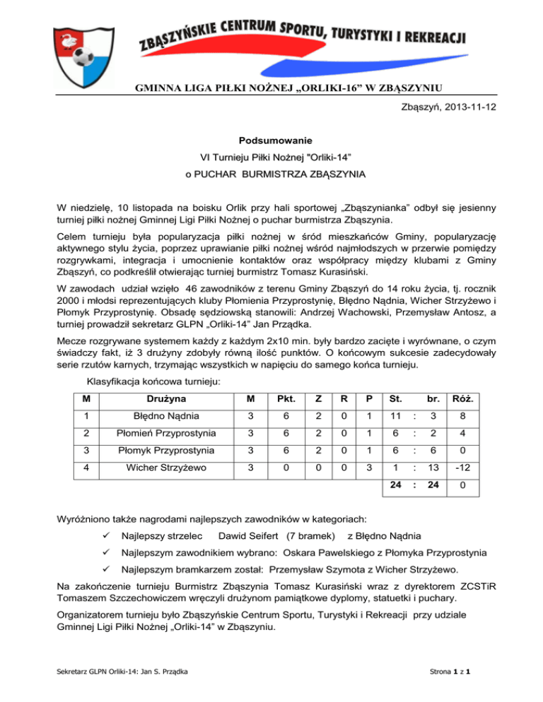 GMINNA LIGA PIŁKI NOŻNEJ „ORLIKI-16” W ZBĄSZYNIU Zbąszyń, 2013-11-12 Podsumowanie VI Turnieju Piłki Nożnej "Orliki-14” o PUCHAR BURMISTRZA ZBĄSZYNIA W niedzielę, 10 listopada na boisku Orlik przy hali sportowej „Zbąszynianka” odbył się jesienny turniej piłki nożnej Gminnej Ligi Piłki Nożnej o puchar burmistrza Zbąszynia. Celem turnieju była popularyzacja piłki nożnej w śród mieszkańców Gminy, popularyzację aktywnego stylu życia, poprzez uprawianie piłki nożnej wśród najmłodszych w przerwie pomiędzy rozgrywkami, integracja i umocnienie kontaktów oraz współpracy między klubami z Gminy Zbąszyń, co podkreślił otwierając turniej burmistrz Tomasz Kurasiński. W zawodach udział wzięło 46 zawodników z terenu Gminy Zbąszyń do 14 roku życia, tj. rocznik 2000 i młodsi reprezentujących kluby Płomienia Przyprostynię, Błędno Nądnia, Wicher Strzyżewo i Płomyk Przyprostynię. Obsadę sędziowską stanowili: Andrzej Wachowski, Przemysław Antosz, a turniej prowadził sekretarz GLPN „Orliki-14” Jan Prządka. Mecze rozgrywane systemem każdy z każdym 2x10 min. były bardzo zacięte i wyrównane, o czym świadczy fakt, iż 3 drużyny zdobyły równą ilość punktów. O końcowym sukcesie zadecydowały serie rzutów karnych, trzymając wszystkich w napięciu do samego końca turnieju. Klasyfikacja końcowa turnieju: M Drużyna M Pkt. Z R P St. br. Róż. 1 Błędno Nądnia 3 6 2 0 1 11 : 3 8 2 Płomień Przyprostynia 3 6 2 0 1 6 : 2 4 3 Płomyk Przyprostynia 3 6 2 0 1 6 : 6 0 4 Wicher Strzyżewo 3 0 0 0 3 1 : 13 -12 24 : 24 0 Wyróżniono także nagrodami najlepszych zawodników w kategoriach: z Błędno Nądnia Najlepszy strzelec Najlepszym zawodnikiem wybrano: Oskara Pawelskiego z Płomyka Przyprostynia Najlepszym bramkarzem został: Przemysław Szymota z Wicher Strzyżewo. Dawid Seifert (7 bramek) Na zakończenie turnieju Burmistrz Zbąszynia Tomasz Kurasiński wraz z dyrektorem ZCSTiR Tomaszem Szczechowiczem wręczyli drużynom pamiątkowe dyplomy, statuetki i puchary. Organizatorem turnieju było Zbąszyńskie Centrum Sportu, Turystyki i Rekreacji przy udziale Gminnej Ligi Piłki Nożnej „Orliki-14” w Zbąszyniu. Sekretarz GLPN Orliki-14: Jan S. Prządka Strona 1 z 1
