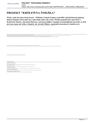 PROJEKT "KRÓLEWNA ŚNIEŻKA" Autor: Adres: http://www.wrotalubuskie.eu/PL/426/1235/PROJEKT__KROLEWNA_SNIEZKA/k/ PROJEKT "KRÓLEWNA ŚNIEŻKA" Wiele, wiele lat temu dwaj bracia - Wilhelm i Jakub Grimm wymyślili i spisali historię pięknej, dobrej Śnieżki, którą dziś zna i opowiada sobie cały świat. Wielka popularność opowieści o Królewnie Śnieżce, okrutnej Macosze, zatrutym jabłku i siedmiu krasnoludkach sprawiła, że dziś jest ona znana nie tylko z książek, ale również filmów, spektakli teatralnych i baletowych. CEA‒Filharmonia Gorzowska postanawia dołączyć do grona miłośników tej niezwykłej historii i zaprasza do udziału we wspólnej zabawie, jaką będzie realizacja napisanego przez Jana Krutula musicalu „Królewna Śnieżka”! Połączone siły najmłodszych wykonawców, doświadczonych śpiewaków i tancerzy, muzyków Orkiestry Filharmonii Gorzowskiej oraz profesjonalnej ekipy realizatorskiej złożą się na wyjątkowy efekt końcowy, jakim będzie wystawienie muzycznej bajki o Królewnie Śnieżce na estradzie gorzowskiej filharmonii. Realizatorem musicalu „Królewna Śnieżka” jest CEA‒Filharmonia Gorzowska. Autorem musicalu „Królewna Śnieżka” oraz koncepcji artystycznej projektu jest Jan Krutul. Musical „Królewna Śnieżka” to inicjatywa artystyczna i edukacyjna, której przyświeca idea BUDZENIA i ROZWIJANIA TALENTÓW. Udziałem w projekcie chcemy zainteresować przede wszystkim młodych ludzi, którzy czują w sobie pasję wokalną i taneczną, do tej pory nie mieli okazji się nią pochwalić oraz szansy, aby ją rozwinąć i marzą o tym, by wreszcie pokazać, jak wielki talent w sobie kryją. Zapraszamy również tych wszystkich, którzy nie są pewni do końca swoich możliwości. Do ról w musicalu szukać będziemy osób pozytywnych, kreatywnych i chętnych na przygodę z muzyką oraz sceną. W poszukiwaniach pomogą nam castingi, na których każdy indywidualnie będzie mógł zaprezentować swoje umiejętności. W taki oto sposób wyłonimy nasz „dream-team”, który następnie rozpocznie cieżką pracę nad przygotowaniem muzycznej wersji „Królewny Śnieżki”. Naszych najmłodszych artystów do ich scenicznego debiutu przygotują znakomici specjaliści w dziedzinie śpiewu i tańca. W trakcie przygotowań do musicalu będzie również czas na pracę z zawodową orkiestrą, solistami – śpiewakami i dyrygentem. Przygotowanie musicalu „Królewna Śnieżka” będzie składało się z kilku etapów: 13-14 września / CASTINGI czyli prezentacje wokalne i taneczne, podczas których wyłonimy „NAJLEPSZYCH” (sugerowany przedział wiekowy kandydatów to 9-15 lat). Poszukiwać będziemy osób, które wcielą się w role małej Śnieżki i krasnoludków oraz chórzystów i tancerzy. Rejestracja uczestników od godziny 9:00. październik-listopad / WARSZTATY czyli czas intensywnej pracy wokalnej i choreograficznej naszych młodych wykonawców pod okiem specjalistów od śpiewu i tańca. listopad / PRÓBY DO MUSICALU czyli przygotowania premiery musicalu pod okiem reżysera, podczas których każdy daje z siebie wszystko albo jeszcze więcej. 2-4 grudnia / PRÓBY GENERALNE czyli dopinanie wszystkiego na ostatni guzik; to próby sceniczne z udziałem wszystkich wykonawców: „młodej kadry”, solistów, orkiestry i dyrygenta. 5 grudnia /POKAZY PRZEDPREMIEROWE czyli pierwsze koty za płoty – nasz musical podczas trzech koncertów w CEA‒Filharmonii Gorzowskiej obejrzą pierwsi widzowie – adepci przedszkoli i szkół. 7 grudnia / MIKOŁAJKOWA PREMIERA MUSICALU czyli oficjalna premiera „Królewny Snieżki” w Filharmonii Gorzowskiej, w ramach cyklu Koncertów Familijnych. strona 1 / 1 Powered by TCPDF (www.tcpdf.org)