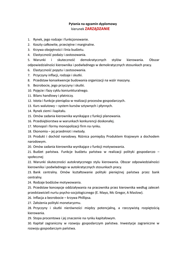 Pytania na egzamin dyplomowy kierunek ZARZĄDZANIE 1. Rynek, jego rodzaje i funkcjonowanie. 2. Koszty całkowite, przeciętne i marginalne. 3. Krzywa obojętności i linia budżetu. 4. Elastyczność podaży i zastosowania. 5. Warunki i skuteczność demokratycznych stylów kierowania. Obszar odpowiedzialności kierownika i podwładnego w demokratycznych stosunkach pracy. 6. Elastyczność popytu i zastosowania. 7. Przyczyny inflacji, rodzaje i skutki. 8. Przedstaw konsekwencje budowania organizacji na wzór maszyny. 9. Bezrobocie, jego przyczyny i skutki. 10. Pojęcie i fazy cyklu koniunkturalnego. 11. Bilans handlowy i płatniczy. 12. Istota i funkcje pieniądza w realizacji procesów gospodarczych. 13. Kurs walutowy – system kursów sztywnych i płynnych. 14. Rynek ziemi i kapitału. 15. Omów zadania kierownika wynikające z funkcji planowania. 16. Przedsiębiorstwa w warunkach konkurencji doskonałej. 17. Monopol i formy monopolizacji firm na rynku. 18. Ekonomia – jej przedmiot i metody. 19. Produkt i dochód narodowy. Różnica pomiędzy Produktem Krajowym a dochodem narodowym. 20. Omów zadania kierownika wynikające z funkcji motywowania. 21. Budżet państwa. Funkcje budżetu państwa w realizacji polityki gospodarczo – społecznej 22. Warunki skuteczności autokratycznego stylu kierowania. Obszar odpowiedzialności kierownika i podwładnego w autokratycznych stosunkach pracy. 23. Bank centralny. Omów kształtowanie polityki pieniężnej państwa przez bank centralny. 24. Rodzaje bodźców motywowania. 25. Przedstaw koncepcje oddziaływania na pracownika przez kierownika według zaleceń przedstawicieli nurtu psycho-socjologicznego (E. Mayo, Mc Gregor, A Maslow). 26. Inflacja a bezrobocie – krzywa Phillipsa. 27. Założenia polityki monetaryzmu. 28. Przyczyny i skutki nierówności między potencjalną, a rzeczywistą rozpiętością kierowania. 29. Stopa procentowa i jej znaczenie na rynku kapitałowym. 30. Kapitał zagraniczny w rozwoju gospodarczym państwa. Inwestycje zagraniczne w rozwoju gospodarczym państwa.