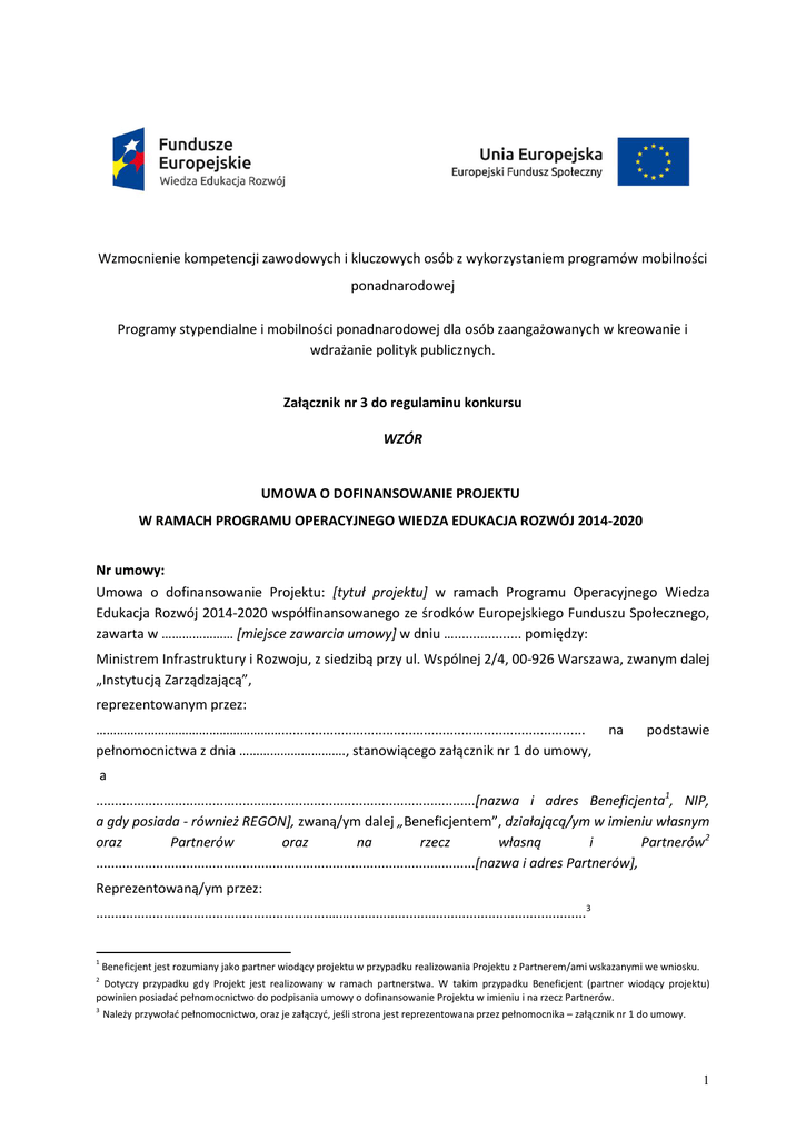 Wzmocnienie kompetencji zawodowych i kluczowych osób z wykorzystaniem programów mobilności ponadnarodowej Programy stypendialne i mobilności ponadnarodowej dla osób zaangażowanych w kreowanie i wdrażanie polityk publicznych. Załącznik nr 3 do regulaminu konkursu WZÓR UMOWA O DOFINANSOWANIE PROJEKTU W RAMACH PROGRAMU OPERACYJNEGO WIEDZA EDUKACJA ROZWÓJ 2014-2020 Nr umowy: Umowa o dofinansowanie Projektu: [tytuł projektu] w ramach Programu Operacyjnego Wiedza Edukacja Rozwój 2014-2020 współfinansowanego ze środków Europejskiego Funduszu Społecznego, zawarta w ………………… [miejsce zawarcia umowy] w dniu ….................. pomiędzy: Ministrem Infrastruktury i Rozwoju, z siedzibą przy ul. Wspólnej 2/4, 00-926 Warszawa, zwanym dalej „Instytucją Zarządzającą”, reprezentowanym przez: ………………………………………………................................................................................. pełnomocnictwa z dnia …………………………., stanowiącego załącznik nr 1 do umowy, na podstawie a .....................................................................................................[nazwa i adres Beneficjenta1, NIP, a gdy posiada - również REGON], zwaną/ym dalej „Beneficjentem”, działającą/ym w imieniu własnym oraz Partnerów oraz na rzecz własną i Partnerów2 .....................................................................................................[nazwa i adres Partnerów], Reprezentowaną/ym przez: ..............................................................……...............................................................3 1 Beneficjent jest rozumiany jako partner wiodący projektu w przypadku realizowania Projektu z Partnerem/ami wskazanymi we wniosku. 2 Dotyczy przypadku gdy Projekt jest realizowany w ramach partnerstwa. W takim przypadku Beneficjent (partner wiodący projektu) powinien posiadać pełnomocnictwo do podpisania umowy o dofinansowanie Projektu w imieniu i na rzecz Partnerów. 3 Należy przywołać pełnomocnictwo, oraz je załączyć, jeśli strona jest reprezentowana przez pełnomocnika – załącznik nr 1 do umowy. 1 § 1. Ilekroć w umowie jest mowa o: 1) „danych osobowych” oznacza to dane osobowe w rozumieniu ustawy z dnia 29 sierpnia 1997 r. o ochronie danych osobowych (Dz. U. z 2014 r. poz. 1182, z późn. zm.), zwanej dalej „ustawą o ochronie danych osobowych”, dotyczące uczestników Projektu, które muszą być przetwarzane przez Instytucję Zarządzającą oraz Beneficjenta; 2) „Działaniu” oznacza to Działanie 4.2 Programy Mobilności ponadnarodowej; 3) „Instytucji Zarządzającej” oznacza to ministra właściwego do spraw rozwoju regionalnego 4) „okresie rozliczeniowym” oznacza to okres …………4; 5) „Osi Priorytetowej” oznacza to Oś IV „Innowacje społeczne i współpraca ponadnarodowa”; 6) „Programie” oznacza to Program Operacyjny Wiedza Edukacja Rozwój 2014-2020 przyjęty decyzją wykonawczą Komisji z dnia 17 grudnia 2014 r. przyjmującą niektóre elementy programu operacyjnego „Wiedza, Edukacja, Rozwój 2014-2020” do wsparcia z Europejskiego Funduszu Społecznego i szczególnej alokacji na Inicjatywę na rzecz zatrudnienia ludzi młodych w ramach celu „Inwestycje na rzecz wzrostu i zatrudnienia” w Polsce nr C(2014) 10129; 7) „Projekcie” oznacza to projekt pt. [tytuł projektu] realizowany w ramach Działania określony we wniosku o dofinansowanie projektu nr .................., zwanym dalej „Wnioskiem”, stanowiącym załącznik nr 2 do umowy; 8) „przetwarzaniu danych osobowych” oznacza to jakiekolwiek operacje wykonywane na danych osobowych, takie jak zbieranie, utrwalanie, przechowywanie, opracowywanie, zmienianie, udostępnianie i usuwanie; 9) „SL2014” oznacza to centralny system teleinformatyczny wykorzystywany w procesie rozliczania Projektu oraz komunikowania z Instytucją Zarządzającą; 10) „stronie internetowej Instytucji Zarządzającej” oznacza to stronę internetową pod adresem: www.power.gov.pl; 11) „uczestniku Projektu” oznacza to uczestnika projektu w rozumieniu Wytycznych Ministra Infrastruktury i Rozwoju w zakresie monitorowania postępu rzeczowego realizacji programów operacyjnych na lata 2014-2020, zwanych dalej „Wytycznymi w zakresie monitorowania”, zamieszczonych na stronie internetowej Instytucji Zarządzającej; 12) „ustawie Pzp” oznacza to ustawę z dnia 29 stycznia 2004 r. – Prawo zamówień publicznych (Dz. U. z 2013 r. poz. 907, z późn. zm.); 13) „wydatkach kwalifikowalnych” oznacza to wydatki kwalifikowalne zgodnie z Wytycznymi Ministra Infrastruktury i Rozwoju w zakresie kwalifikowalności wydatków w ramach Europejskiego Funduszu Rozwoju Regionalnego, Europejskiego Funduszu Społecznego oraz Funduszu Spójności na lata 2014-2020, zwanymi dalej „Wytycznymi w zakresie kwalifikowalności”, zamieszczonymi na stronie internetowej Instytucji Zarządzającej. 4 Należy podać miesiąc lub kwartał lub inny okres rozliczeniowy, przy czym nie może być on dłuższy niż kwartał. W przypadku pierwszego wniosku o płatność okres ten może być dłuższy, jeśli umowa zostanie podpisana po okresie rozpoczęcia realizacji Projektu. 2 Przedmiot umowy § 2. 1. Na warunkach określonych w umowie oraz zgodnie z art. 127 ust.5 pkt 2 i art. 150 ustawy o finansach publicznych, Instytucja Zarządzająca przyznaje Beneficjentowi dofinansowanie na realizację Projektu, a Beneficjent wraz z Partnerami zobowiązuje/ą się do jego realizacji. 2. Łączna wysokość wydatków kwalifikowalnych Projektu wynosi …… zł (słownie: …) i obejmuje: 1) dofinansowanie, z następujących źródeł: a) ze środków europejskich w kwocie … zł (słownie: …), co stanowi … % wydatków kwalifikowalnych Projektu, b) ze środków dotacji celowej w kwocie … zł (słownie: …); 2) wkład własny w kwocie … zł (słownie …), z następujących 