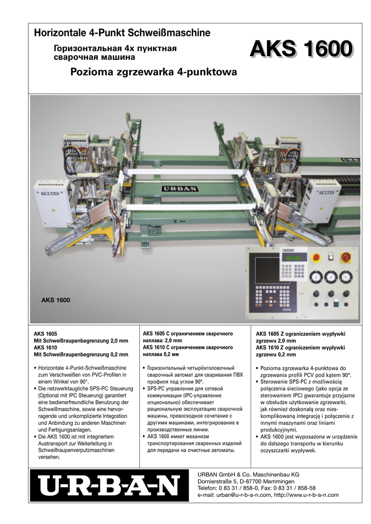 Horizontale 4-Punkt Schweißmaschine AKS 1600 Горизонтальная 4х пунктная сварочная машина Pozioma zgrzewarka 4-punktowa AKS 1600 AKS 1605 Mit Schweißraupenbegrenzung 2,0 mm AKS 1610 Mit Schweißraupenbegrenzung 0,2 mm AKS 1605 С ограничением сварочного наплава: 2,0 mm AKS 1610 С ограничением сварочного наплава 0,2 мм AKS 1605 Z ograniczeniem wypływki zgrzewu 2,0 mm AKS 1610 Z ograniczeniem wypływki zgrzewu 0,2 mm • Horizontale 4-Punkt-Schweißmaschine zum Verschweißen von PVC-Profilen in einem Winkel von 90°. • Die netzwerktaugliche SPS-PC Steuerung (Optional mit IPC Steuerung) garantiert eine bedienerfreundliche Benutzung der Schweißmaschine, sowie eine hervorragende und unkomplizierte Integration und Anbindung zu anderen Maschinen und Fertigungsanlagen. • Die AKS 1600 ist mit integriertem Austransport zur Weiterleitung in Schweißraupenverputzmaschinen versehen. • Горизонтальный четырёхголовочный сварочный автомат для сваривания ПВХ профиля под углом 90°. • SPS-PC управление для сетевой коммуникации (IPC-управление опционально) обеспечивает рациональную эксплуатацию сварочной машины, превосходное сочетание с другими машинами, интегрирование в производственные линии. • AKS 1600 имеет механизм транспортирования сваренных изделий для передачи на очистные автоматы. • Pozioma zgrzewarka 4-punktowa do zgrzewania profili PCV pod kątem 90°. • Sterowanie SPS-PC z możliwością połączenia sieciowego (jako opcja ze sterowaniem IPC) gwarantuje przyjazne w obsłudze użytkowanie zgrzewarki, jak również doskonałą oraz nieskomplikowaną integrację i połączenie z innymi maszynami oraz liniami produkcyjnymi. • AKS 1600 jest wyposażona w urządzenie do dalszego transportu w kierunku oczyszczarki wypływek. URBAN GmbH & Co. Maschinenbau KG Dornierstraße 5, D-87700 Memmingen Telefon: 0 83 31 / 858-0, Fax: 0 83 31 / 858-58 e-mail: [email protected], http://www.u-r-b-a-n.com • Bei Schweißraupenbegrenzung auf 0,2 mm (AKS 1610) sind die Quetschplatten beheizt und mit nichtrostenden Stahlmessern ausgestattet. • Alle bewährten Zusätze wie Dichtungsniederhalter, rationelle Teflonwechselsysteme und verschiedene Zulagenwechselsysteme sind selbstverständlich auch bei dieser neuen Generation von Schweißmaschinen erhältlich. • Wie jahrelang bewährt, sind auch hier gleiche Module wie in unseren anderen Maschinen wiederverwendet worden. Das und die leichte Zugänglichkeit der einzelnen Bauteile garantiert eine leichte Wartung. • Sämtliche Schweißparameter, wie Schweißtemperatur, Anwärmzeit, Angleichdruck, Fügedruck, Fügezeit und Spanndruck sind einzeln einstellbar. • Die Schweißtemperatur wird durch unsere perfekt aufeinander abgestimmten Temperaturregler und Heizelemente stetig überwacht. • Automatische Anpassung der Angleichzeit an die verschiedenen Profilquerschnitte. • Elektronische Positionierung der X-Y Achsen durch Gleichstrom Servomotoren. • Allen Sicherheitsvorschriften ist natürlich Rechnung getragen, wie Lichtschranken, CE, EMV, usw. • При ограничении сварочного наплава 0,2 мм (AKS 1610) машина оснащена обогреваемыми фиксирующими платами и ограничителями из нержавеющей стали. • Все дополнения, как например, формирователи уплотнителей, рациональная смена тефлона - в новом поколении сварочных машин конечно же возможны. • В машине применяются те же модули, уже хорошо зарекомендовавшие себя на наших предыдущих машинах. Это и доступное расположение узлов обеспечивают удобное обслуживание. • Все сварочные параметры, как температура, время разогрева, давление выравнивания, давление стыка, время стыка и давление фиксирования настраиваются индивидуально. • Температура сваривания постоянно отслеживается регуляторами температуры и нагревательными элементами, которые согласованы друг с другом. • Автоматическая адаптация времени выравнивания к различному сечению профиля. • Электронное позиционирование осей X-Y. • Все предписания техники безопасности учтены: световые шлагбаумы, CE, EMV, и т.д. • Przy ograniczeniu wypływki zgrzewu 0,2 mm (AKS 1610) płyty dociskowe są podgrzewane i wyposażone w nierdzewne stalowe noże. • Wszystkie sprawdzone dodatki jak dociskacz uszczelki, racjonalny system wymiany teflonu oraz różne systemy wymiany podpór są dostępne również w przypadku tej nowej generacji zgrzewarek. • Na podstawie wieloletnich doświadczeń zastosowano tutaj ponownie takie same moduły jak w innych naszych maszynach. To jak również łatwy dostęp do poszczególnych elementów konstrukcji gwarantuje bezproblemową konserwację. • Wszystkie parametry zgrzewania, takie jak temperatura zgrzewania, czas nagrzewania, nacisk na profile, nacisk oraz czas zgrzewania można ustawić oddzielnie. • Temperatura zgrzewania jest