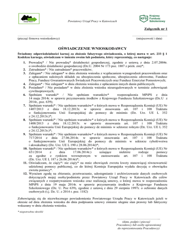 Powiatowy Urząd Pracy w Katowicach Załącznik nr 1 ……………………………. (pieczęć firmowa wnioskodawcy) ……………………………. (miejscowość i data) OŚWIADCZENIE WNIOSKODAWCY Świadomy odpowiedzialności karnej za złożenie fałszywego oświadczenia, o której mowa w art. 233 § 1 Kodeksu karnego, oświadczam w imieniu swoim lub podmiotu, który reprezentuję, co następuje: 1. Prowadzę* / Nie prowadzę* działalności gospodarczej, zgodnie z ustawą z dnia 2.07.2004r. o swobodzie działalności gospodarczej (Dz.U. 2004 Nr 173 poz. 1807 z późń. zm)*; 2. Zatrudniam* / Nie zatrudniam* pracowników; 3. Zalegam* / Nie zalegam* w dniu złożenia wniosku z wypłacaniem wynagrodzeń pracownikom oraz z opłacaniem należnych składek na ubezpieczenia społeczne, ubezpieczenia zdrowotne, Fundusz Pracy, Fundusz Gwarantowanych Świadczeń Pracowniczych oraz Fundusz Emerytur Pomostowych; 4. Zalegam* / Nie zalegam* w dniu złożenia wniosku z opłacaniem innych danin publicznych; 5. Posiadam* / Nie posiadam* w dniu złożenia wniosku nieuregulowanych w terminie zobowiązań cywilnoprawnych; 6. Spełniam warunki* / Nie spełniam warunków* rozporządzenia MPiPS z dnia 14 maja 2014r. w sprawie przyznawania środków z Krajowego Funduszu Szkoleniowego (Dz.U z 2014r., poz. 639); 7. Spełniam warunki* / Nie spełniam warunków* o których mowa w Rozporządzeniu Komisji (UE) Nr 1407/2013 z dnia 18.12.2013r. w sprawie stosowania art. 107 i 108 Traktatu o funkcjonowaniu Unii Europejskiej do pomocy de minimis (Dz. Urz. UE L 352 z 24.12.2013r.)*; 8. Spełniam warunki* / Nie spełniam warunków* o których mowa w Rozporządzeniu Komisji (UE) Nr 1408/2013 z dnia 18.12.2013r. w sprawie stosowania art. 107 i 108 Traktatu o funkcjonowaniu Unii Europejskiej do pomocy de minimis w sektorze rolnym (Dz. Urz. UE L 352 z 24.12.2013r.)*; 9. Spełniam warunki* / Nie spełniam warunków* o których mowa w Rozporządzeniu Komisji (UE) Nr 717/2014 z dnia 27.06.2014r. w sprawie stosowania art. 107 i 108 Traktatu o funkcjonowaniu Unii Europejskiej do pomocy de minimis w sektorze rybołówstwa i akwakultury (Dz. Urz. UE L 190 z 28.06.2014r)*; 10. Spełniam warunki* / Nie spełniam warunków* o których mowa w Rozporządzeniu Komisji (UE) Nr 651/2014 z dnia 17.06.2014r.) uznające niektóre rodzaje pomocy za zgodne z rynkiem wewnętrznym w zastosowaniu art. 107 i 108 Traktatu (Dz. Urz. UE L 187 z 26.06.2014r)*; 11. Oświadczam, że ciąży*/ nie ciąży* na mnie obowiązek zwrotu kwoty stanowiącej równowartość udzielonej pomocy publicznej, co do której Komisja Europejska wydała decyzję o obowiązku zwrotu pomocy*. 12. Wyrażam zgodę na zbieranie, przetwarzanie, udostępnianie i archiwizowanie danych osobowych dotyczących mojej osoby/podmiotu przez Powiatowy Urząd Pracy w Katowicach dla celów związanych z rozpatrywaniem wniosku oraz realizacją umowy, o której mowa w rozporzadzeniu MPiPS z dnia 19 maja 2014r. w sprawie przyznawania środków z Krajowego Funduszu Szkoleniowego (Dz. U. Poz 639), zgodnie z ustawą z dnia 29 sierpnia 1997r. o ochronie danych osobowych (t.j. Dz. U. z 2014 r. poz. 1182) Zobowiązuję się do niezwłocznego powiadomienia Powiatowego Urzędu Pracy w Katowicach jeżeli w okresie od dnia złożenia wniosku do dnia podpisania umowy zmianie ulegnie stan prawny lub faktyczny wskazany w dniu złożenia wniosku. * niepotrzebne skreślić …………………………………... (data, podpis i pieczęć Pracodawcy lub osoby uprawnionej do reprezentowania Pracodawcy)