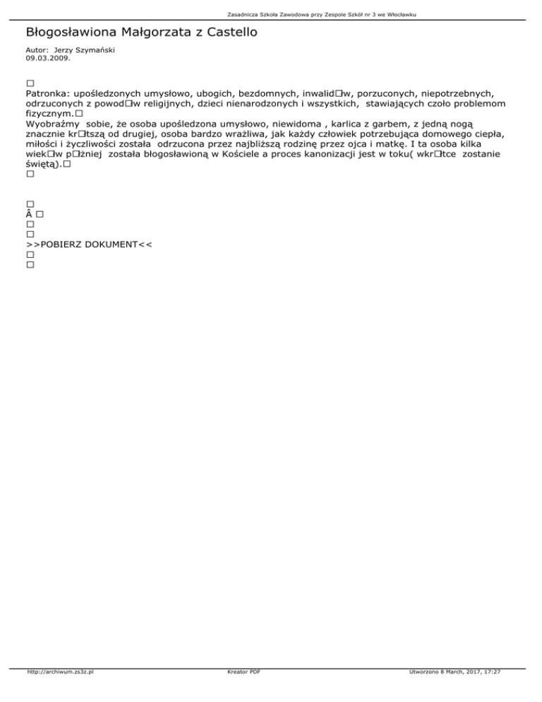 Zasadnicza Szkoła Zawodowa przy Zespole Szkół nr 3 we Włocławku Błogosławiona Małgorzata z Castello Autor: Jerzy Szymański 09.03.2009. Patronka: upośledzonych umysłowo, ubogich, bezdomnych, inwalidÃłw, porzuconych, niepotrzebnych, odrzuconych z powodÃłw religijnych, dzieci nienarodzonych i wszystkich, stawiających czoło problemom fizycznym. Wyobraźmy sobie, że osoba upośledzona umysłowo, niewidoma , karlica z garbem, z jedną nogą znacznie krÃłtszą od drugiej, osoba bardzo wrażliwa, jak każdy człowiek potrzebująca domowego ciepła, miłości i życzliwości została odrzucona przez najbliższą rodzinę przez ojca i matkę. I ta osoba kilka wiekÃłw pÃłżniej została błogosławioną w Kościele a proces kanonizacji jest w toku( wkrÃłtce zostanie świętą). Â >>POBIERZ DOKUMENT<< http://archiwum.zs3z.pl Kreator PDF Utworzono 8 March, 2017, 17:27