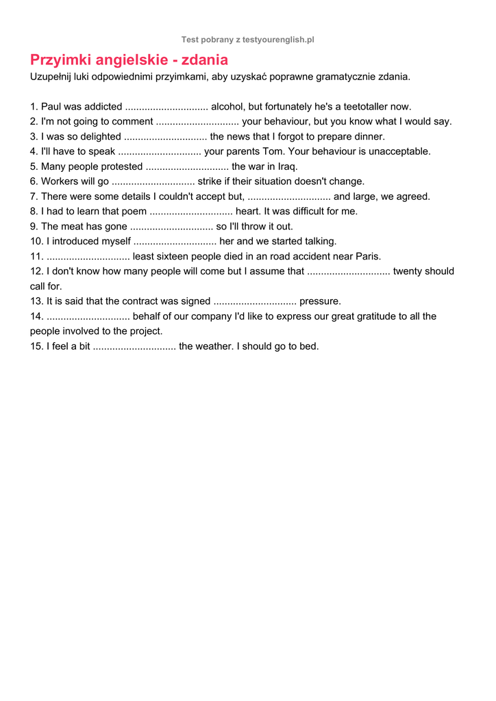 Test pobrany z testyourenglish.pl Przyimki angielskie - zdania Uzupełnij luki odpowiednimi przyimkami, aby uzyskać poprawne gramatycznie zdania. 1. Paul was addicted .............................. alcohol, but fortunately he's a teetotaller now. 2. I'm not going to comment .............................. your behaviour, but you know what I would say. 3. I was so delighted .............................. the news that I forgot to prepare dinner. 4. I'll have to speak .............................. your parents Tom. Your behaviour is unacceptable. 5. Many people protested .............................. the war in Iraq. 6. Workers will go .............................. strike if their situation doesn't change. 7. There were some details I couldn't accept but, .............................. and large, we agreed. 8. I had to learn that poem .............................. heart. It was difficult for me. 9. The meat has gone .............................. so I'll throw it out. 10. I introduced myself .............................. her and we started talking. 11. .............................. least sixteen people died in an road accident near Paris. 12. I don't know how many people will come but I assume that .............................. twenty should call for. 13. It is said that the contract was signed .............................. pressure. 14. .............................. behalf of our company I'd like to express our great gratitude to all the people involved to the project. 15. I feel a bit .............................. the weather. I should go to bed.