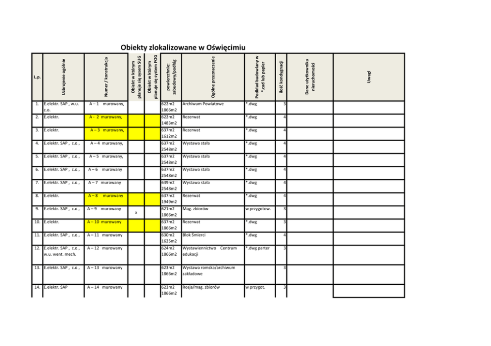 1. E.elektr. SAP , w.u. c.o. A – 1 murowany, 622m2 1866m2 Archiwum Powiatowe *.dwg 3 2. E.elektr. A - 2 murowany, 622m2 1483m2 Rezerwat *.dwg 4 3. E.elektr. A – 3 murowany, 637m2 1612m2 Rezerwat *.dwg 4 4. E.elektr. SAP , c.o., A – 4 murowany, 637m2 2548m2 Wystawa stała *.dwg 4 5. E.elektr. SAP , c.o., A – 5 murowany, 637m2 2548m2 Wystawa stała *.dwg 4 6. E.elektr. SAP , c.o., A – 6 murowany 637m2 2548m2 Wystawa stała *.dwg 4 7. E.elektr. SAP , c.o., A – 7 murowany 639m2 2548m2 Wystawa stała *.dwg 4 8. E.elektr. A–8 637m2 1949m2 Rezerwat *.dwg 4 9. E.elektr. SAP , c.o., A – 9 murowany 621m2 1866m2 Mag. zbiorów w przygotow. 3 murowany x 10. E.elektr. A – 10 murowany 637m2 1866m2 Rezerwat *.dwg 3 11. E.elektr. SAP , c.o., A – 11 murowany 630m2 1625m2 Blok Śmierci *.dwg 4 12. E.elektr. SAP , c.o., w.u. went. mech. A – 12 murowany 624m2 1866m2 Wystawiennictwo Centrum edukacji *.dwg parter 3 13. E.elektr. SAP , c.o., A – 13 murowany 623m2 1866m2 Wystawa romska/archiwum zakładowe 14. E.elektr. SAP A – 14 murowany 623m2 1866m2 Rosja/mag. zbiorów 3 w przygot. 3 Uwagi Dane użytkownika nieruchomości ilość kondygnacji Podkład budowlany w *.cad lub papier Ogólne przeznaczenie powierzchnie: zabudowy/podłóg Obiekt w którym planuje się system FOG L.p. Obiekt w którym planuje się sysem SUG Uzbrojenie ogólnie Numer / konstrukcja Obiekty zlokalizowane w Oświęcimiu 15. E.elektr. A – 15 murowany 636m2 2548m2 Polska 4 16. E.elektr. SAP . A – 16 murowany 635m2 2548m2 Czesi i Słowacy 4 17. E.elektr. A – 17 murowany 641m2 2548m2 Austria i Jugosławia 4 18. E.elektr. SAP , c.o., w.u. A – 18 murowany 635m2 2548m2 Węgry/mag. zbiorów 19. E.elektr. SAP , c.o. went. mech. klimat. A – 19 murowany 624m2 1869m2 Mag. zbiorów 20. E.elektr. SAP , c.o. A – 20 murowany 624m2 1246m2 Francja i Belgia 21. E.elektr. SAP , c.o. A – 21 murowany 623m2 1869m2 Włochy i Holandia 22. E.elektr. SAP , c.o., w.u. A – 22 murowany 625m2 1872m2 Firmy i sprzątaczki 23. E.elektr. SAP , c.o., w.u. A –23 murowany 625m2 1869m2 Dział naukowy biblioteka 3 24. E.elektr. SAP , c.o., w.u. klimat. A – 24 murowany 634m2 1919m2 Archiwum 4 25. E.elektr. SAP , c.o., w.u. klimat. SUG 1/8 A – 25 murowany 637m2 1865m2 Zbiory 4 26. E.elektr. SAP , c.o. A – 26 murowany 637m2 623m2 Mag zbiorów 3 27. E.elektr. SAP , c.o., w.u. A – 27 murowany 637m2 1860m2 martyrologi żydów 28. E.elektr. A – 28 murowany 637m2 1920m2 Rezerwat 29. E.elektr. SAP , w.u. A – 29 drewniany 531m2 516m2 Nowa pralnia drewniany 30. E.elektr. SAP , c.o., w.u. A – 31 murowany 2334m2 2434m2 Kuchnia obozowa Budynek murowany 31. E.elektr. SAP A – 32 drewniany 390m2 389m2 Paczkarnia 1 m2 drewniany budka kaduka 32. x x x A-34 drewniany x *.dwg piwnice 4 3 *.dwg 3 3 *.dwg *.dwg 3 4 4 Barak Barak drewniany w przygotowani 3 *.dwg 3 1 1 33. E.elektr. A –35 drewniany 430m2 390m2 Czarny barak duży drewniany 1 34. E.elektr. A –36 drewniany 257m2 265m2 Czarny barak mały drewniany 1 35. E.elektr. SAP , c.o., w.u. A –37 murowany 679m2 686m2 Garaże murowany 2 36. E.elektr. A –39 murowany 256m2 266m2 Parnik murowany 37. E.elektr. A –40 murowany 426m2 430m2 Kuźnia murowany 38. E.elektr. SAP , c.o., w.u. A – 44 murowany 638m2 1949m2 Administracyjny Budynek murowany 39. E.elektr. SAP , c.o., w.u. gaz A – 45 murowany 637m2 1887m2 Mieszkalny 1 murowany 40. E.elektr. SAP , c.o., w.u., gaz A – 46 murowany 630m2 2544m2 Mieszkalny 2 murowany Budynek 4 41. E.elektr. SAP , c.o., w.u. A –47 murowany 74m2 100m2 Biały Domek murowany Budynek 2 42. E.elektr. SAP , A –48 drewniany 305m2 295m2 Blockfuhrerstube Barak drewniany 2 43. E.elektr. A –49 murowany 388m2 388m2 Krematorium 1 1 44. E.elektr. SAP , c.o., w.u., went. mech. 45. E.elektr. w.u. A –50 Obiekt muzealny A –50 Wartownia x Budynek Budynek 2 Budynek 1 *.dwg Budynek 4 3 6079m2 Aufnahmegebaude Ośrodek 19503m2 Obsługi Turystów wschód w*.dwg, południe papier 4 37m2 27m2 Wartownia murowany papier 2 budynek 46. A –51 Obiekt muzealny 1200m2 2637m2 Theatergebaude Teatr Budynek murowany *.dwg 4 47. A –52 A Obiekt muzealny 21m2 60m2 Wieża wartownicza duża papier 3 48. A – 53 B Obiekt muzealny 10m2 20m2 Wieża wartownicza mała papier 2 49. A –54 C Obiekt muzealny 21m2 60m2 Wieża wartownicza duża papier 3 50. A -55 D Obiekt muzealny 10m2 20m2 Wieża wartownicza mała papier 2 51. A –56 E Obiekt muzealny 21m2 6om2 Wieża wartownicza dużą papier 3 52. A – 57 F Obiekt muzealny 10m2 20m2 Wieżą wartownicza mała papier 2 53. A –58 H Obiekt muzealny 21m2 60m2 Wieża wartownicza duża papier 3 54. A –59 I Obiekt muzealny 10m2 20m2 Wieża wartownicza mała papier 2 55. E.elektr. w.u. A –77 Obiekt muzealny 230m2 177m2 Wartownia drewniano-mur. brak 2 56. E.elektr. w.u. A –78 Obiekt muzealny 174m2 174m2 Cieplarnia brak 1 57. A-80 Obiekt muzealny 40m2 40m2 domek letni brak 58. A –91 Obiekt muzealny 10m2 10m3 Pompownia wody brak 1 Obiekty zlokalizowane w Oświęcimiu na terenie byłego PKS 1. budynek portierni 2. budynek przyjęcia odwiedzających 3. hotel - kafeteria 4. rozdzielnia elektryczna główna 5. 300m2 215m2 X centrum ochrony, 2 2400m2 kasy biletowe, mała 1475m2 gastronomia, poczekalnia 3900m2 motel 2750m2 rozdzielnia elektryczna 28m2 32m2 X przechowalnia bagażu 65m2 75m2 2 Podkłady w formacie *.dwg będą przekazane w trakcie prac projektowych zgodnie z SIWZ i umową. 3 1 przechowalnia bagażu 1 1 B - 1 Obiekt muzealny 530m2 530 m2 Brama Śmierci Budynek murowany *.dwg częściowa Dane użytkownika nieruchomości ilość kondygnacji Podkład budowlany w *.cad lub papier Ogólne przeznaczenie powierzchnie: zabudowy/podłóg Obiekt w którym planuje się system FOG Obiekt w którym planuje się sysem SUG Uzbrojenie ogólnie Numer / konstrukcja Obiekty zlokalizowane w Brzezince 2 2 B - 2 Obiekt muzealny x 129m2 120m2 Blockfuhrerstube na rampie Barak drewniany 2 3 B - 8 Obiekt muzealny 10m2 20m2 Wieża wart. mała 2 4 B - 9 