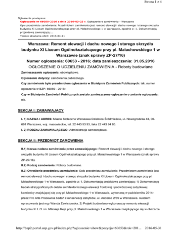 Strona 1 z 4 Ogłoszenie powiązane: Ogłoszenie nr 66050-2016 z dnia 2016-03-23 r. Ogłoszenie o zamówieniu - Warszawa Opis przedmiotu zamówienia: Przedmiotem zamówienia jest remont elewacji i dachu nowego i starego skrzydła budynku XI Liceum Ogólnokształcącego przy pl. Małachowskiego 1 w Warszawie, zgodnie z: 1. Dokumentacją projektową zawierającą:... Termin składania ofert: 2016-04-11 Warszawa: Remont elewacji i dachu nowego i starego skrzydła budynku XI Liceum Ogólnokształcącego przy pl. Małachowskiego 1 w Warszawie (znak sprawy ZP-27/16) Numer ogłoszenia: 60653 - 2016; data zamieszczenia: 31.05.2016 OGŁOSZENIE O UDZIELENIU ZAMÓWIENIA - Roboty budowlane Zamieszczanie ogłoszenia: obowiązkowe. Ogłoszenie dotyczy: zamówienia publicznego. Czy zamówienie było przedmiotem ogłoszenia w Biuletynie Zamówień Publicznych: tak, numer ogłoszenia w BZP: 66050 - 2016r. Czy w Biuletynie Zamówień Publicznych zostało zamieszczone ogłoszenie o zmianie ogłoszenia: nie. SEKCJA I: ZAMAWIAJĄCY I. 1) NAZWA I ADRES: Miasto Stołeczne Warszawa Dzielnica Śródmieście, ul. Nowogrodzka 43, 00691 Warszawa, woj. mazowieckie, tel. 22 443 93 93, faks 22 443 94 85. I. 2) RODZAJ ZAMAWIAJĄCEGO: Administracja samorządowa. SEKCJA II: PRZEDMIOT ZAMÓWIENIA II.1) Nazwa nadana zamówieniu przez zamawiającego: Remont elewacji i dachu nowego i starego skrzydła budynku XI Liceum Ogólnokształcącego przy pl. Małachowskiego 1 w Warszawie (znak sprawy ZP-27/16). II.2) Rodzaj zamówienia: Roboty budowlane. II.3) Określenie przedmiotu zamówienia: Opis przedmiotu zamówienia: Przedmiotem zamówienia jest remont elewacji i dachu nowego i starego skrzydła budynku XI Liceum Ogólnokształcącego przy pl. Małachowskiego 1 w Warszawie, zgodnie z: 1. Dokumentacją projektową zawierającą: 1) Dokumentację badań stratygraficznych detalu architektonicznego elewacji frontowej i podwórzowej zabytkowej kamienicy znajdującej się przy pl. Małachowskiego 1 w Warszawie, wykonaną w październiku 2014r. przez Pro Arte Pracownia badań i konserwacji zabytków, ul. Andersa 2/39 w Warszawie. Autorem opracowania jest mgr Wanda Zawistowska. 2) Projekt budowlano-wykonawczy remontu elewacji budynku XI L.O. im. Mikołaja Reja przy pl. Małachowskiego 1 w Warszawie znajdującego się w obszarze http://bzp2.portal.uzp.gov.pl/index.php?ogloszenie=show&pozycja=60653&rok=201... 2016-05-31 Strona 2 z 4 wpisanym do rejestru konserwatorskiego pl. Małachowskiego - tom I (projekt remontu elewacji i dachu nowego skrzydła budynku) wykonany dnia 31 października 2014 r. przez FORMAT Biuro Projektów Tomasz Turek, Legionowo, ul. Kujawska 35a. Autorami opracowania są: mgr inż. arch. Magdalena Trojanowska, inż. Tomasz Turek, Tomasz Grzesiak, Aleksandra Wójciak. 3) Projekt budowlanowykonawczy remontu elewacji budynku XI L.O. im. Mikołaja Reja przy pl. Małachowskiego 1 w Warszawie znajdującego się w obszarze wpisanym do rejestru konserwatorskiego pl. Małachowskiego tom II (projekt remontu elewacji i dachu starego skrzydła budynku) wykonany dnia 31 października 2014 r. przez FORMAT Biuro Projektów Tomasz Turek, Legionowo, ul. Kujawska 35a. Autorami opracowania są: mgr inż. arch. Magdalena Trojanowska, mgr Wanda Zawistowska, inż. Tomasz Turek, Tomasz Grzesiak, Aleksandra Wójciak. 4) Przedmiar robót dla remontu elewacji budynku XI L.O. im. Mikołaja Reja przy pl. Małachowskiego 1 w Warszawie - nowe skrzydło budynku, wykonany dnia 20 stycznia 2016 r. przez Wiesława Pszczółkowskiego, Wydział Inwestycji dla Dzielnicy Śródmieście na podstawie przedmiaru wykonanego przez FORMAT Biuro Projektów Tomasz Turek, Legionowo, ul. Kujawska 35a, opracowanego przez inż. Tomasza Turek. 5) Przedmiar robót dla remontu elewacji budynku XI L.O. im. Mikołaja Reja przy pl. Małachowskiego 1 w Warszawie - zabytkowe skrzydło budynku, wykonany dnia 20 stycznia 2016 r. przez Wiesława Pszczółkowskiego Wydział Inwestycji dla Dzielnicy Śródmieście na podstawie przedmiaru wykonanego przez FORMAT Biuro Projektów Tomasz Turek, Legionowo, ul. Kujawska 35a, opracowanego przez inż. Tomasza Turek. 2. Specyfikacją techniczną wykonania i odbioru robót budowlanych dla remontu elewacji budynku XI L.O. im. Mikołaja Reja przy pl. Małachowskiego 1 w Warszawie znajdującego się w obszarze wpisanym do rejestru konserwatorskiego pl. Małachowskiego - tom I (projekt remontu elewacji i dachu nowego skrzydła budynku) wykonaną dnia 31 października 2014 r. przez FORMAT Biuro Projektów Tomasz Turek, Legionowo, ul. Kujawska 35a. Autorem opracowania jest inż. Tomasz Turek. 3. Specyfikacją techniczną wykonania i odbioru robót budowlanych dla remontu elewacji budynku XI L.O. im. Mikołaja Reja przy pl. Małachowskiego 1 w Warszawie znajdującego się w obszarze wpisanym do rejestru konserwatorskiego pl. Małachowskiego tom II (projekt remontu elewacji i dachu zabytkowego skrzydła budynku) wykonaną dnia 31 października 2014 r. przez FORMAT Biuro Projektów Tomasz Turek, Legionowo, ul. Kujawska 35a. Autorem opracowania jest inż. Tomasz Turek. Ww. opracowania stanowią załącznik nr 7 do SIWZ. Zamawiający dopuszcza rozwiązania równoważne opisanym w dokumentacji projektowej oraz specyfikacji technicznej wykonania i odbioru robót. Wykonawca, który powołuje się na rozwiązania równoważne do opisanych przez Zamawiającego jest obowiązany wykazać, że oferowane przez niego produkty, urządzenia i technologie spełniają wymagania określone przez Zamawiającego. W przypadku zaoferowania innych urządzeń niż określone w SIWZ należy dołączyć do oferty karty katalogowe tych urządzeń. Dane ogólne obiektu: Powierzchnia elewacji do ocieplenia ok. 1 350 m2. Powierzchnia elewacji do malowania ok. 2 380 m2. Wykonanie izolacji termicznej dachu ok. 658 m2. Wykonanie izolacji termicznej stropodachu ok. 284 m2. Wymiana krat okiennych ok 200 m2. W zakres zamówienia wchodzi m.in.: Stara część http://bzp2.portal.uz