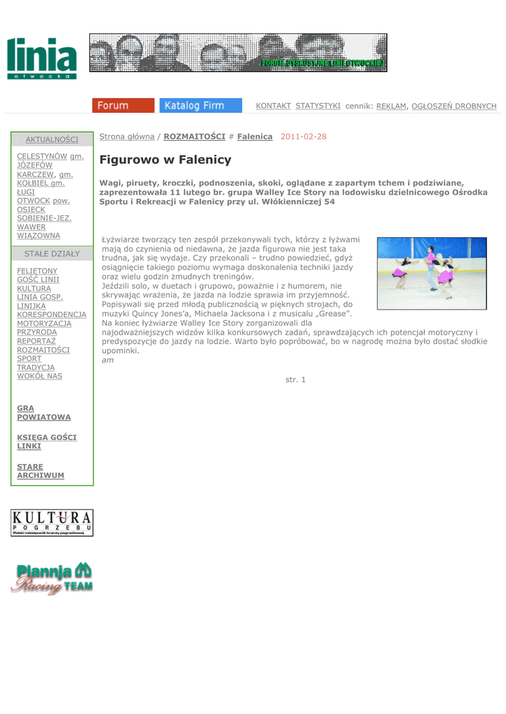 KONTAKT STATYSTYKI cennik: REKLAM, OGŁOSZEŃ DROBNYCH AKTUALNOŚCI CELESTYNÓW gm. JÓZEFÓW KARCZEW, gm. KOŁBIEL gm. ŁUGI OTWOCK pow. OSIECK SOBIENIE-JEZ. WAWER WIĄZOWNA STAŁE DZIAŁY FELIETONY GOŚĆ LINII KULTURA LINIA GOSP. LINIJKA KORESPONDENCJA MOTORYZACJA PRZYRODA REPORTAŻ ROZMAITOŚCI SPORT TRADYCJA WOKÓŁ NAS GRA POWIATOWA KSIĘGA GOŚCI LINKI STARE ARCHIWUM Strona główna / ROZMAITOŚCI # Falenica 2011-02-28 Figurowo w Falenicy Wagi, piruety, kroczki, podnoszenia, skoki, oglądane z zapartym tchem i podziwiane, zaprezentowała 11 lutego br. grupa Walley Ice Story na lodowisku dzielnicowego Ośrodka Sportu i Rekreacji w Falenicy przy ul. Włókienniczej 54 Łyżwiarze tworzący ten zespół przekonywali tych, którzy z łyżwami mają do czynienia od niedawna, że jazda figurowa nie jest taka trudna, jak się wydaje. Czy przekonali – trudno powiedzieć, gdyż osiągnięcie takiego poziomu wymaga doskonalenia techniki jazdy oraz wielu godzin żmudnych treningów. Jeździli solo, w duetach i grupowo, poważnie i z humorem, nie skrywając wrażenia, że jazda na lodzie sprawia im przyjemność. Popisywali się przed młodą publicznością w pięknych strojach, do muzyki Quincy Jones’a, Michaela Jacksona i z musicalu „Grease”. Na koniec łyżwiarze Walley Ice Story zorganizowali dla najodważniejszych widzów kilka konkursowych zadań, sprawdzających ich potencjał motoryczny i predyspozycje do jazdy na lodzie. Warto było popróbować, bo w nagrodę można było dostać słodkie upominki. am str. 1