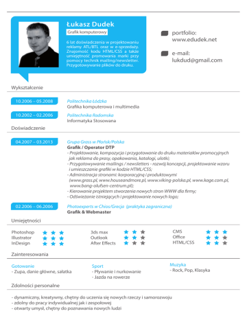 Łukasz Dudek portfolio: www.edudek.net Grafik komputerowy 6 lat doświadczenia w projektowaniu reklamy ATL/BTL oraz w e-sprzedaży. Znajomość kodu HTML/CSS a także umiejętność promowania marki przy pomocy technik mailing/newsletter. Przygotowywanie plików do druku. e-mail: [email protected] Wykształcenie 10.2006 – 05.2008 Politechnika Łódzka Grafika komputerowa i multimedia 10.2002 – 02.2006 Politechnika Radomska Informatyka Stosowana Doświadczenie 04.2007 – 03.2013 Grupa Grass w Płońsk/Polska Grafik / Operator DTP - Projektowanie, kompozycja i przygotowanie do druku materiałów promocyjnych jak reklama do prasy, opakowania, katalogi, ulotki; - Przygotowywanie mailings / newsletters - rozwój koncepcji, projektowanie wzoru i umieszczanie grafiki w kodzie HTML/CSS; - Administracja stronami: korporacyjną i produktowymi (www.grass.pl, www.houseandmore.pl, www.viking-polska.pl, www.kage.com.pl, www.bang-olufsen-centrum.pl); - Kierowanie projektem stworzenia nowych stron WWW dla firmy; - Odświeżanie istniejących i projektowanie nowych logo; 02.2006 – 06.2006 Photoexperts w Chios/Grecja (praktyka zagraniczna) Grafik & Webmaster Umiejętności Photoshop Illustrator InDesign CMS Office HTML/CSS 3ds max Outlook After Effects Zainteresowania Gotowanie - Zupa, danie główne, sałatka Sport - Pływanie i nurkowanie - Jazda na rowerze Muzyka - Rock, Pop, Klasyka Zdolności personalne - dynamiczny, kreatywny, chętny do uczenia się nowych rzeczy i samorozwoju - zdolny do pracy indywidualnej jak i zespołowej - otwarty umysł, chętny do poznawania nowych ludzi