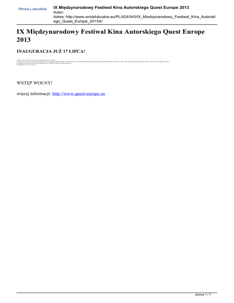 IX Międzynarodowy Festiwal Kina Autorskiego Quest Europe 2013 Autor: Adres: http://www.wrotalubuskie.eu/PL/424/543/IX_Miedzynarodowy_Festiwal_Kina_Autorski ego_Quest_Europe_2013/k/ IX Międzynarodowy Festiwal Kina Autorskiego Quest Europe 2013 INAUGURACJA JUŻ 17 LIPCA! 17 lipca o godz. 19.00 uroczyste otwarcie festiwalu w zborze w Letnicy! Tym razem start muzyczny: piosenki (nie tylko) filmowe w wykonaniu zespołu w składzie: Albert Bezdziczek - instrumenty klawiszowe, Mateusz Skrzypczak - saksofon, Stanisław Zimniewicz - bębny, udu, cajon, dzwonki, śpiew, Marzena Więcek - śpiew, Krzysztof Machalica - śpiew W programie wieczoru także pokaz filmu fabularnego ALL SECRETS w rezyserii Thomasa Suskiego: Wielka Brytania / Czas trwania: 65’ WSTĘP WOLNY! więcej informacji: http://www.quest-europe.eu strona 1 / 1 Powered by TCPDF (www.tcpdf.org)