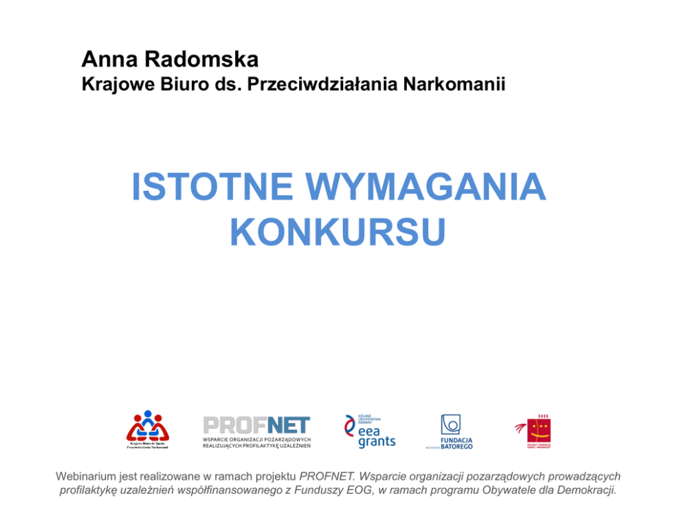 Anna Radomska Krajowe Biuro ds. Przeciwdziałania Narkomanii ISTOTNE WYMAGANIA KONKURSU Webinarium jest realizowane w ramach projektu PROFNET. Wsparcie organizacji pozarządowych prowadzących profilaktykę uzależnień współfinansowanego z Funduszy EOG, w ramach programu Obywatele dla Demokracji. KONKURS NA REALIZACJĘ ZADAŃ Z ZAKRESU PRZECIWDZIAŁANIA NARKOMANII W 2016 Podmioty uprawnione do udziału w konkursie organizacje pozarządowe lub podmioty wymienione w art. 3 ust. 3 pkt 1 ustawy o działalności pożytku publicznego i o wolontariacie. prowadzące działalność statutową w zakresie zgodnym z zadaniami konkursowymi Istotne warunki i wymagania formalne dot. oferty złożenie oferty w terminie – liczy się data wpływu do KBPN kompletność oferty podpisanie oferty przez osoby uprawnione do reprezentacji i składania oświadczeń woli – zgodnie z KRS KONKURS NA REALIZACJĘ ZADAŃ Z ZAKRESU PRZECIWDZIAŁANIA NARKOMANII W 2016 Istotne wymagania dot. sposobu realizacji zadania Zgodność zadań statutowych oferenta z zadaniami konkursowymi Zgodność oferty z zadaniem konkursowym. Spełnienie wymaganych warunków realizacji zadania – szczegółowe wymogi merytoryczne i finansowe określone są w opisie poszczególnych zadań konkursowych. warunki dotyczą grupy docelowej, priorytetowych działań, kosztów. Wniosek wspierania realizacji zadania – wymagany minimalny finansowy wkład własny 10% kosztów programu. KONKURS NA REALIZACJĘ ZADAŃ Z ZAKRESU PRZECIWDZIAŁANIA NARKOMANII W 2016 Oferty nie spełniające wymogów formalnych i wymogów sposobu realizacji zadania są odrzucane. Oferty odrzucone nie podlegają ocenie merytorycznej. Oferty spełniające wymogi formalne i wymogi dot. sposobu realizacji zadania podlegają ocenie merytorycznej. KONKURS NA REALIZACJĘ ZADAŃ Z ZAKRESU PRZECIWDZIAŁANIA NARKOMANII W 2016 Ocena merytoryczna oferty jest oceną punktową Możliwości realizacji zadania 0 - 20 pkt. Kalkulacja kosztów 0 - 20 pkt Jakość programu merytorycznego 0 - 40 pkt. Minimalna wymagana liczba punktów oceny jakości programu – 24 pkt Minimalna wymagana ocena końcowa – 44 pkt. Programy, które nie uzyskają minimalnej wymaganej liczby punktów są oddalone. W konkursie wybierane są programy, które uzyskały największą liczbę punktów, z zastrzeżeniem par. 16 regulaminu. KONKURS NA REALIZACJĘ ZADAŃ Z ZAKRESU PRZECIWDZIAŁANIA NARKOMANII W 2016 Ocena możliwości realizacji zadania Zasoby materialne 0 - 5 pkt. Zasoby kadrowe 0 - 5 pkt Doświadczenie 0 - 2 pkt. Wolontariusze, wkład osobowy 0 - 4 pkt. Rzetelność, terminowość 0 - 4 pkt. Informacje dotyczące możliwości realizacji zadania należy zamieścić w części V oferty. KBPN oddala oferty oferentów, którzy nie mają możliwości wykonania zadania. Rzetelność i terminowość realizacji zadań jest oceniana na podstawie dotychczasowej współpracy z KBPN. Organizacje nie współpracujące z KBPN mogą złożyć opinię w ww. sprawie od innych podmiotów publicznych KONKURS NA REALIZACJĘ ZADAŃ Z ZAKRESU PRZECIWDZIAŁANIA NARKOMANII W 2016 Ocena kalkulacji kosztów Finansowy wkład własny 0 - 3 pkt Efektywność 0 - 6 pkt Zgodność z taryfikatorem 0 - 2 pkt Zasadność kosztów 0 - 5 pkt Zgodność kosztorysu z działaniami 0 - 2 pkt Poprawność rachunkowa 0 - 2 pkt Priorytetem jest oszczędne i celowe dysponowanie środkami publicznymi. KBPN oddala oferty, które zawierają koszty nieuzasadnione i niezgodne z działaniami. KBPN oddala oferty, w przypadku niewłaściwego wydatkowania lub nierozliczenia dotacji KBPN. KONKURS NA REALIZACJĘ ZADAŃ Z ZAKRESU PRZECIWDZIAŁANIA NARKOMANII W 2016 Ocena jakości programu Potrzeba realizacji programu 0 -10 pkt Opis problemu, opis potrzeb, charakterystyka grupy docelowej cz. III pkt. 2, 3 oferty Cele i założenia 0 -10 pkt Opis celu głównego, celów szczegółowych, sposoby realizacji celów, uzasadnienie wyboru (skąd wiemy, że takie działania będą skuteczne) - część III pkt. 6 oferty Działania 0 - 10 pkt Adekwatność działań do celów i grupy docelowej, spójność, wykorzystanie strategii skutecznych – część III pkt. 6, 8, 9 oferty Rezultaty 0 - 10 pkt Planowane i osiągnięte rezultaty programu, ewaluacja, realizacja skutecznego programu/rekomendowanego – część III pkt. 6, 10, dodatkowo pkt. 2 oferty. KONKURS NA REALIZACJĘ ZADAŃ Z ZAKRESU PRZECIWDZIAŁANIA NARKOMANII W 2016 Zachęcamy do uważnego zapoznania się ze szczegółowymi warunkami konkursu. Dokumenty zamieszczone są na stronie KBPN w Aktualnościach, Konkursach oraz na stronie BIP. EWALUACJA PROGRAMU NIEDOCIĄGNIĘCIA I BŁĘDY W OFERTACH EWALUACJA PROGRAMU NIEDOCIĄGNIĘCIA I BŁĘDY W OFERTACH Brak informacji na temat ewaluacji w ogóle Brak informacji na temat metod i narzędzi ewaluacji Sformułowany wyłącznie cel operacyjny Przykład 1 : „Celem projektu jest realizacja kompleksowego programu profilaktyki…” Przykład 2: „Cel ogólny: Objęcie opieką pedagogiczną i wsparciem …młodzieży w wieku …” Cel / cele nie są mierzalne Przykład 1: „zniwelowanie patologicznych wzorców relacji rodzinnych”. EWALUACJA PROGRAMU NIEDOCIĄGNIĘCIA I BŁĘDY W OFERTACH Sformułowano dużą liczbę celów szczegółowych Cel / cele programu są nierealistyczne - trudne lub niemożliwe do osiągnięcia w określonym czasie, przy wdrożeniu zaplanowanych działań Przykład 1: Cel „Ograniczenie problemu narkomanii na terenie miasta….” Czas realizacji – 1 rok, zaplanowane działania – zajęcia dla 100 rodziców. Przykład 2: Cele: „Uzyskanie wiedzy…, Uzyskanie asertywnych umiejętności…, Budowanie umiejętności radzenia sobie z napięciem…” Zaplanowane działania – 3 godzinne spotkanie warsztatowe dla młodzieży, brak ewaluacji. EWALUACJA PROGRAMU NIEDOCIĄGNIĘCIA I BŁĘDY W OFERTACH Cele zaplanowane prawidłowo, planowane rezultaty dotyczą wyłącznie realizacji celów operacyjnych programu odnoszą się do za