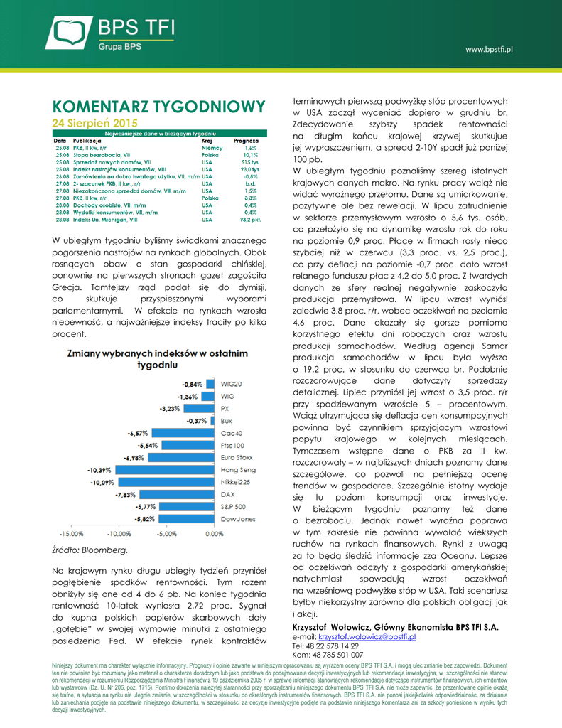 KOMENTARZ TYGODNIOWY 24 Sierpień 2015 W ubiegłym tygodniu byliśmy świadkami znacznego pogorszenia nastrojów na rynkach globalnych. Obok rosnących obaw o stan gospodarki chińskiej, ponownie na pierwszych stronach gazet zagościła Grecja. Tamtejszy rząd podał się do dymisji, co skutkuje przyspieszonymi wyborami parlamentarnymi. W efekcie na rynkach wzrosła niepewność, a najważniejsze indeksy traciły po kilka procent. Źródło: Bloomberg. Na krajowym rynku długu ubiegły tydzień przyniósł pogłębienie spadków rentowności. Tym razem obniżyły się one od 4 do 6 pb. Na koniec tygodnia rentowność 10-latek wyniosła 2,72 proc. Sygnał do kupna polskich papierów skarbowych dały „gołębie” w swojej wymowie minutki z ostatniego posiedzenia Fed. W efekcie rynek kontraktów terminowych pierwszą podwyżkę stóp procentowych w USA zaczął wyceniać dopiero w grudniu br. Zdecydowanie szybszy spadek rentowności na długim końcu krajowej krzywej skutkujue jej wypłaszczeniem, a spread 2-10Y spadł już poniżej 100 pb. W ubiegłym tygodniu poznaliśmy szereg istotnych krajowych danych makro. Na rynku pracy wciąż nie widać wyraźnego przełomu. Dane są umiarkowanie, pozytywne ale bez rewelacji. W lipcu zatrudnienie w sektorze przemysłowym wzrosło o 5,6 tys. osób, co przełożyło się na dynamikę wzrostu rok do roku na poziomie 0,9 proc. Płace w firmach rosły nieco szybciej niż w czerwcu (3,3 proc. vs. 2,5 proc.), co przy deflacji na poziomie -0,7 proc. dało wzrost relanego funduszu płac z 4,2 do 5,0 proc. Z twardych danych ze sfery realnej negatywnie zaskoczyła produkcja przemysłowa. W lipcu wzrost wyniósl zaledwie 3,8 proc. r/r, wobec oczekiwań na pzoiomie 4,6 proc. Dane okazały się gorsze pomiomo korzystnego efektu dni roboczych oraz wzrostu produkcji samochodów. Według agencji Samar produkcja samochodów w lipcu była wyższa o 19,2 proc. w stosunku do czerwca br. Podobnie rozczarowujące dane dotyczyły sprzedaży detalicznej. Lipiec przyniósl jej wzrost o 3,5 proc. r/r przy spodziewanym wzroście 5 – procentowym. Wciąż utrzymująca się deflacja cen konsumpcyjnych powinna być czynnikiem sprzyjajacym wzrostowi popytu krajowego w kolejnych miesiącach. Tymczasem wstępne dane o PKB za II kw. rozczarowały – w najbliższych dniach poznamy dane szczególowe, co pozwoli na pełniejszą ocenę trendów w gospodarce. Szczególnie istotny wydaje się tu poziom konsumpcji oraz inwestycje. W bieżącym tygodniu poznamy też dane o bezrobociu. Jednak nawet wyraźna poprawa w tym zakresie nie powinna wywołać wiekszych ruchów na rynkach finansowych. Rynki z uwagą za to będą śledzić informacje zza Oceanu. Lepsze od oczekiwań odczyty z gospodarki amerykańskiej natychmiast spowodują wzrost oczekiwań na wrześniową podwyżke stóp w USA. Taki scenariusz byłby niekorzystny zarówno dla polskich obligacji jak i akcji. Krzysztof Wołowicz, Główny Ekonomista BPS TFI S.A. e-mail: [email protected] Tel: 48 22 578 14 29 Kom: 48 785 501 007 Niniejszy dokument ma charakter wyłącznie informacyjny. Prognozy i opinie zawarte w niniejszym opracowaniu są wyrazem oceny BPS TFI S.A. i mogą ulec zmianie bez zapowiedzi. Dokument ten nie powinien być rozumiany jako materiał o charakterze doradczym lub jako podstawa do podejmowania decyzji inwestycyjnych lub rekomendacja inwestycyjna, w szczególności nie stanowi on rekomendacji w rozumieniu Rozporządzenia Ministra Finansów z 19 października 2005 r. w sprawie informacji stanowiących rekomendacje dotyczące instrumentów finansowych, ich emitentów lub wystawców (Dz. U. Nr 206, poz. 1715). Pomimo dołożenia należytej staranności przy sporządzaniu niniejszego dokumentu BPS TFI S.A. nie może zapewnić, że prezentowane opinie okażą się trafne, a sytuacja na rynku nie ulegnie zmianie, w szczególności w stosunku do określonych instrumentów finansowych. BPS TFI S.A. nie ponosi jakiejkolwiek odpowiedzialności za działania lub zaniechania podjęte na podstawie niniejszego dokumentu, w szczególności za decyzje inwestycyjne podjęte na podstawie niniejszego komentarza ani za szkody poniesione w wyniku tych decyzji inwestycyjnych.