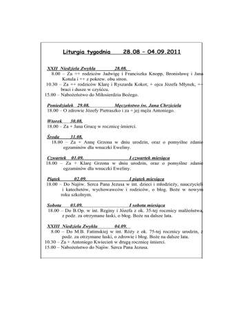 Liturgia tygodnia 28.08 – 04.09.2011 XXII Niedziela Zwykła 28.08. 8.00 – Za ++ rodziców Jadwigę i Franciszka Knopp, Bronisławę i Jana ………Kotula i ++ z pokrew. obu stron. 10.30 – Za ++ rodziców Klarę i Ryszarda Kokot, + ojca Józefa Młynek, ++ …………braci i dusze w czyśćcu. 15.00 –.Nabożeństwo do Miłosierdzia Bożego. Poniedziałek 29.08. Męczeństwo św. Jana Chrziciela 18.00 – O zdrowie Józefy Pietraszko i za + jej męża Antoniego. Wtorek 30.08. 18.00 –.Za + Jana Grucę w rocznicę śmierci. Środa 31.08. 18.00 – Za + Annę Grzona w dniu urodzin, oraz o pomyślne zdanie …………..egzaminów dla wnuczki Eweliny. Czwartek 01.09. I czwartek miesiąca ....18.00 – Za + Klarę Grzona w dniu urodzin, oraz o pomyślne zdanie …………..egzaminów dla wnuczki Eweliny. Piątek 02.09. I piątek miesiąca ... 18.00 – Do Najśw. Serca Pana Jezusa w int. dzieci i młodzieży, nauczycieli ………….i katechetów, wychowawców i rodziców, o błog. Boże w nowym …………roku szkolnym. Sobota 03.09. I sobota miesiąca 18.00 – Do B.Op. w int. Reginy i Józefa z ok. 35-tej rocznicy małżeństwa, ………….z podz. za otrzymane łaski, o błog. Boże na dalsze lata. XXIII Niedziela Zwykła 04.09. 8.00 – Do M.B. Fatimskiej w int. Róży z ok. 75-tej rocznicy urodzin, z ………podz. za otrzymane łaski, o zdrowie i błog. Boże na dalsze lata. 10.30 – Za + Antoniego Kwiecień w drugą rocznicę śmierci. 15.00 –.Nabożeństwo do Najśw. Serca Pana Jezusa. Informacje duszpasterskie 1. Dzisiaj o 15.00 nabożeństwo do Miłosierdzia Bożego. 2. W tygodniu Msza święta jest odprawiana codziennie wieczorem o 18.00, pół godziny przed Mszą jest odmawiany różaniec i jest okazja do spowiedzi świętej. 3. W czwartek nasze dzieci i młodzież zaczynają nowy rok szkolny. . . 4. U nas Msza święta w intencji dzieci i młodzieży, nauczycieli, katechetów i rodziców, o błogosławieństwo Boże w nowym roku szkolnym, zostanie odprawiona w piątek. 5. Przed Mszą świętą w piątek, już od godz. 17.00 zapraszam dzieci i młodzież do spowiedzi świętej. Podczas Mszy świętej w piątek będzie błogosławieństwo tornistrów i przyborów szkolnych dzieci zaczynających I klasę Szkoły Podstawowej. 6. W tym roku szkolnym podobnie jak w latach ubiegłych, Msza święta szkolna będzie zawsze w piątek. Bardzo proszę, aby dzieci i młodzież tak sobie ułożyły różne zajęcia dodatkowe, żeby w każdy piątek mogły uczestniczyć we Mszy świętej. 7. W tym tygodniu przypada I czwartek, I piątek i I sobota miesiąca; zapraszam w te trzy dni do liczniejszego udziału we Mszy świętej. 8. Za dwa tygodnie, w niedzielę 11 września, obchodzić będziemy nasze dożynki czyli żniwniok, który w tym roku przygotowuje strona zachodnia Świerkli, to znaczy: lewa strona ul. Piastowskiej oraz ulice Słowackiego, Leśna, Miła i Kupska.
