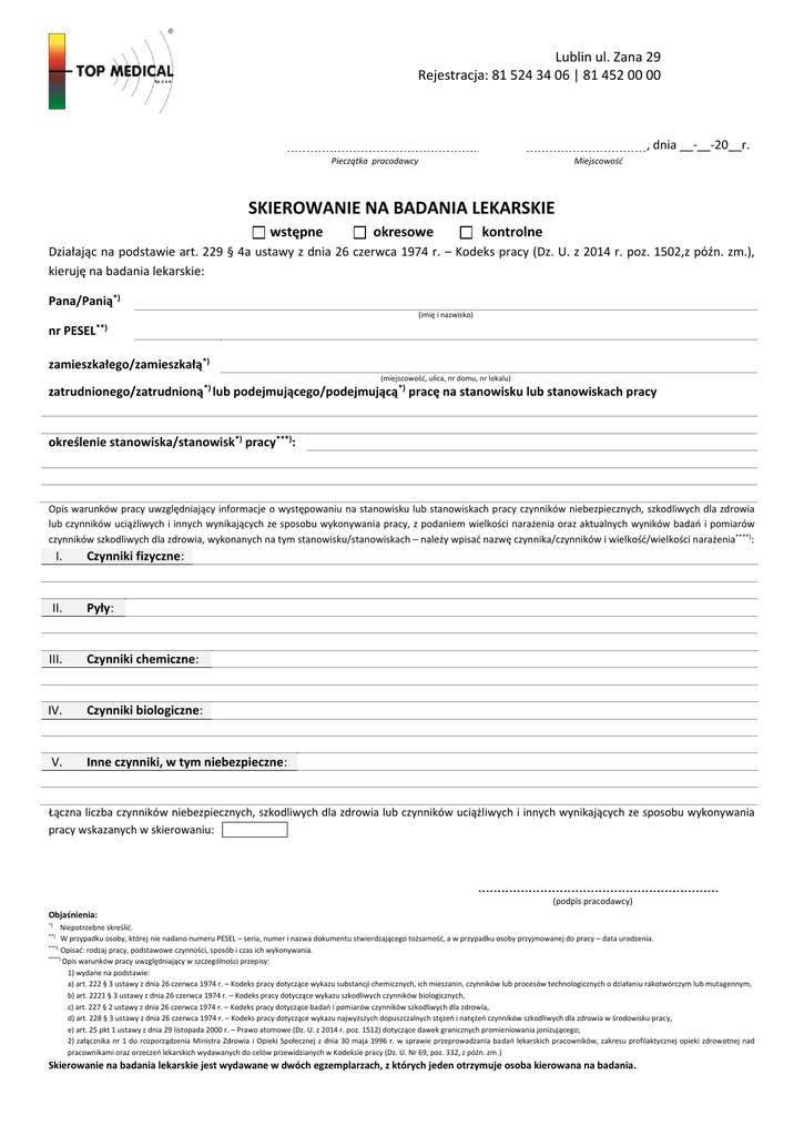 Lublin ul. Zana 29 Rejestracja: 81 524 34 06 | 81 452 00 00 , dnia __-__-20__r. Pieczątka pracodawcy Miejscowość SKIEROWANIE NA BADANIA LEKARSKIE wstępne okresowe kontrolne Działając na podstawie art. 229 § 4a ustawy z dnia 26 czerwca 1974 r. – Kodeks pracy (Dz. U. z 2014 r. poz. 1502,z późn. zm.), kieruję na badania lekarskie: Pana/Panią*) (imię i nazwisko) nr PESEL **) zamieszkałego/zamieszkałą*) (miejscowość, ulica, nr domu, nr lokalu) zatrudnionego/zatrudnioną*) lub podejmującego/podejmującą*) pracę na stanowisku lub stanowiskach pracy określenie stanowiska/stanowisk*) pracy***): Opis warunków pracy uwzględniający informacje o występowaniu na stanowisku lub stanowiskach pracy czynników niebezpiecznych, szkodliwych dla zdrowia lub czynników uciążliwych i innych wynikających ze sposobu wykonywania pracy, z podaniem wielkości narażenia oraz aktualnych wyników badań i pomiarów czynników szkodliwych dla zdrowia, wykonanych na tym stanowisku/stanowiskach – należy wpisać nazwę czynnika/czynników i wielkość/wielkości narażenia****): I. Czynniki fizyczne: II. Pyły: III. Czynniki chemiczne: IV. Czynniki biologiczne: V. Inne czynniki, w tym niebezpieczne: Łączna liczba czynników niebezpiecznych, szkodliwych dla zdrowia lub czynników uciążliwych i innych wynikających ze sposobu wykonywania pracy wskazanych w skierowaniu: (podpis pracodawcy) Objaśnienia: *) Niepotrzebne skreślić. W przypadku osoby, której nie nadano numeru PESEL – seria, numer i nazwa dokumentu stwierdzającego tożsamość, a w przypadku osoby przyjmowanej do pracy – data urodzenia. Opisać: rodzaj pracy, podstawowe czynności, sposób i czas ich wykonywania. ****) Opis warunków pracy uwzględniający w szczególności przepisy: 1) wydane na podstawie: a) art. 222 § 3 ustawy z dnia 26 czerwca 1974 r. – Kodeks pracy dotyczące wykazu substancji chemicznych, ich mieszanin, czynników lub procesów technologicznych o działaniu rakotwórczym lub mutagennym, b) art. 2221 § 3 ustawy z dnia 26 czerwca 1974 r. – Kodeks pracy dotyczące wykazu szkodliwych czynników biologicznych, c) art. 227 § 2 ustawy z dnia 26 czerwca 1974 r. – Kodeks pracy dotyczące badań i pomiarów czynników szkodliwych dla zdrowia, d) art. 228 § 3 ustawy z dnia 26 czerwca 1974 r. – Kodeks pracy dotyczące wykazu najwyższych dopuszczalnych stężeń i natężeń czynników szkodliwych dla zdrowia w środowisku pracy, e) art. 25 pkt 1 ustawy z dnia 29 listopada 2000 r. – Prawo atomowe (Dz. U. z 2014 r. poz. 1512) dotyczące dawek granicznych promieniowania jonizującego; 2) załącznika nr 1 do rozporządzenia Ministra Zdrowia i Opieki Społecznej z dnia 30 maja 1996 r. w sprawie przeprowadzania badań lekarskich pracowników, zakresu profilaktycznej opieki zdrowotnej nad pracownikami oraz orzeczeń lekarskich wydawanych do celów przewidzianych w Kodeksie pracy (Dz. U. Nr 69, poz. 332, z późn. zm.) **) ***) Skierowanie na badania lekarskie jest wydawane w dwóch egzemplarzach, z których jeden otrzymuje osoba kierowana na badania.