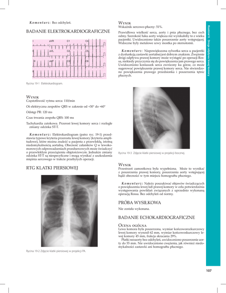 BADANIE ELEKTROKARDIOGRAFICZNE I aVR C1 C4 II aVL C2 C5 aVF C3 C6 III II Wskaźnik sercowo-płucny: 51%. Prawidłowa wielkość serca, aorty i pnia płucnego, bez cech odmy. Szerokość łuku aorty większa niż wynikałoby to z wieku pacjentki. Uwidoczniono także poszerzenie aorty wstępującej. Widoczne były metalowe szwy mostka po sternotomii. K o m e n t a r z : Niepowiększona sylwetka serca u pacjentki z dysfunkcją zastawki aortalnej jest dobrym znakiem. Zwężenie drogi odpływu prawej komory może wystąpić po operacji Rossa, niekiedy przyczynia się do powiększenia jam prawego serca. Uwidoczniono koniuszek serca zwrócony ku górze, co może sugerować powiększenie prawej komory serca. Nie stwierdzono powiększenia prawego przedsionka i poszerzenia tętnic płucnych. Rozdział II. Droga odpływu lewej komory Wynik K o m e n t a r z : Bez odchyleń. Rycina 19-1 Elektrokardiogram. Wynik Częstotliwość rytmu serca: 110/min Oś elektryczna zespołów QRS w zakresie od +30° do +60° Odstęp PR: 120 ms Czas trwania zespołu QRS: 100 ms Tachykardia zatokowa. Przerost lewej komory serca i rozległe zmiany odcinka ST-T. K o m e n t a r z : Elektrokardiogram (patrz ryc. 19-1) przedstawia typowe kryteria przerostu lewej komory (kryteria amplitudowe), które można znaleźć u pacjenta z przewlekłą, istotną niedomykalnością aortalną. Obecność załamków Q w lewokomorowych odprowadzeniach przedsercowych może świadczyć o przewlekłym przeciążeniu objętościowym. Jednakże zmiany odcinka ST-T są niespecyficzne i mogą wynikać z uszkodzenia mięśnia sercowego w trakcie przebytych operacji. RTG KLATKI PIERSIOWEJ Rycina 19-3 Zdjęcie klatki piersiowej w projekcji bocznej. Wynik Przestrzeń zamostkowa była wypełniona. Może to wynikać z poszerzenia prawej komory, poszerzenia aorty wstępującej bądź obecności w tym miejscu homograftu płucnego. K o m e n t a r z : Należy poszukiwać objawów świadczących o powiększeniu lewej lub prawej komory w celu potwierdzenia występowania powikłań związanych z uprzednio wykonaną operacją Rossa. Bez odchyleń od normy. PRÓBA WYSIŁKOWA Nie została wykonana. BADANIE ECHOKARDIOGRAFICZNE Ocena ogólna Lewa komora była poszerzona, wymiar końcoworozkurczowy lewej komory wynosił 62 mm, wymiar końcowoskurczowy lewej komory 45 mm, frakcja skracania 29%. Płatki neoaorty bez odchyleń, uwidoczniono poszerzenie aorty do 55 mm. Nie uwidoczniono zwężenia, jak również niedomykalności zastawki ani homograftu płucnego. Rycina 19-2 Zdjęcie klatki piersiowej w projekcji PA. 107