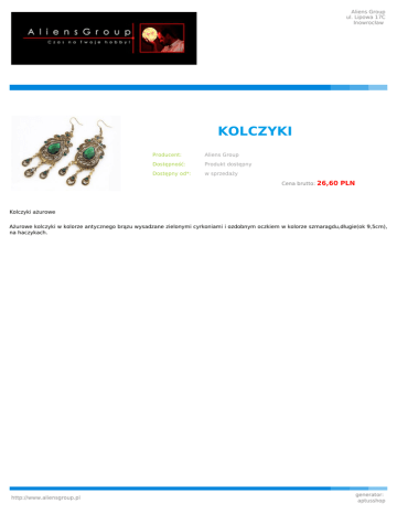 Aliens Group ul. Lipowa 17C Inowrocław KOLCZYKI Producent: Aliens Group Dostępność: Produkt dostępny Dostępny od*: w sprzedaży Cena brutto: 26,60 PLN Kolczyki ażurowe Ażurowe kolczyki w kolorze antycznego brązu wysadzane zielonymi cyrkoniami i ozdobnym oczkiem w kolorze szmaragdu,długie(ok 9,5cm), na haczykach. http://www.aliensgroup.pl generator: aptusshop