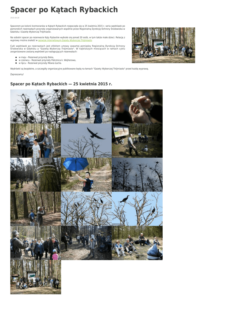Spacer po Kątach Rybackich 2015-04-28 Spacerem po kolonii kormoranów w Kątach Rybackich rozpoczęła się w 25 kwietnia 2015 r. seria wędrówek po pomorskich rezerwatach przyrody organizowanych wspólnie przez Regionalną Dyrekcję Ochrony Środowiska w Gdańsku i Gazetę Wyborczą Trójmiasto. Na sobotni spacer po rezerwacie Kąty Rybackie wybrało się ponad 20 osób, w tym także małe dzieci. Relację z wyprawy można znaleźć w serwisie internetowym Gazety Wyborczej Trójmiasto. Cykl wędrówek po rezerwatach jest efektem umowy zawartej pomiędzy Regionalną Dyrekcją Ochrony Środowiska w Gdańsku a "Gazetą Wyborczą Trójmiasto". W najbliższych miesiącach w ramach cyklu zorganizowane zostaną wędrówki po następujących rezerwatach: w maju - Rezerwat przyrody Beka, w czerwcu - Rezerwat przyrody Pełcznica k. Wejherowa, w lipcu - Rezerwat przyrody Mewia Łacha. Wędrówki są bezpłatne, a szczegóły organizacyjne publikowane będą na łamach "Gazety Wyborczej Trójmiasto" przed każdą wyprawą. Zapraszamy! Spacer po Kątach Rybackich — 25 kwietnia 2015 r.