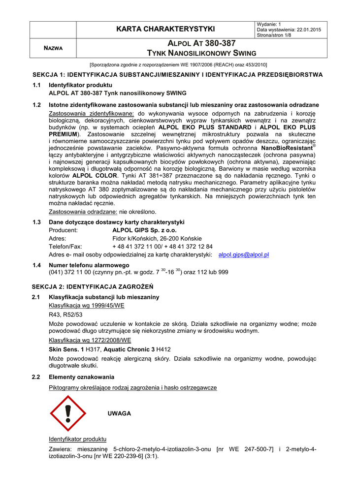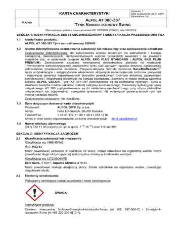 KARTA CHARAKTERYSTYKI Wydanie: 1 Data wystawienia: 22.01.2015 Strona/stron 1/8 ALPOL AT 380-387 TYNK NANOSILIKONOWY SWING NAZW A [Sporządzona zgodnie z rozporządzeniem WE 1907/2006 (REACH) oraz 453/2010] SEKCJA 1: IDENTYFIKACJA SUBSTANCJI/MIESZANINY I IDENTYFIKACJA PRZEDSIĘBIORSTWA 1.1 Identyfikator produktu ALPOL AT 380-387 Tynk nanosilikonowy SWING 1.2 Istotne zidentyfikowane zastosowania substancji lub mieszaniny oraz zastosowania odradzane Zastosowania zidentyfikowane: do wykonywania wysoce odpornych na zabrudzenia i korozję biologiczną, dekoracyjnych, cienkowarstwowych wypraw tynkarskich wewnątrz i na zewnątrz budynków (np. w systemach ociepleń ALPOL EKO PLUS STANDARD i ALPOL EKO PLUS PREMIUM). Zastosowanie szczelnej wewnętrznej mikrostruktury pozwala na skuteczne i równomierne samooczyszczanie powierzchni tynku pod wpływem opadów deszczu, ograniczając ® jednocześnie powstawanie zacieków. Pasywno-aktywna formuła ochronna NanoBioResistant łączy antybakteryjne i antygrzybiczne właściwości aktywnych nanocząsteczek (ochrona pasywna) i najnowszej generacji kapsułkowanych biocydów powłokowych (ochrona aktywna), zapewniając kompleksową i długotrwałą odporność na korozję biologiczną. Barwiony w masie według wzornika kolorów ALPOL COLOR. Tynki AT 381÷387 przeznaczone są do nakładania ręcznego. Tynki o strukturze baranka można nakładać metodą natrysku mechanicznego. Parametry aplikacyjne tynku natryskowego AT 380 zoptymalizowane są do nakładania mechanicznego przy użyciu pistoletów natryskowych lub odpowiednich agregatów tynkarskich. Na mniejszych powierzchniach tynk ten można nakładać ręcznie. Zastosowania odradzane: nie określono. 1.3 Dane dotyczące dostawcy karty charakterystyki Producent: ALPOL GIPS Sp. z o.o. Adres: Fidor k/Końskich, 26-200 Końskie Telefon/Fax: + 48 41 372 11 00/ + 48 41 372 12 84 Adres e- mail osoby odpowiedzialnej za kartę charakterystyki: [email protected] 1.4 Numer telefonu alarmowego 30 30 (041) 372 11 00 (czynny pn.-pt. w godz. 7 -16 ) oraz 112 lub 999 SEKCJA 2: IDENTYFIKACJA ZAGROŻEŃ 2.1 Klasyfikacja substancji lub mieszaniny Klasyfikacja wg 1999/45/WE R43, R52/53 Może powodować uczulenie w kontakcie ze skórą. Działa szkodliwie na organizmy wodne; może powodować długo utrzymujące się niekorzystne zmiany w środowisku wodnym. Klasyfikacja wg 1272/2008/WE Skin Sens. 1 H317, Aquatic Chronic 3 H412 Może powodować reakcję alergiczną skóry. Działa szkodliwie na organizmy wodne, powodując długotrwałe skutki. 2.2 Elementy oznakowania Piktogramy określające rodzaj zagrożenia i hasło ostrzegawcze UWAGA Identyfikator produktu Zawiera: mieszaninę 5-chloro-2-metylo-4-izotiazolin-3-onu [nr WE 247-500-7] i 2-metylo-4izotiazolin-3-onu [nr WE 220-239-6] (3:1). KARTA CHARAKTERYSTYKI Wydanie: 1 Data wystawienia: 22.01.2015 Strona/stron 2/8 ALPOL AT 380-387 TYNK NANOSILIKONOWY SWING NAZW A Zwroty wskazujące rodzaj zagrożenia H317 Może powodować reakcję alergiczną skóry. H412 Działa szkodliwie na organizmy wodne, powodując długotrwałe skutki. Zwroty wskazujące środki ostrożności P102 Chronić przed dziećmi. P280 Stosować rękawice ochronne/odzież ochronną/ochronę oczu/ochronę twarzy. P302+P352 W PRZYPADKU KONTAKTU ZE SKÓRĄ: umyć dużą ilością wody. P333+P313 W przypadku wystąpienia podrażnienia skóry lub wysypki: Zasięgnąć porady/zgłosić się pod opiekę lekarza. P501 Zawartość/pojemnik usuwać do odpowiednio oznakowanych pojemników na odpady zgodnie z krajowymi przepisami. 2.3 Inne zagrożenia Substancje zawarte w produkcie nie spełniają kryteriów PBT lub vPvB zgodnie z załącznikiem XIII rozporządzenia REACH. SEKCJA 3: SKŁAD/INFORMACJA O SKŁADNIKACH 3.1 Substancje Nie dotyczy. 3.2 Mieszaniny węglan wapnia Zakres stężeń: < 58% Numer CAS: 471-34-1 Numer WE: 207-439-9 Identyfikator produktu: Numer rejestracji właściwej: substancja wyłączona z obowiązku rejestracji na mocy art. 2 ust. 7. Klasyfikacja wg 67/548/EWG: substancja nie jest klasyfikowana jako niebezpieczna. Klasyfikacja wg 1272/2008/WE: substancja nie jest klasyfikowana jako niebezpieczna. Substancja z określoną na poziomie krajowym wartością najwyższego dopuszczalnego stężenia w środowisku pracy. dolomit Zakres stężeń: ≤ 14% Numer CAS: 16389-88-1 Numer WE: 240-440-2 Identyfikator produktu: Numer rejestracji właściwej: substancja wyłączona z obowiązku rejestracji na mocy art. 2 ust. 7. Klasyfikacja wg 67/548/EWG: substancja nie jest klasyfikowana jako niebezpieczna. Klasyfikacja wg 1272/2008/WE: substancja nie jest klasyfikowana jako niebezpieczna. Substancja z określoną na poziomie krajowym wartością najwyższego dopuszczalnego stężenia w środowisku pracy. krystobalit Zakres stężeń: ≤ 3% Numer CAS: 14464-46-1 Numer WE: 238-455-4 Identyfikator produktu: Numer rejestracji właściwej: substancja wyłączona z obowiązku rejestracji na mocy art. 2 ust. 7. Klasyfikacja wg 67/548/EWG: Xn R48/20 Klasyfikacja wg 1272/2008/WE: STOT RE 2 H373 Substancja z określoną na poziomie krajowym wartością najwyższego dopuszczalnego stężenia w środowisku pracy. KARTA CHARAKTERYSTYKI Wydanie: 1 Data wystawienia: 22.01.2015 Strona/stron 3/8 ALPOL AT 380-387 TYNK NANOSILIKONOWY SWING NAZW A dwutlenek tytanu; biel tytanowa Zakres stężeń: ≤ 3% Numer CAS: 13463-67-7 Numer WE: 236-675-5 Numer indeksowy: Numer rejestracji właściwej: substancje podlega przepisom okresu przejściowego Klasyfikacja wg 67/548/EWG: substancja nie jest klasyfikowana jako niebezpieczna Klasyfikacja wg 1272/2008/WE: substancja nie jest klasyfikowana jako niebezpieczna Substancja z określoną na poziomie krajowym wartością najwyższego dopuszczalnego stężenia w środowisku pracy. talk Zakres stężeń: ≤ 2% Numer CAS: 14807-96-6 Numer WE: 238-877-9 Numer indeksowy: - Numer rejestracji właściwej: substancje podlega przepisom okresu przejściowego Klasyfikacja wg 67/548/EWG: substancja nie
