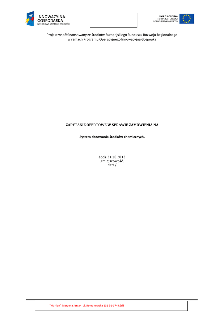 Projekt współfinansowany ze środków Europejskiego Funduszu Rozwoju Regionalnego w ramach Programu Operacyjnego Innowacyjna Gospoaka ZAPYTANIE OFERTOWE W SPRAWIE ZAMÓWIENIA NA System dozowania środków chemicznych. Łódź 21.10.2013 /miejscowość, data/ “Marilyn” Marzena Janiak ul. Romanowska 131 91-174 Łódź Projekt współfinansowany ze środków Europejskiego Funduszu Rozwoju Regionalnego w ramach Programu Operacyjnego Innowacyjna Gospodarka 1. Nazwa i adres Zamawiającego. “Marilyn “ Marzena Janiak ul. Romanowska 131 91-174 Łódź Tel: 42 712 12 15 FAX: 42 650 99 20 NIP: 726-050-24-52 REGON: 470925076 2. Tryb udzielania zamówienia. Zamówienie udzielane będzie w trybie postępowania ofertowego. 3. Opis przedmiotu zamówienia. • • • • • 4. System umożliwiający automatyczne dozowanie środków chemicznych i barwników do aparatu barwiarskiego Dwa zbiorniki ze stali kwasoodpornej w tym jeden z mieszadłem i nagrzewnicą parową z termoregulatorem do dozowania barwników Zawory pneumatyczne sterowane z panelu kontrolnego do podawania środków do bębna barwiarki Szafa sterownicza z elektronicznym panel kontrolnym do sterowania procesem barwienia i dozowania barwników i chemi Pompa cyrkulacyjna pobierająca kąpiel z bębna barwiarki i po dodaniu środków chem.tłocząca kąpiel z powrotem do bębna Termin realizacji zamówienia. Maxymalnie 120 dni roboczych od daty zamówienia 5. Zamówienia częściowe. Zamawiający nie dopuszcza składania ofert częściowych. 6. Informacja o ofercie wariantowej. Zamawiający dopuszcza składanie ofert wariantowych. 7. Opis warunków udziału w postępowaniu oraz sposobu dokonywania oceny spełnienia tych warunków: 7.1. W postępowaniu mogą wziąć udział Wykonawcy, którzy spełniają następujące warunki: a. posiadają uprawnienia do wykonywania działalności lub czynności w zakresie odpowiadającym przedmiotowi zamówienia, b. posiadają niezbędną wiedzę i doświadczenie oraz dysponują potencjałem technicznym i osobami zdolnymi do wykonania zamówienia. “Marilyn” Marzena Janiak ul. Romanowska 131 91-174 Łódź 7.2. Ocena spełnienia warunków udziału w niniejszym postępowaniu dokonana zostanie na zasadzie spełnia / nie spełnia w oparciu o informacje zawarte w dokumentach i oświadczeniach złożonych przez Wykonawców. 8. Osoby uprawnione do porozumiewania się z Wykonawcami: Piotr Janiak, Piotr Szyrman, Małgorzata Szpadzińska, Sławomir Urbanowicz Miejsce i termin złożenia oferty. 9. Oferty należy składać osobiście lub listownie na adres Zamawiającego: “Marilyn” Marzena Janiak Romanowska 131 91-174 Łódź w nieprzekraczalnym terminie do dnia 4.11..2013 do godz.16.00 10. Termin związania ofertą. Wykonawca pozostaje związany ofertą przez okres 90 rozpoczyna się wraz z upływem terminu składania ofert. dni. Bieg terminu 11. Termin i miejsce otwarcia ofert. Otwarcie ofert nastąpi dnia 5.11.2013 przewiduje publicznego otwarcia ofert. o godz. 10.00 w siedzibie Zamawiającego. Zamawiający nie 12. Kryteria oceny ofert i opis sposobu ich obliczenia. Opis kryteriów, którymi firma będzie się kierowała przy wyborze oferty oraz znaczenie tych kryteriów. Lp. Maksymalna liczba punktów możliwych do uzyskania – 100 Rodzaj Kryterium 1 Cena Punktacja Od 0 do 70 Sposób oceny Stosunek ceny najniższej oferty do ceny badanej oferty mnożony przez 70. Stosunek okresu gwarancji w badanej 2 13. Gwarancja Od 0 do 30 ofercie do okresu gwarancji w ofercie z najdłuższą gwarancją mnożony przez 30. Pozostałe in formacje. Poprzez złożenie oferty Oferent wyraża zgodę na podanie do wiadomości pozostałych Oferentów szczegółów oferty. Oferent ma prawo nie wyrazić zgody na podanie do wiadomości szczegółów technicznych przedmiotu zamówienia. Zamawiający zastrzega sobie prawo do: 1. zmiany warunków udzielenia zamówienia, “Marilyn” Marzena Janiak ul. Romanowska 131 91-174 Łódź 2. unieważnienia postępowania, 4. pozostawienia bez rozpatrzenia oferty niezgodnej z wymogami niniejszego zapytania. 3. nie wybrania żadnej z przedstawionych ofert bez podania przyczyny, W przypadku zaistnienia powyższych okoliczności Oferentom nie przysługują żadne roszczenia w stosunku do Zamawiającego. Zamawiający jednocześnie informuje, że postępowanie nie jest prowadzone w oparciu o ustawę z dnia 29 stycznia 2004r. – Prawo Zamówień Publicznych, dlatego nie jest możliwe stosowanie środków odwoławczych określonych w tej ustawie. --------------------------------------------------/podpis osoby upoważnionej do reprezentowania Beneficjenta oraz pieczątka firmowa “Marilyn” Marzena Janiak ul. Romanowska 131 91-174 Łódź “Marilyn” Marzena Janiak ul. Romanowska 131 91-174 Łódź