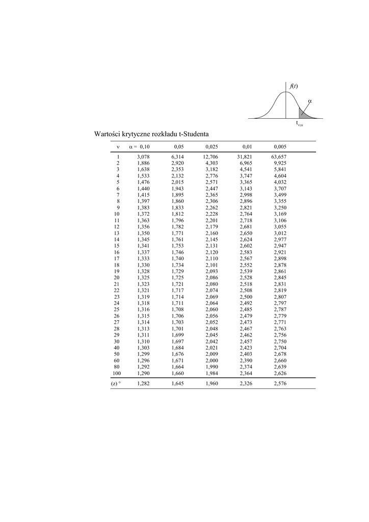f(t) α tν;α Wartości krytyczne rozkładu t-Studenta ν α = 0,10 0,05 0,025 0,01 0,005 1 2 3 4 5 6 7 8 9 10 11 12 13 14 15 16 17 18 19 20 21 22 23 24 25 26 27 28 29 30 40 50 60 80 100 3,078 1,886 1,638 1,533 1,476 1,440 1,415 1,397 1,383 1,372 1,363 1,356 1,350 1,345 1,341 1,337 1,333 1,330 1,328 1,325 1,323 1,321 1,319 1,318 1,316 1,315 1,314 1,313 1,311 1,310 1,303 1,299 1,296 1,292 1,290 6,314 2,920 2,353 2,132 2,015 1,943 1,895 1,860 1,833 1,812 1,796 1,782 1,771 1,761 1,753 1,746 1,740 1,734 1,729 1,725 1,721 1,717 1,714 1,711 1,708 1,706 1,703 1,701 1,699 1,697 1,684 1,676 1,671 1,664 1,660 12,706 4,303 3,182 2,776 2,571 2,447 2,365 2,306 2,262 2,228 2,201 2,179 2,160 2,145 2,131 2,120 2,110 2,101 2,093 2,086 2,080 2,074 2,069 2,064 2,060 2,056 2,052 2,048 2,045 2,042 2,021 2,009 2,000 1,990 1,984 31,821 6,965 4,541 3,747 3,365 3,143 2,998 2,896 2,821 2,764 2,718 2,681 2,650 2,624 2,602 2,583 2,567 2,552 2,539 2,528 2,518 2,508 2,500 2,492 2,485 2,479 2,473 2,467 2,462 2,457 2,423 2,403 2,390 2,374 2,364 63,657 9,925 5,841 4,604 4,032 3,707 3,499 3,355 3,250 3,169 3,106 3,055 3,012 2,977 2,947 2,921 2,898 2,878 2,861 2,845 2,831 2,819 2,807 2,797 2,787 2,779 2,771 2,763 2,756 2,750 2,704 2,678 2,660 2,639 2,626 (z) ∞ 1,282 1,645 1,960 2,326 2,576 f(χ2) α χ2 χ 2ν ; α Wartości krytyczne rozkładu chi-kwadrat ν α = 0,995 0,990 1 2 3 4 5 6 7 8 9 10 11 12 13 14 15 16 17 18 19 20 21 22 23 24 25 26 27 28 29 30 35 40 50 60 80 100 0,975 0,950 0,0439 0,0316 0,0398 0,0239 0,010 0,072 0,207 0,412 0,676 0,989 1,344 1,735 2,156 2,603 3,074 3,565 4,075 4,601 5,142 5,697 6,265 6,844 7,434 8,034 8,643 9,260 9,886 10,520 11,160 11,808 12,461 13,121 13,787 17,192 20,707 27,991 35,535 51,172 67,328 0,020 0,115 0,297 0,554 0,872 1,239 1,647 2,088 2,558 3,054 3,571 4,107 4,660 5,229 5,812 6,408 7,015 7,633 8,260 8,897 9,543 10,196 10,856 11,524 12,198 12,879 13,565 14,257 14,954 18,509 22,164 29,707 37,485 53,540 70,065 0,051 0,216 0,484 0,831 1,237 1,690 2,180 2,700 3,247 3,816 4,404 5,009 5,629 6,262 6,908 7,564 8,231 8,907 9,591 10,283 10,982 11,689 12,401 13,120 13,844 14,573 15,308 16,047 16,791 20,569 24,433 32,357 40,482 57,153 74,222 0,103 0,352 0,711 1,145 1,635 2,167 2,733 3,325 3,940 4,575 5,226 5,892 6,571 7,261 7,962 8,672 9,390 10,117 10,851 11,591 12,338 13,091 13,848 14,611 15,379 16,151 16,928 17,708 18,493 22,465 26,509 34,764 43,188 60,391 77,929 0,900 0,100 0,050 0,025 0,010 0,005 0,016 2,706 3,841 5,024 6,635 7,879 0,211 4,605 5,991 7,378 9,210 10,597 0,584 6,251 7,815 9,348 11,345 12,838 1,064 7,779 9,488 11,143 13,277 14,860 1,610 9,236 11,071 12,833 15,086 16,750 2,204 10,645 12,592 14,449 16,812 18,548 2,833 12,017 14,067 16,013 18,475 20,278 3,490 13,362 15,507 17,535 20,090 21,955 4,168 14,684 16,919 19,023 21,666 23,589 4,865 15,987 18,307 20,483 23,209 25,188 5,578 17,275 19,675 21,920 24,725 26,757 6,304 18,549 21,026 23,337 26,217 28,300 7,042 19,812 22,362 24,736 27,688 29,819 7,790 21,064 23,685 26,119 29,141 31,319 8,547 22,307 24,996 27,488 30,578 32,801 9,312 23,542 26,296 28,845 32,000 34,267 10,085 24,769 27,587 30,191 33,409 35,718 10,865 25,989 28,869 31,526 34,805 37,156 11,651 27,204 30,143 32,852 36,191 38,582 12,443 28,412 31,410 34,170 37,566 39,997 13,240 29,615 32,671 35,479 38,932 41,401 14,042 30,813 33,924 36,781 40,290 42,796 14,848 32,007 35,172 38,076 41,638 44,181 15,659 33,196 36,415 39,364 42,980 45,559 16,473 34,382 37,653 40,647 44,314 46,929 17,292 35,563 38,885 41,923 45,642 48,290 18,114 36,741 40,113 43,195 46,963 49,645 18,939 37,916 41,337 44,461 48,278 50,994 19,768 39,088 42,557 45,722 49,588 52,336 20,599 40,256 43,773 46,979 50,892 53,672 24,797 46,059 49,802 53,203 57,342 60,276 29,051 51,805 55,759 59,342 63,691 66,767 37,689 63,167 67,505 71,420 76,154 79,490 46,459 74,397 79,082 83,298 88,381 91,955 64,278 96,578 101,879 106,628 112,328 116,320 82,358 118,499 124,343 129,563 135,811 140,177