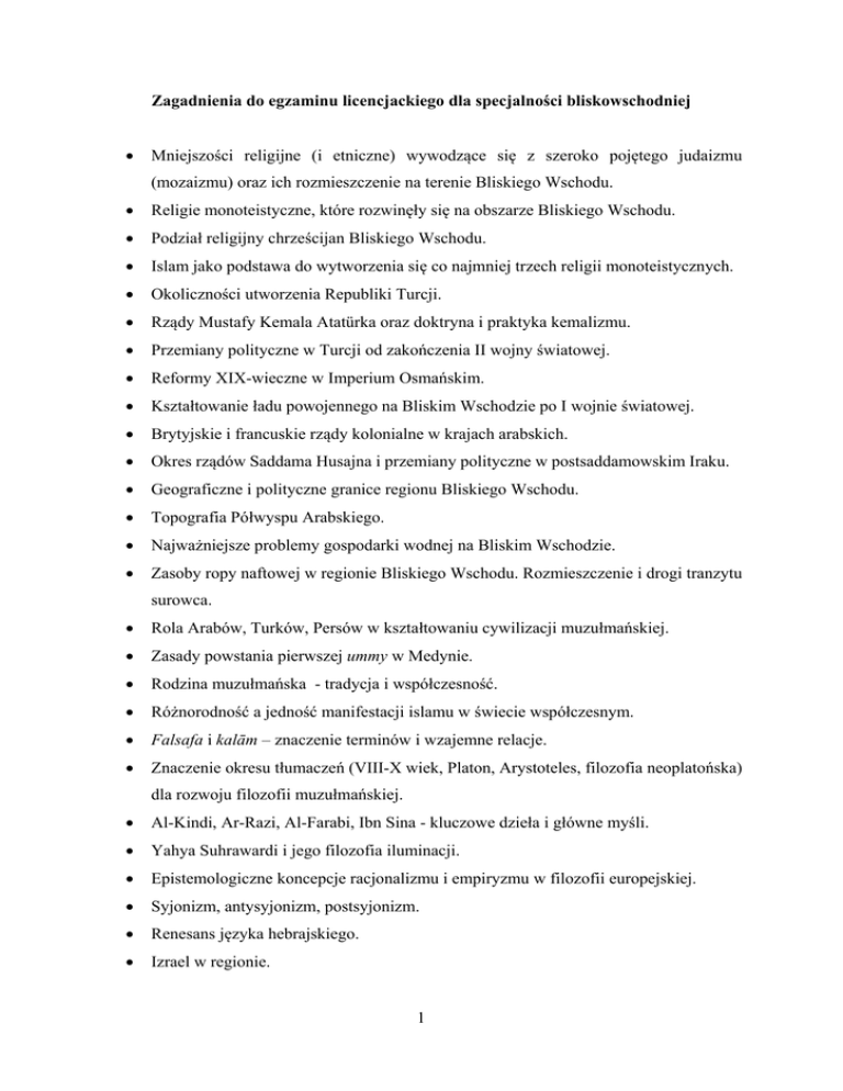 Zagadnienia do egzaminu licencjackiego dla specjalności bliskowschodniej Mniejszości religijne (i etniczne) wywodzące się z szeroko pojętego judaizmu (mozaizmu) oraz ich rozmieszczenie na terenie Bliskiego Wschodu. Religie monoteistyczne, które rozwinęły się na obszarze Bliskiego Wschodu. Podział religijny chrześcijan Bliskiego Wschodu. Islam jako podstawa do wytworzenia się co najmniej trzech religii monoteistycznych. Okoliczności utworzenia Republiki Turcji. Rządy Mustafy Kemala Atatürka oraz doktryna i praktyka kemalizmu. Przemiany polityczne w Turcji od zakończenia II wojny światowej. Reformy XIX-wieczne w Imperium Osmańskim. Kształtowanie ładu powojennego na Bliskim Wschodzie po I wojnie światowej. Brytyjskie i francuskie rządy kolonialne w krajach arabskich. Okres rządów Saddama Husajna i przemiany polityczne w postsaddamowskim Iraku. Geograficzne i polityczne granice regionu Bliskiego Wschodu. Topografia Półwyspu Arabskiego. Najważniejsze problemy gospodarki wodnej na Bliskim Wschodzie. Zasoby ropy naftowej w regionie Bliskiego Wschodu. Rozmieszczenie i drogi tranzytu surowca. Rola Arabów, Turków, Persów w kształtowaniu cywilizacji muzułmańskiej. Zasady powstania pierwszej ummy w Medynie. Rodzina muzułmańska - tradycja i współczesność. Różnorodność a jedność manifestacji islamu w świecie współczesnym. Falsafa i kalām – znaczenie terminów i wzajemne relacje. Znaczenie okresu tłumaczeń (VIII-X wiek, Platon, Arystoteles, filozofia neoplatońska) dla rozwoju filozofii muzułmańskiej. Al-Kindi, Ar-Razi, Al-Farabi, Ibn Sina - kluczowe dzieła i główne myśli. Yahya Suhrawardi i jego filozofia iluminacji. Epistemologiczne koncepcje racjonalizmu i empiryzmu w filozofii europejskiej. Syjonizm, antysyjonizm, postsyjonizm. Renesans języka hebrajskiego. Izrael w regionie. 1 Społeczeństwo Izraela. Specyfika gospodarek Bliskiego Wschodu. Surowce energetyczne z Bliskiego Wschodu i ich znaczenie. Charakterystyka wybranej gospodarki Bliskiego Wschodu. Miejsce i rola poezji oraz poety w kulturze świata arabskiego na przestrzeni epok. Nagib Mahfuz i współczesna proza arabska. An-Nahda - arabskie odrodzenie literackie i kulturalne. Definicja autorytarnego systemu politycznego (Juan J. Linz). Definicja demokracji jako poliarchii (Roberta Dahl). Cechy monarchii absolutnej. Pojęcie przywództwa charyzmatycznego i przykłady przywódców charyzmatycznych państw Bliskiego Wschodu Metafizyczna koncepcja monizmu, dualizmu i pluralizmu w filozofii europejskiej. Znaczenie przypowieści o jaskini Platona dla kultury europejskiej. Koncepcja metafizycznego realizmu i idealizmu w filozofii europejskiej. Epistemologiczne koncepcje racjonalizmu i empiryzmu w filozofii europejskiej. Rodzaje dóbr objętych ochroną w ramach prawa własności intelektualnej. Kwestia prawa własności intelektualnej a praw autorskich. System ochrony własności intelektualnej w wybranym państwie Bliskiego Wschodu. Kultury organizacyjne według Geerta Hofstede. Przedsiębiorczość w wymiarze międzykulturowym. Globalizacja, glokalizacja, hybrydyzacja w kontekście zarządzania międzykulturowego. Geneza i znaczenie rządów Umajjadów. Kalifat Abbasydzi i jego decentralizacja. Panowie Egiptu: Fatymidzi i Mamelucy. Rozwój i upadek Imperium Osmańskiego. Podstawowe założenia koncepcji orientalizmu Edwarda Saida i jej recepcja wśród badaczy i krytyków. Orient muzułmański jako odmiana fascynacji szeroko pojętym Wschodem. System socjalizacji w wybranym kraju Bliskiego Wschodu. Sztuka arabsko-muzułmańska epoki klasycznej. Ogólna charakterystyka. 2 Estetyka muzułmańska. Podstawowe założenia. Miejsce i rola kaligrafii w kulturze i sztuce Bliskiego Wschodu. Współczesna arabska sztuka zaangażowana a przemiany polityczne, społeczne, gospodarcze i kulturowe. Ogólna charakterystyka; czołowi przedstawiciele. Sztuka Arabskiej Wiosny. Ogólna charakterystyka; czołowi przedstawiciele. Cenzura i wolność słowa w krajach Bliskiego Wschodu. Media społecznościowe w świecie arabskim a przemiany polityczne, społeczne, ekonomiczne i kulturowe. Powstanie, działalność oraz funkcja telewizji Al-Dżazira. Dziennikarze i dziennikarstwo na Bliskim Wschodnie. Religia a media na Bliskim Wschodnie. 3