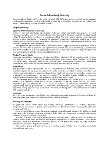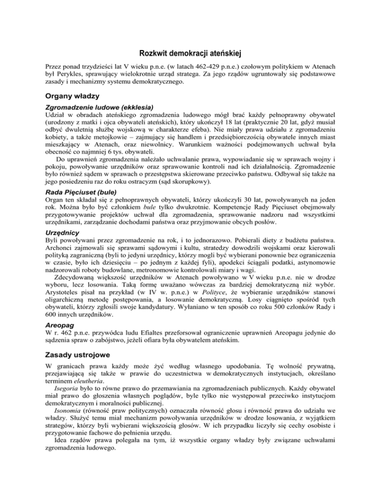 Rozkwit demokracji ateńskiej Przez ponad trzydzieści lat V wieku p.n.e. (w latach 462-429 p.n.e.) czołowym politykiem w Atenach był Perykles, sprawujący wielokrotnie urząd stratega. Za jego rządów ugruntowały się podstawowe zasady i mechanizmy systemu demokratycznego. Organy władzy Zgromadzenie ludowe (ekklesia) Udział w obradach ateńskiego zgromadzenia ludowego mógł brać każdy pełnoprawny obywatel (urodzony z matki i ojca obywateli ateńskich), który ukończył 18 lat (praktycznie 20 lat, gdyż musiał odbyć dwuletnią służbę wojskową w charakterze efeba). Nie miały prawa udziału z zgromadzeniu kobiety, a także metojkowie – zajmujący się handlem i przedsiębiorczością obywatele innych miast mieszkający w Atenach, oraz niewolnicy. Warunkiem ważności podejmowanych uchwał była obecność co najmniej 6 tys. obywateli. Do uprawnień zgromadzenia należało uchwalanie prawa, wypowiadanie się w sprawach wojny i pokoju, powoływanie urzędników oraz sprawowanie kontroli nad ich działalnością. Zgromadzenie było również sądem w sprawach o przestępstwa skierowane przeciwko państwu. Odbywał się także na jego posiedzeniu raz do roku ostracyzm (sąd skorupkowy). Rada Pięciuset (bule) Organ ten składał się z pełnoprawnych obywateli, którzy ukończyli 30 lat, powoływanych na jeden rok. Można było być członkiem bule tylko dwukrotnie. Kompetencje Rady Pięciuset obejmowały przygotowywanie projektów uchwał dla zgromadzenia, sprawowanie nadzoru nad wszystkimi urzędnikami, zarządzanie dochodami państwa oraz przyjmowanie obcych posłów. Urzędnicy Byli powoływani przez zgromadzenie na rok, i to jednorazowo. Pobierali diety z budżetu państwa. Archonci zajmowali się sprawami sądowymi i kultu, stratedzy dowodzili wojskami oraz kierowali polityką zagraniczną (byli to jedyni urzędnicy, którzy mogli być wybierani ponownie bez ograniczenia w czasie, było ich dziesięciu – po jednym z każdej fyli), apodekci ściągali podatki, astynomowie nadzorowali roboty budowlane, metronomowie kontrolowali miary i wagi. Zdecydowaną większość urzędników w Atenach powoływano w V wieku p.n.e. nie w drodze wyboru, lecz losowania. Taką formę uważano wówczas za bardziej demokratyczną niż wybór. Arystoteles pisał na przykład (w IV w. p.n.e.) w Polityce, że wybieranie urzędników stanowi oligarchiczną metodę postępowania, a losowanie demokratyczną. Losy ciągnięto spośród tych obywateli, którzy zgłosili swoje kandydatury. Wyłaniano w ten sposób co roku 500 członków Rady i 600 innych urzędników. Areopag W r. 462 p.n.e. przywódca ludu Efialtes przeforsował ograniczenie uprawnień Areopagu jedynie do sądzenia spraw o zabójstwo, jeżeli ofiara była obywatelem ateńskim. Zasady ustrojowe W granicach prawa każdy może żyć według własnego upodobania. Tę wolność prywatną, przejawiającą się także w prawie do uczestnictwa w demokratycznych instytucjach, określano terminem eleutheria. Isegoria było to równe prawo do przemawiania na zgromadzeniach publicznych. Każdy obywatel miał prawo do głoszenia własnych poglądów, byle tylko nie występował przeciwko instytucjom demokratycznym i moralności publicznej. Isonomia (równość praw politycznych) oznaczała równość głosu i równość prawa do udziału we władzy. Służyć temu miał mechanizm powoływania urzędników w drodze losowania, z wyjątkiem strategów, którzy byli wybierani większością głosów. W ich przypadku liczyły się cechy osobiste i przygotowanie fachowe do pełnienia urzędu. Idea rządów prawa polegała na tym, iż wszystkie organy władzy były związane uchwałami zgromadzenia ludowego. Społeczeństwo Aten Obywatele Do kategorii obywateli zaliczony mógł być tylko mężczyzna pochodzący z legalnego związku małżeńskiego, którego oboje rodzice byli obywatelami ateńskimi. Prawa obywatelskie młody Ateńczyk nabywał w wieku 18 lat, z chwilą gdy został wpisany do księgi członków demu przez starostę (demarchosa). Głównym obowiązkiem obywatela była służba wojskowa, która dotyczyła mężczyzn do 60 roku życia. Z tego obowiązku byli zwolnieni członkowie Rady Pięciuset, urzędnicy oraz właściciele okrętów. Metojkowie Metojkami byli cudzoziemcy mieszkający na stałe w ateńskiej polis. Zajmowali się głównie handlem i rzemiosłem. Nie posiadali praw politycznych, nie było im wolno nabywać nieruchomości, nie mogli wstępować w związki małżeńskie z osobami posiadającymi obywatelstwo ateńskie. Musieli płacić specjalny podatek (metoikion), zobowiązani byli także do służby wojskowej. Każdy metoikos musiał wybrać sobie patrona spośród obywateli ateńskich, który reprezentował go wobec władz. Wyzwoleńcy Sytuacja prawna wyzwoleńców (apeleuteroi) była zbliżona do pozycji metojków. Również musieli mieć patrona – z reguły był to ich dawny pan. Płacili metoikion, a oprócz tego specjalną opłatę zwaną triobolon. Niewolnicy Dzielili się na niewolników prywatnych i państwowych. Ci pierwsi używani byli do posług domowych, pracy w gospodarstwach wiejskich, w rzemiośle oraz pracowali jako wioślarze na statkach handlowych. Niewolnik prywatny był własnością pana, mógł być przez niego sprzedany, zastawiony, darowany, zapisany w testamencie lub obdarzony wolnością. Niewolnicy państwowi mieli własne gospodarstwa, pracowali jako pisarze w urzędach, kaci, z nich tworzono oddziały straży miejskiej, do nich należało utrzymywanie dróg publicznych. Niewolnicy obu kategorii rekrutowali się spośród jeńców wojennych, były to także osoby urodzone z matki niewolnicy lub zakupione na rynkach zagranicznych. Kobiety Niska była pozycja społeczna kobiety. Zamknięta była przed nią sfera życia publicznego, aktywność kobiet musiała się ograniczać do sfery domowej. Ich zadaniem było dostarczenie państwu ateńskiemu jak największej liczby przyszłych obywatel