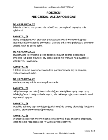 Przedszkole nr 1 w Piastowie „POD TOPOLĄ” RODZICU! NIE CZEKAJ, ALE ZAPOBIEGAJ! TO NIEPRAWDA, ŻE 3-letnie dziecko ma prawo nie mówid lub posługiwad się wyłącznie sylabami. PAMIĘTAJ, ŻE jedną z najczęstszych przyczyn powstawania wad wymowy i zgryzu jest niewłaściwy sposób połykania. Dziecko od 3 roku połykając, powinno unosid język za górne zęby. TO NIEPRAWDA, ŻE długotrwałe korzystanie przez dziecko z nawet dobrze dobranego smoczka lub picie z butelki czy ssanie palca nie wpływa na powstanie wad zgryzu i wymowy. PAMIĘTAJ, ŻE 3-letnie dziecko powinno swobodnie porozumiewad się za pomocą rozbudowanych zdao. TO NIEPRAWDA, ŻE wada wymowy minie w miarę dorastania. PAMIĘTAJ, ŻE oddychanie przez usta (otwarta buzia) jest nie tylko częstą przyczyną infekcji górnych dróg oddechowych, ale także sprzyja powstawaniu wad wymowy i zgryzu. PAMIĘTAJ, ŻE wszelkie zabawy usprawniające język i mięśnie twarzy ułatwiają Twojemu dziecku prawidłowy rozwój wymowy. PAMIĘTAJ, ŻE większośd zaburzeo mowy można zlikwidowad bądź znacznie złagodzid, jeżeli terapia rozpocznie się w wieku przedszkolnym. Strona 1 z 1 Opracowanie: Logopeda mgr Alicja Więckowska