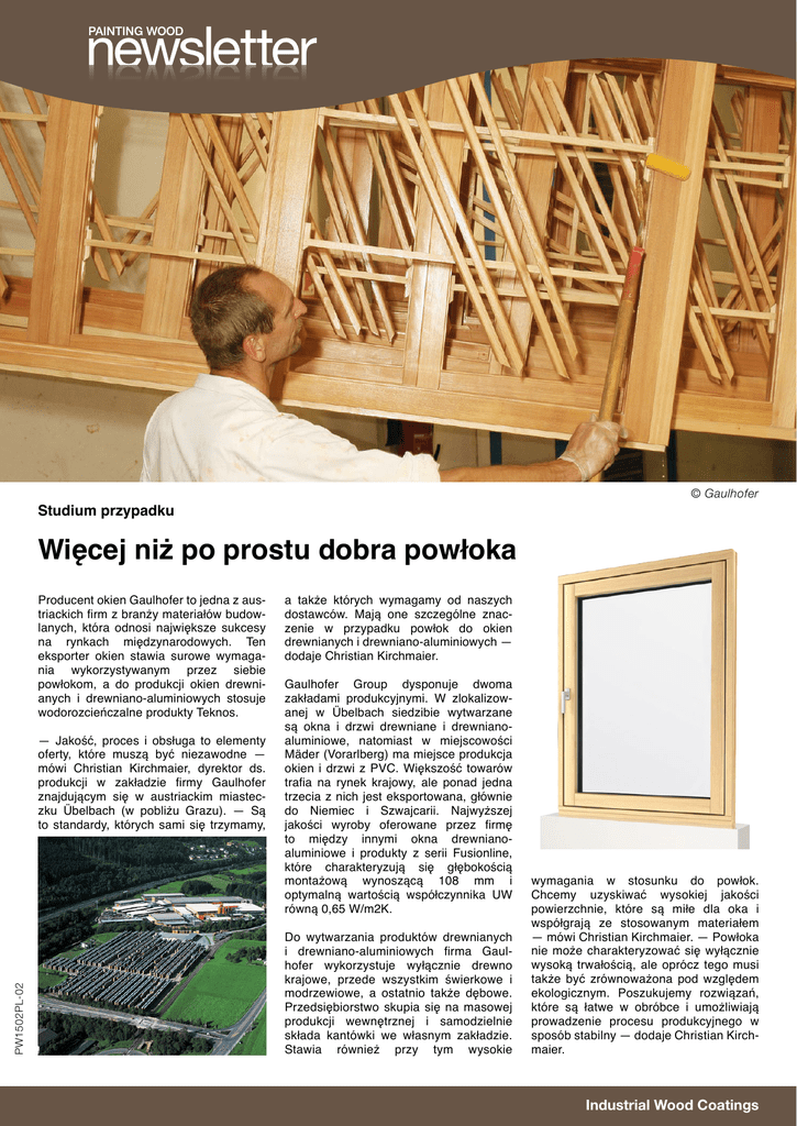 © Gaulhofer Studium przypadku Więcej niż po prostu dobra powłoka Producent okien Gaulhofer to jedna z austriackich firm z branży materiałów budowlanych, która odnosi największe sukcesy na rynkach międzynarodowych. Ten eksporter okien stawia surowe wymagania wykorzystywanym przez siebie powłokom, a do produkcji okien drewnianych i drewniano-aluminiowych stosuje wodorozcieńczalne produkty Teknos. PW1502PL-02 — Jakość, proces i obsługa to elementy oferty, które muszą być niezawodne — mówi Christian Kirchmaier, dyrektor ds. produkcji w zakładzie firmy Gaulhofer znajdującym się w austriackim miasteczku Übelbach (w pobliżu Grazu). — Są to standardy, których sami się trzymamy, a także których wymagamy od naszych dostawców. Mają one szczególne znaczenie w przypadku powłok do okien drewnianych i drewniano-aluminiowych — dodaje Christian Kirchmaier. Gaulhofer Group dysponuje dwoma zakładami produkcyjnymi. W zlokalizowanej w Übelbach siedzibie wytwarzane są okna i drzwi drewniane i drewnianoaluminiowe, natomiast w miejscowości Mäder (Vorarlberg) ma miejsce produkcja okien i drzwi z PVC. Większość towarów trafia na rynek krajowy, ale ponad jedna trzecia z nich jest eksportowana, głównie do Niemiec i Szwajcarii. Najwyższej jakości wyroby oferowane przez firmę to między innymi okna drewnianoaluminiowe i produkty z serii Fusionline, które charakteryzują się głębokością montażową wynoszącą 108 mm i optymalną wartością współczynnika UW równą 0,65 W/m2K. Do wytwarzania produktów drewnianych i drewniano-aluminiowych firma Gaulhofer wykorzystuje wyłącznie drewno krajowe, przede wszystkim świerkowe i modrzewiowe, a ostatnio także dębowe. Przedsiębiorstwo skupia się na masowej produkcji wewnętrznej i samodzielnie składa kantówki we własnym zakładzie. Stawia również przy tym wysokie wymagania w stosunku do powłok. Chcemy uzyskiwać wysokiej jakości powierzchnie, które są miłe dla oka i współgrają ze stosowanym materiałem — mówi Christian Kirchmaier. — Powłoka nie może charakteryzować się wyłącznie wysoką trwałością, ale oprócz tego musi także być zrównoważona pod względem ekologicznym. Poszukujemy rozwiązań, które są łatwe w obróbce i umożliwiają prowadzenie procesu produkcyjnego w sposób stabilny — dodaje Christian Kirchmaier. Industrial Wood Coatings Wieloletnie doświadczenie w dziedzinie powłok Firma Gaulhofer produkuje okna drewniane i drewniano-aluminiowe w zakładzie w Übelbach. Zainstalowane są w nim systemy impregnacji i aplikacji podkładu metodą polewania, a także dwa automatyczne systemy natryskowe przeznaczone do nakładania kryjącej, transparentnej i bezbarwnej warstwy nawierzchniowej. Niezależnie od rodzaju powłoki przedsiębiorstwo polega na rozwiązaniach oferowanych przez ich północnoeuropejskiego producenta, którym jest Teknos. W zależności od gatunku drewna firma Gaulhofer stosuje system 3-warstwowy w przypadku powłok przezroczystych oraz system 3- bądź 4-warstwowy w przypadku powłok kryjących. Przy przygotowywaniu powłok przezroczystych i kryjących wykorzystuje ona odpowiednie produkty wodorozcieńczalne GORI 356 (środek do konserwacji drewna), GORI 615, 616 i 650 (podkład i warstwa pośrednia) oraz GORI 660 (warstwa nawierzchniowa). Do okien drewniano-aluminiowych firma stosuje wodorozcieńczalny olej z drzewa iglastego GORI 475, który podkreśla barwę drewna i rysunek jego słojów. — Produkty GORI pozwalają nam uzyskać odpowiednią jakość powierzchni i zapewnić to, że uruchamiane przez nas procesy charakteryzują się odpowiednimi cechami. Powłok tych używamy ponadto od niemal 20 lat, co oznacza, że możemy polegać na ich trwałości — mówi Christian Kirchmaier. Oprócz należytej jakości i procesów charakteryzujących się odpowiednimi cechami dużo zależy też od obsługi. Typowym zagadnieniem są tutaj kolory specjalne. — Gdy chodzi o okna drewniane, to dużą rolę zawsze odgrywa projekt oraz indywidualne upodobania. Właściciele budynków i architekci skłaniają się coraz bardziej ku większym powierzchniom okiennym i oryginalnym kolorom — mówi Kirchmaier. Gaulhofer coraz częściej zamawia więc powłoki i bejce w kolorach wybranych przez klientów. Są one opracowywane i mieszane przy udziale laboratorium Teknos w Fuldzie. Przedsiębiorstwo współpracuje także ściśle z dostawcami powłok w przypadku wprowadzania innowacji mających wpływ na materiały lub procedury produkcyjne. Przed wprowadzeniem profilów dębowych i rozpoczęciem produkcji pracownicy Gaulhofer wspólnie z technikami ds. zastosowań firmy Teknos przeanalizowali i wypróbowali wiele różnych systemów powłok. — Dla nas odpowiednia powłoka to więcej niż po prostu dobra powłoka. To kompletna oferta, która obejmuje odpowiednią jakość powierzchni, bezproblemowe procesy i wyspecjalizowaną obsługę — podsumowuje Christian Kirchmaier. www.gaulhofer.com © Gaulhofer Industrial Wood Coatings