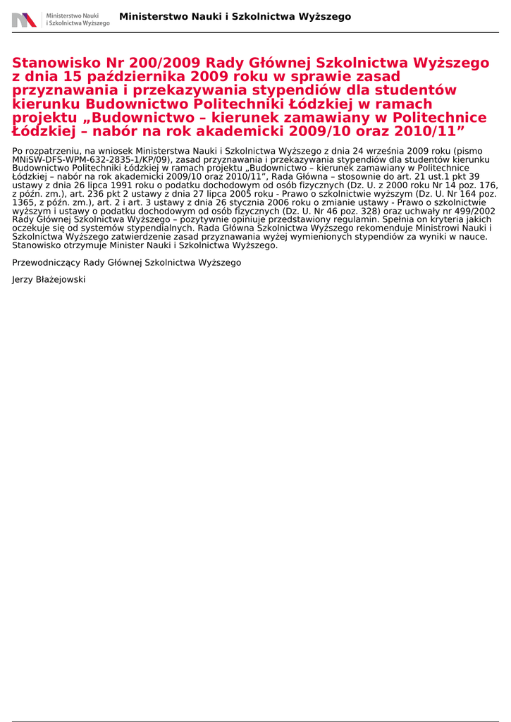 Ministerstwo Nauki i Szkolnictwa Wyższego Stanowisko Nr 200/2009 Rady Głównej Szkolnictwa Wyższego z dnia 15 października 2009 roku w sprawie zasad przyznawania i przekazywania stypendiów dla studentów kierunku Budownictwo Politechniki Łódzkiej w ramach projektu „Budownictwo – kierunek zamawiany w Politechnice Łódzkiej – nabór na rok akademicki 2009/10 oraz 2010/11” Po rozpatrzeniu, na wniosek Ministerstwa Nauki i Szkolnictwa Wyższego z dnia 24 września 2009 roku (pismo MNiSW-DFS-WPM-632-2835-1/KP/09), zasad przyznawania i przekazywania stypendiów dla studentów kierunku Budownictwo Politechniki Łódzkiej w ramach projektu „Budownictwo – kierunek zamawiany w Politechnice Łódzkiej – nabór na rok akademicki 2009/10 oraz 2010/11”, Rada Główna – stosownie do art. 21 ust.1 pkt 39 ustawy z dnia 26 lipca 1991 roku o podatku dochodowym od osób fizycznych (Dz. U. z 2000 roku Nr 14 poz. 176, z późn. zm.), art. 236 pkt 2 ustawy z dnia 27 lipca 2005 roku - Prawo o szkolnictwie wyższym (Dz. U. Nr 164 poz. 1365, z późn. zm.), art. 2 i art. 3 ustawy z dnia 26 stycznia 2006 roku o zmianie ustawy - Prawo o szkolnictwie wyższym i ustawy o podatku dochodowym od osób fizycznych (Dz. U. Nr 46 poz. 328) oraz uchwały nr 499/2002 Rady Głównej Szkolnictwa Wyższego – pozytywnie opiniuje przedstawiony regulamin. Spełnia on kryteria jakich oczekuje się od systemów stypendialnych. Rada Główna Szkolnictwa Wyższego rekomenduje Ministrowi Nauki i Szkolnictwa Wyższego zatwierdzenie zasad przyznawania wyżej wymienionych stypendiów za wyniki w nauce. Stanowisko otrzymuje Minister Nauki i Szkolnictwa Wyższego. Przewodniczący Rady Głównej Szkolnictwa Wyższego Jerzy Błażejowski Powered by TCPDF (www.tcpdf.org)