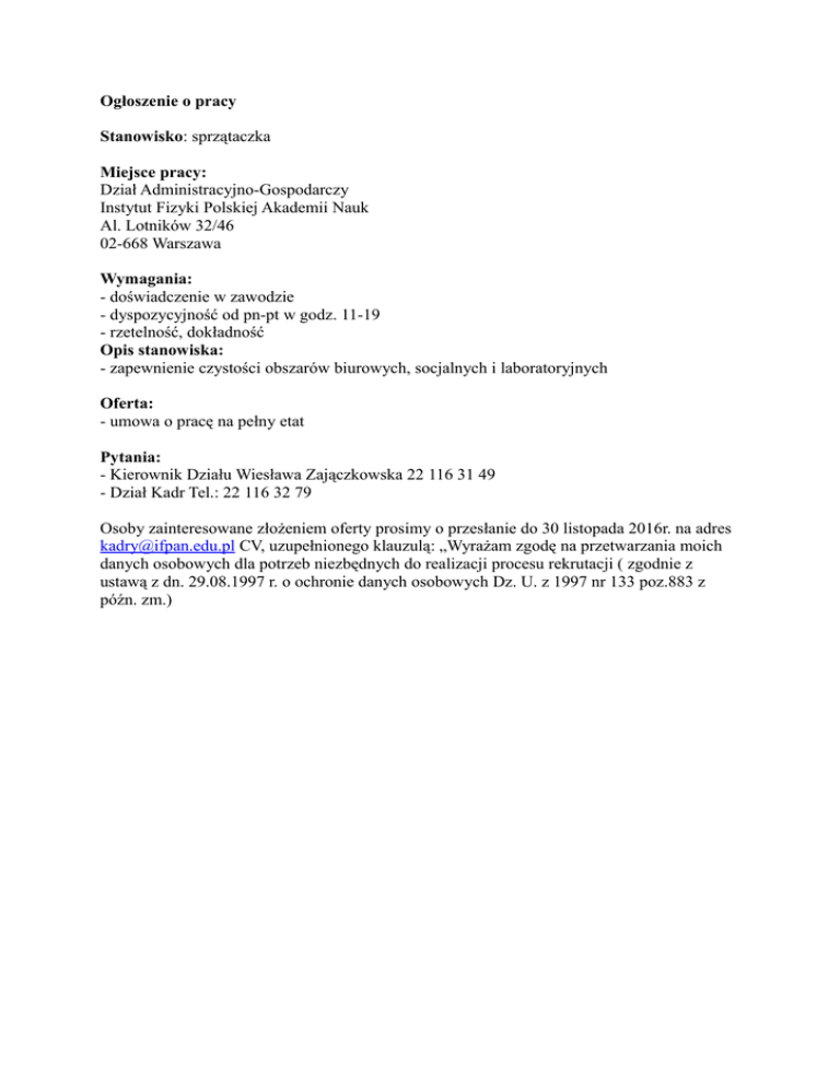 Ogłoszenie o pracy Stanowisko: sprzątaczka Miejsce pracy: Dział Administracyjno-Gospodarczy Instytut Fizyki Polskiej Akademii Nauk Al. Lotników 32/46 02-668 Warszawa Wymagania: - doświadczenie w zawodzie - dyspozycyjność od pn-pt w godz. 11-19 - rzetelność, dokładność Opis stanowiska: - zapewnienie czystości obszarów biurowych, socjalnych i laboratoryjnych Oferta: - umowa o pracę na pełny etat Pytania: - Kierownik Działu Wiesława Zajączkowska 22 116 31 49 - Dział Kadr Tel.: 22 116 32 79 Osoby zainteresowane złożeniem oferty prosimy o przesłanie do 30 listopada 2016r. na adres [email protected] CV, uzupełnionego klauzulą: „Wyrażam zgodę na przetwarzania moich danych osobowych dla potrzeb niezbędnych do realizacji procesu rekrutacji ( zgodnie z ustawą z dn. 29.08.1997 r. o ochronie danych osobowych Dz. U. z 1997 nr 133 poz.883 z późn. zm.)