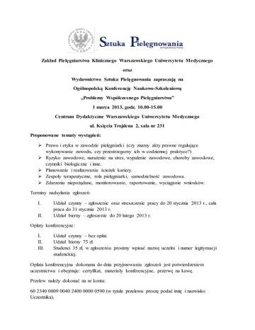 Zakład Pielęgniarstwa Klinicznego Warszawskiego Uniwersytetu Medycznego oraz Wydawnictwo Sztuka Pielęgnowania zapraszają na Ogólnopolską Konferencję Naukowo-Szkoleniową „Problemy Współczesnego Pielęgniarstwa” 1 marca 2013, godz. 10.00-15.00 Centrum Dydaktyczne Warszawskiego Uniwersytetu Medycznego ul. Księcia Trojdena 2, sala nr 231 Proponowane tematy wystąpień: Prawo i etyka w zawodzie pielęgniarki (czy znamy akty prawne regulujące wykonywanie zawodu, czy przestrzegamy ich w codziennej praktyce?) Ryzyko zawodowe, narażenie na stres, wypalenie zawodowe, choroby zawodowe, czynniki biologiczne i inne. Planowanie i realizowanie ścieżek kariery. Zespoły terapeutyczne, rola pielęgniarki, samodzielność zawodowa. Zdarzenia niepożądane, monitorowanie, raportowanie, wyciąganie wniosków. Terminy nadsyłania zgłoszeń: I. II. Udział czynny – zgłoszenie oraz streszczenie pracy do 20 stycznia 2013 r., cała praca do 31 stycznia 2013 r. Udział bierny – zgłoszenie do 20 lutego 2013 r. Opłaty konferencyjne: I. II. III. Udział czynny – bez opłat. Udział bierny 75 zł. Studenci 35 zł, w zgłoszeniu prosimy wpisać nazwę uczelni i numer legitymacji studenckiej. Opłata konferencyjna dokonana do dnia przyjmowania zgłoszeń jest potwierdzeniem uczestnictwa i obejmuje: certyfikat, materiały konferencyjne, przerwę na kawę. Przelew należy dokonać na nr konta: 60 2340 0009 0040 2400 0000 0590 (w tytule przelewu proszę podać imię i nazwisko Uczestnika).
