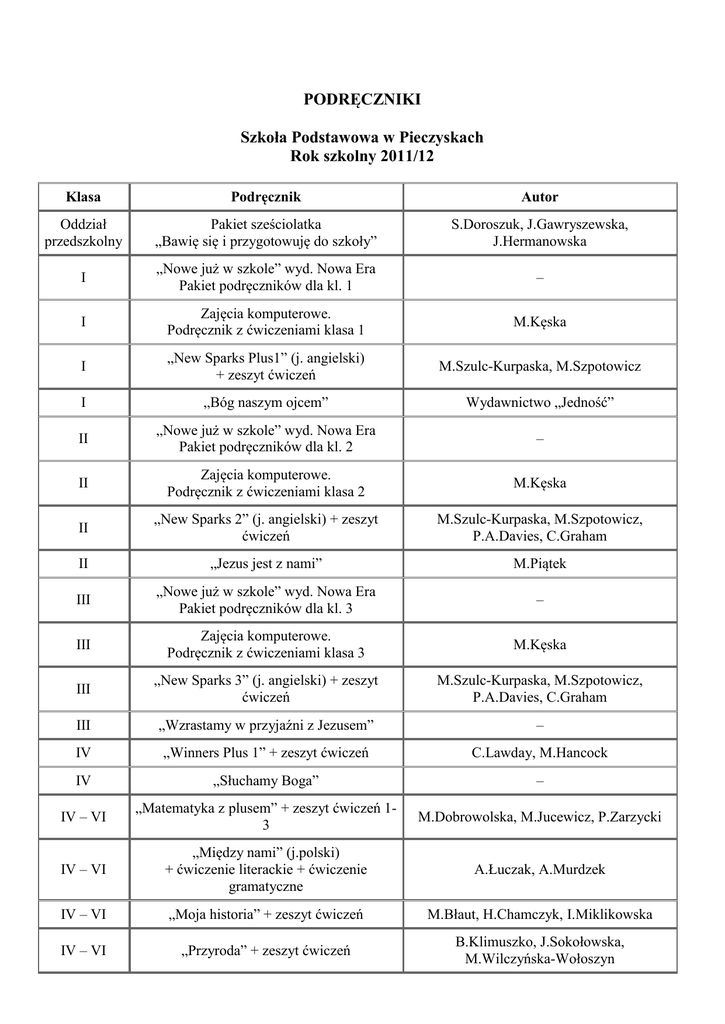 Podręczniki – 2011/2012 - Szkoła Podstawowa w Pieczyskach