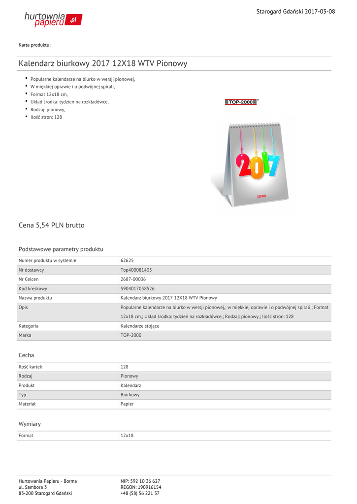 Starogard Gdański 2017-03-08 Karta produktu: Kalendarz biurkowy 2017 12X18 WTV Pionowy Popularne kalendarze na biurko w wersji pionowej, W miękkiej oprawie i o podwójnej spirali, Format 12x18 cm, Układ środka: tydzień na rozkładówce, Rodzaj: pionowy, Ilość stron: 128 Cena 5,54 PLN brutto Podstawowe parametry produktu Numer produktu w systemie 62625 Nr dostawcy Top400081435 Nr Celcen 2687-00006 Kod kreskowy 5904017058526 Nazwa produktu Kalendarz biurkowy 2017 12X18 WTV Pionowy Opis Popularne kalendarze na biurko w wersji pionowej,; w miękkiej oprawie i o podwójnej spirali,; Format 12x18 cm,; Układ środka: tydzień na rozkładówce,; Rodzaj: pionowy,; Ilość stron: 128 Kategoria Kalendarze stojące Marka TOP-2000 Cecha Ilość kartek 128 Rodzaj Pionowy Produkt Kalendarz Typ Biurkowy Materiał Papier Wymiary Format 12x18 Hurtowania Papieru - Borma ul. Sambora 3 83-200 Starogard Gdański NIP: 592 10 36 627 REGON: 190916154 +48 (58) 56 221 37 Starogard Gdański 2017-03-08 Karta katalogowa produktu cd. Kalendarz biurkowy 2017 12X18 WTV Pionowy Certyfikaty Hit Standard Nowy produkt w ofercie Nowość Pozostałe zdjęcia produktu Serdecznie zapraszamy do współpracy Hurtowania Papieru - Borma zespół. Hurtowania Papieru - Borma ul. Sambora 3 83-200 Starogard Gdański NIP: 592 10 36 627 REGON: 190916154 +48 (58) 56 221 37