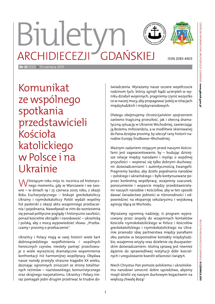 Nr 23 (332) • 13 czerwca 2015 Komunikat ze wspólnego spotkania przedstawicieli Kościoła katolickiego w Polsce i na Ukrainie W świadczenia. Wyrażamy nasze szczere współczucie rodzinom tych, którzy zginęli bądź ucierpieli w wyniku działań wojennych, pragniemy czynić wszystko co w naszej mocy, aby propagować pokój w relacjach międzyludzkich i międzynarodowych. Centrum Informacyjne Archidiecezji Gdańskiej www.gdansk.gosc.pl ISSN 2083-4403 Dlatego obejmujemy chrześcijańskim spojrzeniem zarówno tragiczną przeszłość, jak i obecną dramatyczną sytuację w Ukrainie Wschodniej, zawierzając ją Bożemu miłosierdziu, a w modlitwie skierowanej do Pana dziejów prosimy, by uleczył rany historii narodów Europy Środkowo–Wschodniej. Ważnym zadaniem stojącym przed naszymi Kościołami jest zagwarantowanie, by – budując dzisiejsze relacje między narodami i myśląc o wspólnej przyszłości – wspierać się tylko dobrymi duchowymi doświadczeniami i autentycznością Ewangelii. Pragniemy bardzo, aby dzieło pojednania narodów – polskiego i ukraińskiego – było kontynuowane poprzez konkretną współpracę, wzajemny szacunek, porozumienie i wsparcie między przedstawicielami naszych narodów i Kościołów, aby w ten sposób dawać świadectwo jedności w różnorodności i odpowiedzieć na ekspansję sekularyzmu i wojskową agresję idącą ze Wschodu. Wyrażamy ogromną nadzieję, iż program wypracowany przez zespoły do wzajemnych kontaktów Kościoła rzymskokatolickiego w Polsce i Kościołów greckokatolickiego i rzymskokatolickiego na Ukrainie przerodzi ideę partnerstwa między parafiami obu państw w bezpośrednie kontakty międzyludzkie, wzajemne wizyty oraz dzielenie się duszpasterskim doświadczeniem. Istotną sprawą jest również dążenie do sprawiedliwej restytucji dóbr kościelnych i uregulowanie kwestii własności świątyń. Ukraińcy i Polacy mają w swej historii wiele kart dobrosąsiedzkiego współistnienia i wspólnych heroicznych czynów, niestety pamięć przechowuje o wiele wyraziściej dramatyczne wspomnienia konfrontacji niż harmonijnej współpracy. Obydwa nasze narody przeżyły straszne tragedie XX wieku, doznając ogromnych zniszczeń ze strony totalitarnych reżimów – nazistowskiego, komunistycznego oraz skrajnego nacjonalizmu. Ukraińcy i Polacy nieraz pomagali jedni drugim przetrwać te trudne do- Niech Chrystus Pan pomoże polskiemu i ukraińskiemu narodowi umocnić dobre sąsiedztwo, abyśmy mogli dzielić się naszym duchowym bogactwem na większą chwałę Bożą! 1 Biuletyn Archidiecezji Gdańskiej 13 czerwca 2015 bieżącym roku mija 10. rocznica od historycznego momentu, gdy w Warszawie i we Lwowie – w dniach 19 i 25 czerwca 2005 roku, z okazji Roku Eucharystycznego – biskupi greckokatoliccy Ukrainy i rzymskokatoliccy Polski wydali wspólny list pasterski z okazji aktu wzajemnego przebaczenia i pojednania. Nawoływali w nim do wzniesienia się ponad polityczne poglądy i historyczne zaszłości, ponad kościelne obrządki i narodowość – ukraińską i polską, aby z mocą wypowiedzieć słowa: „Przebaczamy i prosimy o przebaczenie”. Centrum Informacyjne Archidiecezji Gdańskiej www.gdansk.gosc.pl nr 23 (332) Komunikaty kąt) odbędzie się Wieczór chwały, organizowany przez wspólnotę Ucho Igielne. W programie: konferencja, świadectwo, pantomima, Eucharystia, modlitwa wstawiennicza, czuwanie i agapa. II Ogólnopolskie Forum Chrześcijańskie Wiara w biznesie ►►20 czerwca 2015 O Spotkanie dla katechetów Archidiecezji Gdańskiej gólnopolskie Forum Chrześcijańskie odbędzie się 20 czerwca br. w Warszawie na Uniwersytecie Kardynała Stefana Wyszyńskiego (ul. Wóycickiego 1/3, Audytorium Maximum - Aula Schumana), początek o godz. 9.00. Wszelkie informacje dostępne są na stronie internetowej: https://rejestracja. wiarawbiznesie.pl. Wiara w biznesie to inicjatywa stworzona przez katolików, która ma na celu jednoczyć chrześcijan – ludzi sumienia – aby swoją postawą dawali świadectwo o wierze zarówno w życiu zawodowym, jak i osobistym. Skierowana jest przede wszystkim do przedsiębiorców a także do dyrektorów, menedżerów, prawników, lekarzy, wykładowców, studentów oraz tych, którzy chcą zmienić świat zaczynając od siebie. Z apraszamy serdecznie wszystkich Katechetów Archidiecezji Gdańskiej – księży, siostry zakonne i osoby świeckie, na spotkanie z Arcybiskupem Metropolitą Gdańskim Sławojem Leszkiem Głódziem, które rozpocznie się w sobotę, 20 czerwca 2015 r. o godz. 11.00 modlitwą Liturgii Godzin w Auli Jana Pawła II w Gdańsku Oliwie. W programie spotkania miedzy innymi: wykład pt: „Czy Internet to samo zło? Między cyberprzemocą a smartfonem na katechezie”. Wykład poprowadzi Pani Magdalena Guziak - Nowak (redaktor naczelny dwutygodnika dla młodzieży Droga, dziennikarka Przewodnika Katolickiego, specjalista do spraw komunikacji społecznej). ►►20 czerwca 2015 ►►20 czerwca 2015 Komunikat w sprawie zbiórki ofiar na rzecz Gdańskiego Seminarium Duchownego w Dekanacie Morskim, Puckim i Żarnowieckim Zaproszenie na uroczystość święceń diakonatu Z apraszamy do udziału w uroczystości święceń diakonatu, które odbędą się w sobotę, 20 czerwca br. o godz. 10.00 w Sanktuarium Matki Bożej Fatimskiej w Gdańsku Żabiance. Pamiętajmy o kandydatach do święceń w naszych codziennych modlitwach. Biuletyn Archidiecezji Gdańskiej 13 czerwca 2015 Z godnie z komunikatem Księdza Arcybiskupa Metropolity z dnia 7 listopada zbiórka ofiar na potrzeby Gdańskiego Seminarium Duchownego w parafiach Dekanatu Morskiego, Puckiego i Żarnowieckiego odbędzie się w niedzielę 21 czerwca 2015 roku. Przedstawiciele Seminarium przybędą do każdej parafii i włączą się w liturgię poprzez wprowadzenie do Mszy św., wygłoszenie homilii lub odczytanie listu. Zbiórkę należy zapowiedzieć z ambon w niedzielę poprzedzającą (14 czerwca)