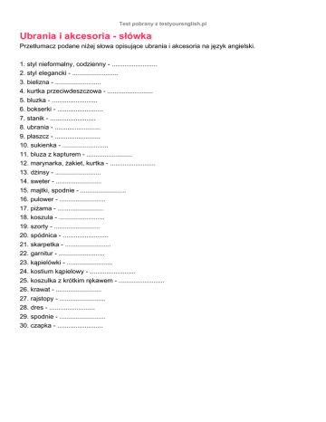 Test pobrany z testyourenglish.pl Ubrania i akcesoria - słówka Przetłumacz podane niżej słowa opisujące ubrania i akcesoria na język angielski. 1. styl nieformalny, codzienny - ......................... 2. styl elegancki - ......................... 3. bielizna - ......................... 4. kurtka przeciwdeszczowa - ......................... 5. bluzka - ......................... 6. bokserki - ......................... 7. stanik - ......................... 8. ubrania - ......................... 9. płaszcz - ......................... 10. sukienka - ......................... 11. bluza z kapturem - ......................... 12. marynarka, żakiet, kurtka - ......................... 13. dżinsy - ......................... 14. sweter - ......................... 15. majtki, spodnie - ......................... 16. pulower - ......................... 17. piżama - ......................... 18. koszula - ......................... 19. szorty - ......................... 20. spódnica - ......................... 21. skarpetka - ......................... 22. garnitur - ......................... 23. kąpielówki - ......................... 24. kostium kąpielowy - ......................... 25. koszulka z krótkim rękawem - ......................... 26. krawat - ......................... 27. rajstopy - ......................... 28. dres - ......................... 29. spodnie - ......................... 30. czapka - .........................