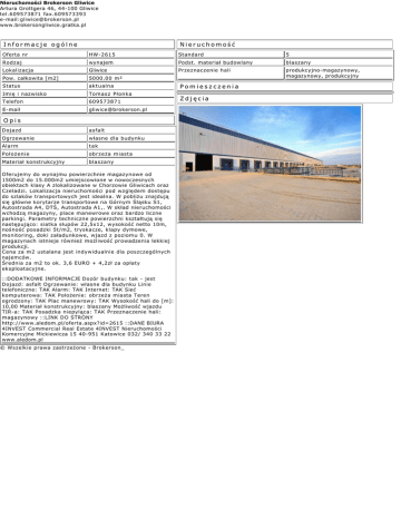 Nieruchomości Brokerson Gliwice Artura Grottgera 46, 44-100 Gliwice tel.609573871 fax.609573393 e-mail:[email protected] www.brokersongliwice.gratka.pl Informacje ogólne Nieruchomość Oferta nr HW-2615 Standard 5 Rodzaj wynajem Podst. materiał budowlany blaszany Lokalizacja Gliwice Przeznaczenie hali Pow. całkowita [m2] 5000.00 m² produkcyjno-magazynowy, magazynowy, produkcyjny Status aktualna Imię i nazwisko Tomasz Płonka Telefon 609573871 E-mail [email protected] Opis Dojazd asfalt Ogrzewanie własne dla budynku Alarm tak Położenie obrzeża miasta Materiał konstrukcyjny blaszany Oferujemy do wynajmu powierzchnie magazynowe od 1500m2 do 15.000m2 umiejscowione w nowoczesnych obiektach klasy A zlokalizowane w Chorzowie Gliwicach oraz Czeladzi. Lokalizacja nieruchomości pod względem dostępu do szlaków transportowych jest idealna. W pobliżu znajdują się główne korytarze transportowe na Górnym Śląsku S1, Autostrada A4, DTŚ, Autostrada A1,. W skład nieruchomości wchodzą magazyny, place manewrowe oraz bardzo liczne parkingi. Parametry techniczne powierzchni kształtują się następująco: siatka słupów 22,5x12, wysokość netto 10m, nośność posadzki 5t/m2, tryskacze, klapy dymowe, monitoring, doki załadunkowe, wjazd z poziomu 0. W magazynach istnieje również możliwość prowadzenia lekkiej produkcji. Cena za m2 ustalana jest indywidualnie dla poszczególnych najemców. Średnia za m2 to ok. 3,6 EURO + 4,2zł za opłaty eksploatacyjne. ::DODATKOWE INFORMACJE Dozór budynku: tak - jest Dojazd: asfalt Ogrzewanie: własne dla budynku Linie telefoniczne: TAK Alarm: TAK Internet: TAK Sieć komputerowa: TAK Położenie: obrzeża miasta Teren ogrodzony: TAK Plac manewrowy: TAK Wysokość hali do [m]: 10,00 Materiał konstrukcyjny: blaszany Możliwość wjazdu TIR-a: TAK Posadzka niepyląca: TAK Przeznaczenie hali: magazynowy ::LINK DO STRONY http://www.aledom.pl/oferta.aspx?id=2615 ::DANE BIURA 4INVEST Commercial Real Estate 4INVEST Nieruchomości Komercyjne Mickiewicza 15 40-951 Katowice 032/ 340 33 22 www.aledom.pl © Wszelkie prawa zastrzeżone - Brokerson_ Pomieszczenia Zdjęcia