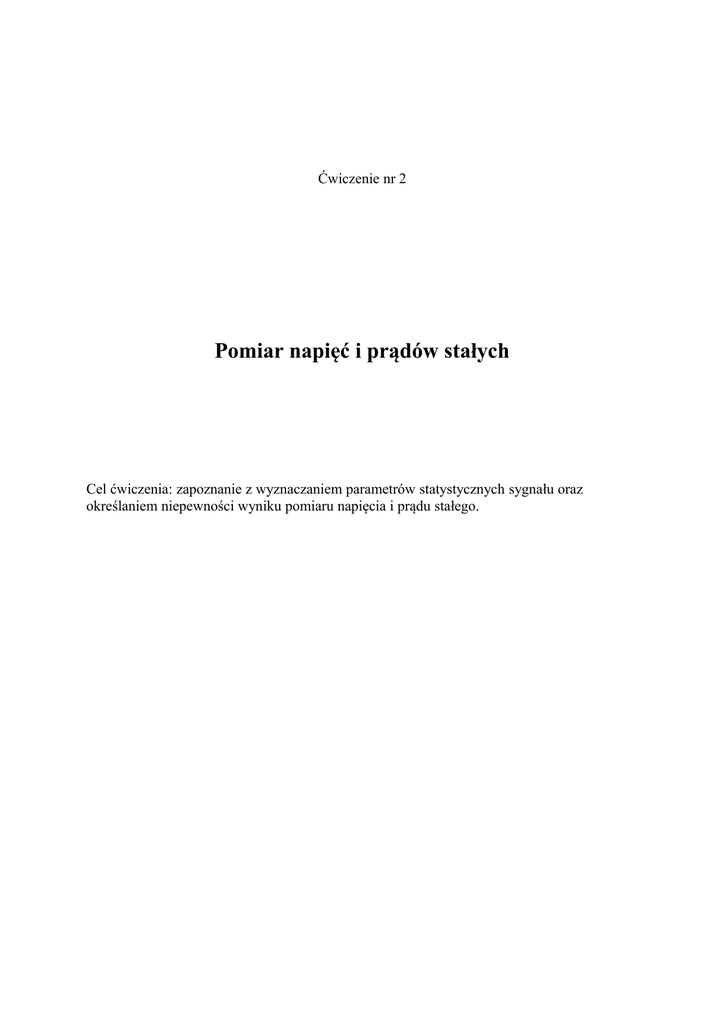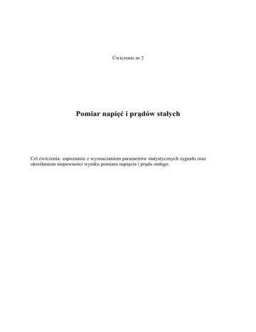 Ćwiczenie nr 2 Pomiar napięć i prądów stałych Cel ćwiczenia: zapoznanie z wyznaczaniem parametrów statystycznych sygnału oraz określaniem niepewności wyniku pomiaru napięcia i prądu stałego. 1. Pomiary wielokrotne Pomiary wielokrotne wykonujemy w celu otrzymania wyników opisujących badane zjawisko. Można wymienić następujące sytuacje gdzie mamy do czynienia z pomiarami wielokrotnymi: - mierzona wielkość jest stała w czasie wykonywania pomiarów jednak na skutek przypadkowych i niemożliwych do określenia zjawisk (np. zmiany badanego obiektu, parametrów przyrządów pomiarowych, wpływu otoczenia) wyniki uzyskane z kolejnych pomiarów różnią się między sobą. Celem tego pomiaru jest określenie błędów przypadkowych i wyznaczenie niepewności pomiaru, - mierzona wielkość nie jest w czasie wykonywania pomiarów i ulega zmianom w sposób przypadkowy. Pomiary mają na celu wyznaczenie parametrów statystycznych badanej wielkości takich jak: wartość średnia, odchylenie standardowe, wartości graniczne, - mierzone są parametrów wielu obiektów o podobnych właściwościach różniące się w sposób przypadkowy między sobą. Pomiary wykonywane są w celu oszacowania parametrów całej serii na podstawie zbadanej określonej próby. 2. Niepewność pomiaru 0 Teoria niepewności przyjmuje losowy model niedokładności. Wartość prawdziwa x wielkości mierzonej jest równa wartości oczekiwanej zmiennej losowej: 0 x E ( xˆ ) (1) Dla skończonej liczby pomiarów estymatą wartości oczekiwanej jest średnia arytmetyczna x : x 1 n xi n i 1 (2) Miarą niedokładności pomiaru jest niepewność u pomiaru wyznaczona metodami typu A oraz typu B. Niepewność standardową szacowaną metodą typu A tj. uA określa estymata odchylenia standardowego średniej arytmetycznej serii n wyników pomiarów: uA n 1 ( xi x ) 2 n(n 1) i 1 (3) Niepewność rozszerzona jest równa: U A k ( p )u A gdzie: p - poziom ufności k(p) - współczynnik rozszerzenia. Jeśli p=0,99 to k(p)=3 a jeśli p=0,95 to k(p)=2. (4) Niepewność szacowaną metodą typu B można wyrazić następująco: - dla prostokątnego rozkładu gęstości prawdopodobieństwa (np. pomiary woltomierzem cyfrowym): x u B max (5) 3 dla trójkątnego rozkładu gęstości prawdopodobieństwa (np. pomiary częstościomierzem cyfrowym): x u B max (6) 6 gdzie: maxx jest błędem maksymalnym (granicznym) przyrządu lub przetwornika (np. mostka tensometrycznego). Wielkość tą można wyznaczyć na podstawie danych umieszczonych w dokumentacji przyrządu. Niepewność standardową wypadkową (łączną) określa zależność: - u c u A2 u B2 (7) 3. Opis stanowiska R AD589 DMM RS232C V komputer PC Rys.1. Uproszczony schemat stanowiska pomiarowego Stanowisko wyposażone jest w multimetr cyfrowy. Multimetr w ćwiczeniu używany jest na zakresie 10V napięcia stałego. W zależności od konfiguracji stanowiska zamiennie zamiast przedstawionego na schemacie układu z diodą Band-Gap AD589 (1,2V) może zostać użyte ogniwo wzorcowe. Multimetr współpracuje z komputerem za pomocą interfejsu a do tworzenia oprogramowania wykorzystywane jest środowisko LabView. Do programowania przyrządu wykorzystywany jest język SCPI. Dokumentacja z poleceniami sterującymi multimetrem będzie dostępna w trakcie wykonywania ćwiczenia. W zależności od konfiguracji stanowiska może zostać użyty multimetr wyposażony w interfejs komunikacyjny RS232C lub USB. 4. Wykonanie ćwiczenia 4.1. Uruchomić komputer oraz środowisko LabVIEW. 4.1. Załączyć zasilanie multimetru, skonfigurować do właściwego pomiaru (funkcja, zakres pomiarowy). 4.2. Dołączyć do właściwych zacisków multimetru badane źródło napięcia. Sprawdzić poprawność wyświetlanego wyniku. 4.3. W środowisku LabVIEW utworzyć nowy plik (Blank VI). Zapisać plik pod swoją nazwą we wskazanym przez prowadzącego miejscu (domyślnie folder Student) nadając mu nazwę w postaci rok_grupa_nazwisko (np. 2015_A_Kowalski.vi). Po każdej pozytywnej modyfikacji programu zaleca się go zapisywać. 4.4. Z palety Express wybrać Instrument Assistant. Skonfigurować port wejściowy zgodnie z ustawieniami multimetru w zależności od użytego interfejsu komunikacyjnego. Dodać kolejne kroki obsługi multimetru, tak aby multimetr został skonfigurowany do pomiaru napięcia stałego z domyślnym parametrami i wykonał pomiar tego napięcia a następnie wartość napięcia została odczytana i przetworzona do postaci liczbowej (Numeric). Nazwać wartość wyjściową (Token) jako wynik pomiaru. 5.3. W tworzonej aplikacji dodać element pokazujący aktualnie zmierzoną wartość (indicator) oraz wyświetlający dotychczas zmierzone wartości na wykresie (waveform chart). Dostosować zakresy i rozdzielczości aby wynik był wyświetlany z rozdzielczością z jaką mierzony jest przez multimetr. Opisać wyświetlane wartości (zamiast etykiety label nadać odpowiednią nazwę – dotyczy to każdego umieszczonego na panelu elementu). 5.4. Użyć struktury While Loop tak, aby program był zatrzymywany po naciśnięciu klawisza STOP na panelu. Dodać element wskazujący, który pomiar jest wykonywany od momentu uruchomienia programu. Sprawdzić działanie uruchamiając kilkukrotnie program. Zaobserwować jak zachowuje się multimetr w trakcie pomiaru. 5.5. W razie potrzeby z palety Time and Dialog dodać element taktujący pętlę (Waiting until next multiple) i dodać wartość opóźnienia odpowiadającą jednej sekundzie. 5.6. Rozbudować program o wyświetlanie średniej liczonej na bieżąco. Wynik ma być wyświetlany na wskaźniku (indicator) oraz pokazywany na wykresie (waveform chart). 5.7. Dodać algorytm wyliczający odchylenie standardowe pomiaru jako pierwiastek z wariancji (2). 2 1 N 1 2 1 N 1 xi xi N 1 i 0 N i 0 2 (1) gdzie: N - liczba próbek xi - wartość kolejnej próbki 5.8. Z wyznaczonej wartości odchylenia standardowego wyliczyć wartość niepewności typu A po