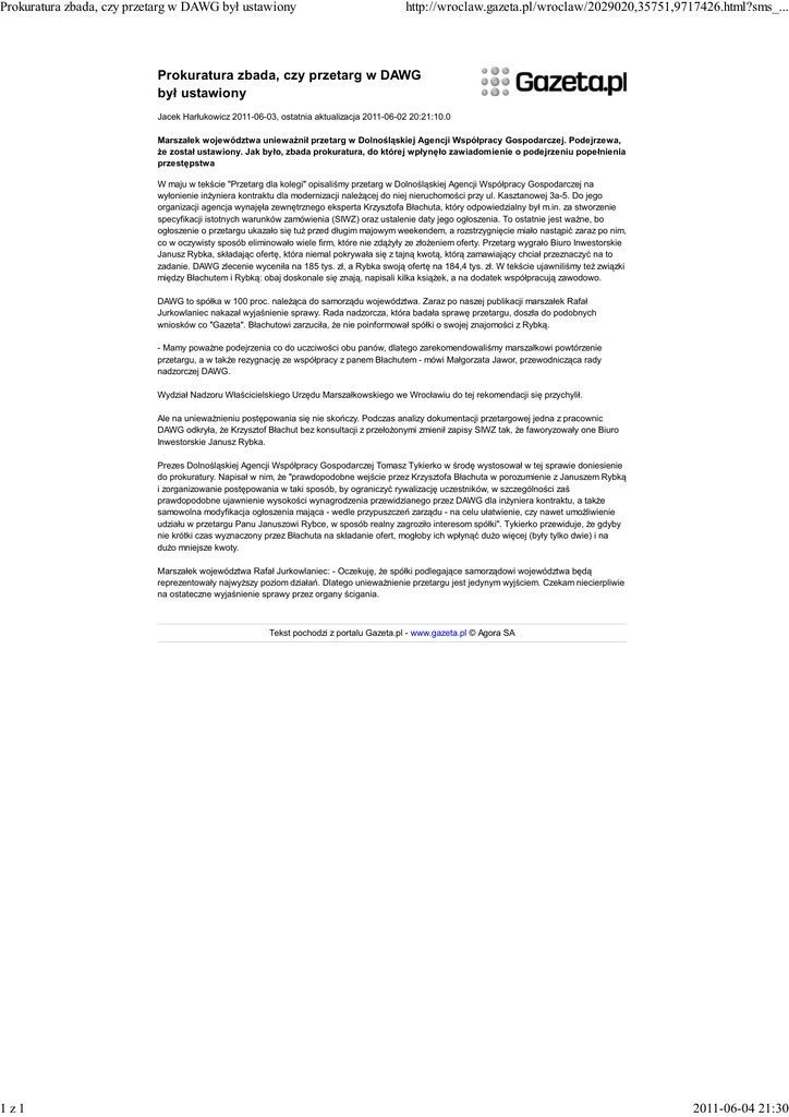 Prokuratura zbada, czy przetarg w DAWG był ustawiony 1z1 http://wroclaw.gazeta.pl/wroclaw/2029020,35751,9717426.html?sms_... Prokuratura zbada, czy przetarg w DAWG był ustawiony Jacek Harłukowicz 2011-06-03, ostatnia aktualizacja 2011-06-02 20:21:10.0 Marszałek województwa unieważnił przetarg w Dolnośląskiej Agencji Współpracy Gospodarczej. Podejrzewa, że został ustawiony. Jak było, zbada prokuratura, do której wpłynęło zawiadomienie o podejrzeniu popełnienia przestępstwa W maju w tekście "Przetarg dla kolegi" opisaliśmy przetarg w Dolnośląskiej Agencji Współpracy Gospodarczej na wyłonienie inżyniera kontraktu dla modernizacji należącej do niej nieruchomości przy ul. Kasztanowej 3a-5. Do jego organizacji agencja wynajęła zewnętrznego eksperta Krzysztofa Błachuta, który odpowiedzialny był m.in. za stworzenie specyfikacji istotnych warunków zamówienia (SIWZ) oraz ustalenie daty jego ogłoszenia. To ostatnie jest ważne, bo ogłoszenie o przetargu ukazało się tuż przed długim majowym weekendem, a rozstrzygnięcie miało nastąpić zaraz po nim, co w oczywisty sposób eliminowało wiele firm, które nie zdążyły ze złożeniem oferty. Przetarg wygrało Biuro Inwestorskie Janusz Rybka, składając ofertę, która niemal pokrywała się z tajną kwotą, którą zamawiający chciał przeznaczyć na to zadanie. DAWG zlecenie wyceniła na 185 tys. zł, a Rybka swoją ofertę na 184,4 tys. zł. W tekście ujawniliśmy też związki między Błachutem i Rybką: obaj doskonale się znają, napisali kilka książek, a na dodatek współpracują zawodowo. DAWG to spółka w 100 proc. należąca do samorządu województwa. Zaraz po naszej publikacji marszałek Rafał Jurkowlaniec nakazał wyjaśnienie sprawy. Rada nadzorcza, która badała sprawę przetargu, doszła do podobnych wniosków co "Gazeta". Błachutowi zarzuciła, że nie poinformował spółki o swojej znajomości z Rybką. - Mamy poważne podejrzenia co do uczciwości obu panów, dlatego zarekomendowaliśmy marszałkowi powtórzenie przetargu, a w także rezygnację ze współpracy z panem Błachutem - mówi Małgorzata Jawor, przewodnicząca rady nadzorczej DAWG. Wydział Nadzoru Właścicielskiego Urzędu Marszałkowskiego we Wrocławiu do tej rekomendacji się przychylił. Ale na unieważnieniu postępowania się nie skończy. Podczas analizy dokumentacji przetargowej jedna z pracownic DAWG odkryła, że Krzysztof Błachut bez konsultacji z przełożonymi zmienił zapisy SIWZ tak, że faworyzowały one Biuro Inwestorskie Janusz Rybka. Prezes Dolnośląskiej Agencji Współpracy Gospodarczej Tomasz Tykierko w środę wystosował w tej sprawie doniesienie do prokuratury. Napisał w nim, że "prawdopodobne wejście przez Krzysztofa Błachuta w porozumienie z Januszem Rybką i zorganizowanie postępowania w taki sposób, by ograniczyć rywalizację uczestników, w szczególności zaś prawdopodobne ujawnienie wysokości wynagrodzenia przewidzianego przez DAWG dla inżyniera kontraktu, a także samowolna modyfikacja ogłoszenia mająca - wedle przypuszczeń zarządu - na celu ułatwienie, czy nawet umożliwienie udziału w przetargu Panu Januszowi Rybce, w sposób realny zagroziło interesom spółki". Tykierko przewiduje, że gdyby nie krótki czas wyznaczony przez Błachuta na składanie ofert, mogłoby ich wpłynąć dużo więcej (były tylko dwie) i na dużo mniejsze kwoty. Marszałek województwa Rafał Jurkowlaniec: - Oczekuję, że spółki podlegające samorządowi województwa będą reprezentowały najwyższy poziom działań. Dlatego unieważnienie przetargu jest jedynym wyjściem. Czekam niecierpliwie na ostateczne wyjaśnienie sprawy przez organy ścigania. Tekst pochodzi z portalu Gazeta.pl - www.gazeta.pl © Agora SA 2011-06-04 21:30