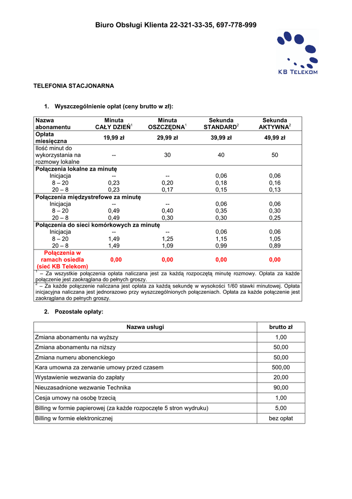 Biuro Obsługi Klienta 22-321-33-35, 697-778-999 TELEFONIA STACJONARNA 1. Wyszczególnienie opłat (ceny brutto w zł): Nazwa Minuta Minuta abonamentu CAŁY DZIEŃ1 OSZCZĘDNA1 Opłata 19,99 zł 29,99 zł miesięczna Ilość minut do wykorzystania na -30 rozmowy lokalne Połączenia lokalne za minutę Inicjacja --8 – 20 0,23 0,20 20 – 8 0,23 0,17 Połączenia międzystrefowe za minutę Inicjacja --8 – 20 0,49 0,40 20 – 8 0,49 0,30 Połączenia do sieci komórkowych za minutę Inicjacja --8 – 20 1,49 1,25 20 – 8 1,49 1,09 Połączenia w ramach osiedla 0,00 0,00 (sieć KB Telekom) Sekunda STANDARD2 Sekunda AKTYWNA2 39,99 zł 49,99 zł 40 50 0,06 0,18 0,15 0,06 0,16 0,13 0,06 0,35 0,30 0,06 0,30 0,25 0,06 1,15 0,99 0,06 1,05 0,89 0,00 0,00 1 – Za wszystkie połączenia opłata naliczana jest za kaŜdą rozpoczętą minutę rozmowy. Opłata za kaŜde połączenie jest zaokrąglana do pełnych groszy. 2 – Za kaŜde połączenie naliczana jest opłata za kaŜdą sekundę w wysokości 1/60 stawki minutowej. Opłata inicjacyjna naliczana jest jednorazowo przy wyszczególnionych połączeniach. Opłata za kaŜde połączenie jest zaokrąglana do pełnych groszy. 2. Pozostałe opłaty: Nazwa usługi brutto zł Zmiana abonamentu na wyŜszy 1,00 Zmiana abonamentu na niŜszy 50,00 Zmiana numeru abonenckiego 50,00 Kara umowna za zerwanie umowy przed czasem 500,00 Wystawienie wezwania do zapłaty 20,00 Nieuzasadnione wezwanie Technika 90,00 Cesja umowy na osobę trzecią 1,00 Billing w formie papierowej (za kaŜde rozpoczęte 5 stron wydruku) 5,00 Billing w formie elektronicznej bez opłat