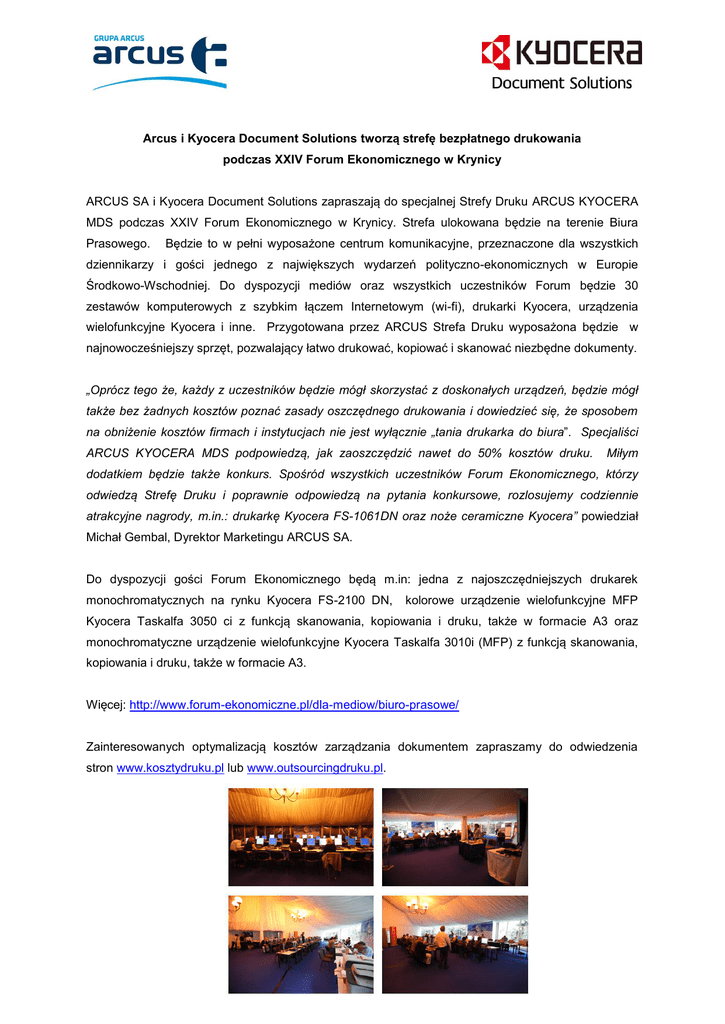 Arcus i Kyocera Document Solutions tworzą strefę bezpłatnego drukowania podczas XXIV Forum Ekonomicznego w Krynicy ARCUS SA i Kyocera Document Solutions zapraszają do specjalnej Strefy Druku ARCUS KYOCERA MDS podczas XXIV Forum Ekonomicznego w Krynicy. Strefa ulokowana będzie na terenie Biura Prasowego. Będzie to w pełni wyposażone centrum komunikacyjne, przeznaczone dla wszystkich dziennikarzy i gości jednego z największych wydarzeń polityczno-ekonomicznych w Europie Środkowo-Wschodniej. Do dyspozycji mediów oraz wszystkich uczestników Forum będzie 30 zestawów komputerowych z szybkim łączem Internetowym (wi-fi), drukarki Kyocera, urządzenia wielofunkcyjne Kyocera i inne. Przygotowana przez ARCUS Strefa Druku wyposażona będzie w najnowocześniejszy sprzęt, pozwalający łatwo drukować, kopiować i skanować niezbędne dokumenty. „Oprócz tego że, każdy z uczestników będzie mógł skorzystać z doskonałych urządzeń, będzie mógł także bez żadnych kosztów poznać zasady oszczędnego drukowania i dowiedzieć się, że sposobem na obniżenie kosztów firmach i instytucjach nie jest wyłącznie „tania drukarka do biura”. Specjaliści ARCUS KYOCERA MDS podpowiedzą, jak zaoszczędzić nawet do 50% kosztów druku. Miłym dodatkiem będzie także konkurs. Spośród wszystkich uczestników Forum Ekonomicznego, którzy odwiedzą Strefę Druku i poprawnie odpowiedzą na pytania konkursowe, rozlosujemy codziennie atrakcyjne nagrody, m.in.: drukarkę Kyocera FS-1061DN oraz noże ceramiczne Kyocera” powiedział Michał Gembal, Dyrektor Marketingu ARCUS SA. Do dyspozycji gości Forum Ekonomicznego będą m.in: jedna z najoszczędniejszych drukarek monochromatycznych na rynku Kyocera FS-2100 DN, kolorowe urządzenie wielofunkcyjne MFP Kyocera Taskalfa 3050 ci z funkcją skanowania, kopiowania i druku, także w formacie A3 oraz monochromatyczne urządzenie wielofunkcyjne Kyocera Taskalfa 3010i (MFP) z funkcją skanowania, kopiowania i druku, także w formacie A3. Więcej: http://www.forum-ekonomiczne.pl/dla-mediow/biuro-prasowe/ Zainteresowanych optymalizacją kosztów zarządzania dokumentem zapraszamy do odwiedzenia stron www.kosztydruku.pl lub www.outsourcingdruku.pl. O GRUPIE ARCUS ARCUS SA jest jednym z największych na polskim rynku dostawców zintegrowanych systemów zarządzania dokumentem i korespondencją masową. ARCUS SA jest przedstawicielem Kyocera Document Solutions oraz Pitney Bowes w Polsce. ARCUS SA i spółki zależne: T-matic Systems SA oraz ARCUS Systemy Informatyczne Sp. z o.o. dostarczają również kompleksowe rozwiązania oraz usługi z zakresu telematyki i inteligentnych sieci, a także integracji rozwiązań ICT (technologie informacyjno-telekomunikacyjne). Czwartą spółką wchodzącą w skład GRUPY ARCUS jest DocuSoft Sp. z o.o. produkująca systemy do obiegu informacji. Do największych klientów GRUPY ARCUS należą banki, firmy ubezpieczeniowe, firmy z branży telekomunikacyjnej, operatorzy pocztowi i logistyczni oraz administracja publiczna na szczeblu centralnym i lokalnym. O KYOCERA Document Solutions Europe B.V. KYOCERA Document Solutions jest jednym z wiodących na świecie dostawców rozwiązań z zakresu zarządzaniem dokumentami. Zakres produktów i usług firmy obejmuje drukarki ECOSYS, niezawodne urządzenia wielofunkcyjne, wysokiej jakości materiały eksploatacyjne i szeroki zakres rozwiązań programowych i Managed Services Document (MDS). Oferta KYOCERA Document Solutions zawiera innowacyjne produkty z komponentami o długiej żywotności. Ich użytkownicy korzystają z niskiego całkowitego kosztu posiadania (TCO) rozwiązań oraz wysokiej wydajności w każdym miejscu pracy. Oferta rozwiązań i usługi Managed Document Services umożliwiają klientom zmniejszenie kosztów, pozytywny wpływ na środowisko oraz poprawę efektywności i niezawodności procesów biznesowych w tym samym czasie. Więcej informacji na stronie: www.kyoceradocumentsolutions.pl. KYOCERA Document Solutions Inc. jest spółką zależną firmy Kyocera Corporation, która w 2009 roku obchodziła swoją 50-ą rocznicę. Zajmująca 531 miejsce na liście 2000 największych światowych firm notowanych na giełdzie magazynu Forbes, Kyocera jest wiodącym producentem nowoczesnej ceramiki, komponentów elektronicznych, ogniw słonecznych i elektronicznego sprzętu biurowego. Długoterminową strategią wzrostu KYOCERA są działania wspierające sektory telekomunikacji, przetwarzanie informacji, ochrony środowiska oraz poprawy jakości życia. Kontakt dla mediów: Michał Gembal Dyrektor Marketingu ARCUS S.A. tel. (22) 53 60 900 e-mail: [email protected]