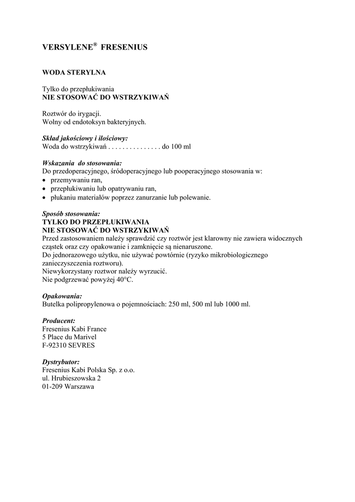 VERSYLENE® FRESENIUS WODA STERYLNA Tylko do przepłukiwania NIE STOSOWAĆ DO WSTRZYKIWAŃ Roztwór do irygacji. Wolny od endotoksyn bakteryjnych. Skład jakościowy i ilościowy: Woda do wstrzykiwań . . . . . . . . . . . . . . . do 100 ml Wskazania do stosowania: Do przedoperacyjnego, śródoperacyjnego lub pooperacyjnego stosowania w: przemywaniu ran, przepłukiwaniu lub opatrywaniu ran, płukaniu materiałów poprzez zanurzanie lub polewanie. Sposób stosowania: TYLKO DO PRZEPŁUKIWANIA NIE STOSOWAĆ DO WSTRZYKIWAŃ Przed zastosowaniem należy sprawdzić czy roztwór jest klarowny nie zawiera widocznych cząstek oraz czy opakowanie i zamknięcie są nienaruszone. Do jednorazowego użytku, nie używać powtórnie (ryzyko mikrobiologicznego zanieczyszczenia roztworu). Niewykorzystany roztwor należy wyrzucić. Nie podgrzewać powyżej 40°C. Opakowania: Butelka polipropylenowa o pojemnościach: 250 ml, 500 ml lub 1000 ml. Producent: Fresenius Kabi France 5 Place du Marivel F-92310 SEVRES Dystrybutor: Fresenius Kabi Polska Sp. z o.o. ul. Hrubieszowska 2 01-209 Warszawa